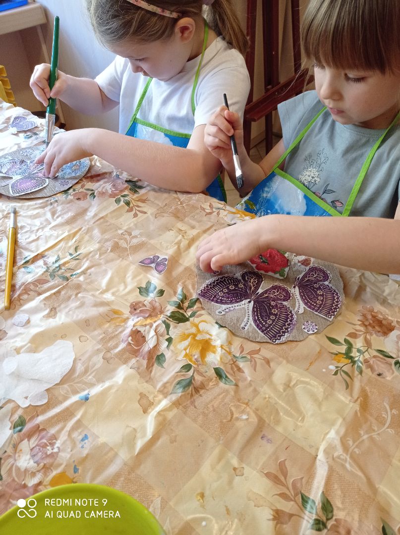 Dzieci z grupy V pod okiem pani Agnieszki poznały nową technikę zdobniczą decoupage.