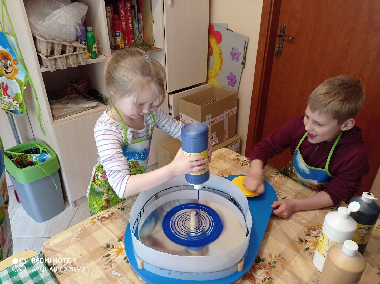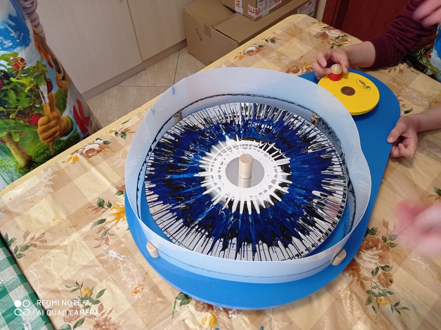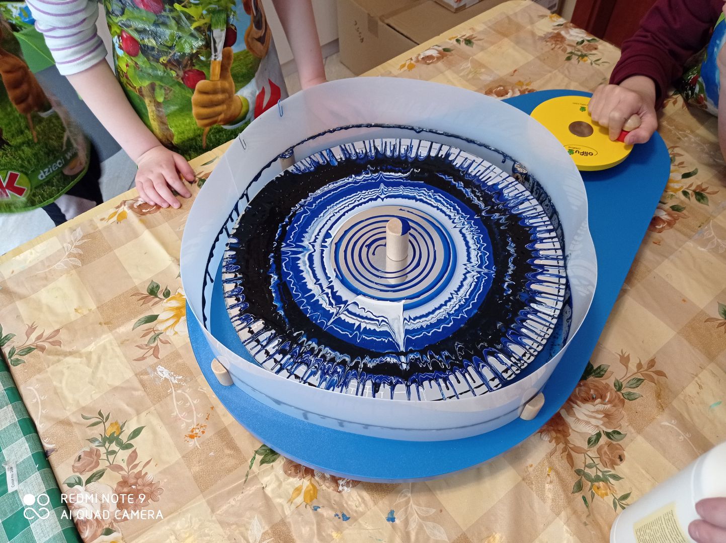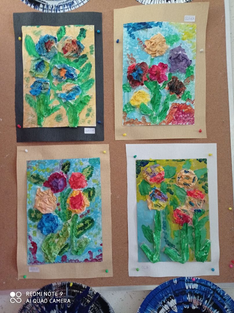 W tym tygodniu dzieci z grupy V malowały wcześniej przygotowane kwiaty, wykonane z tkaniny namoczonej w wikolu. Drugą pracę udało nam się zrobić dzięki zakupieniu przez Panią Dyrektor koła obrotowego do malowania. Powstały ciekawe abstrakcje. Rozpoczęliśmy również kolejną pracę dotyczącą kubizmu w sztuce - efekty do obejrzenia po następnych zajęciach.