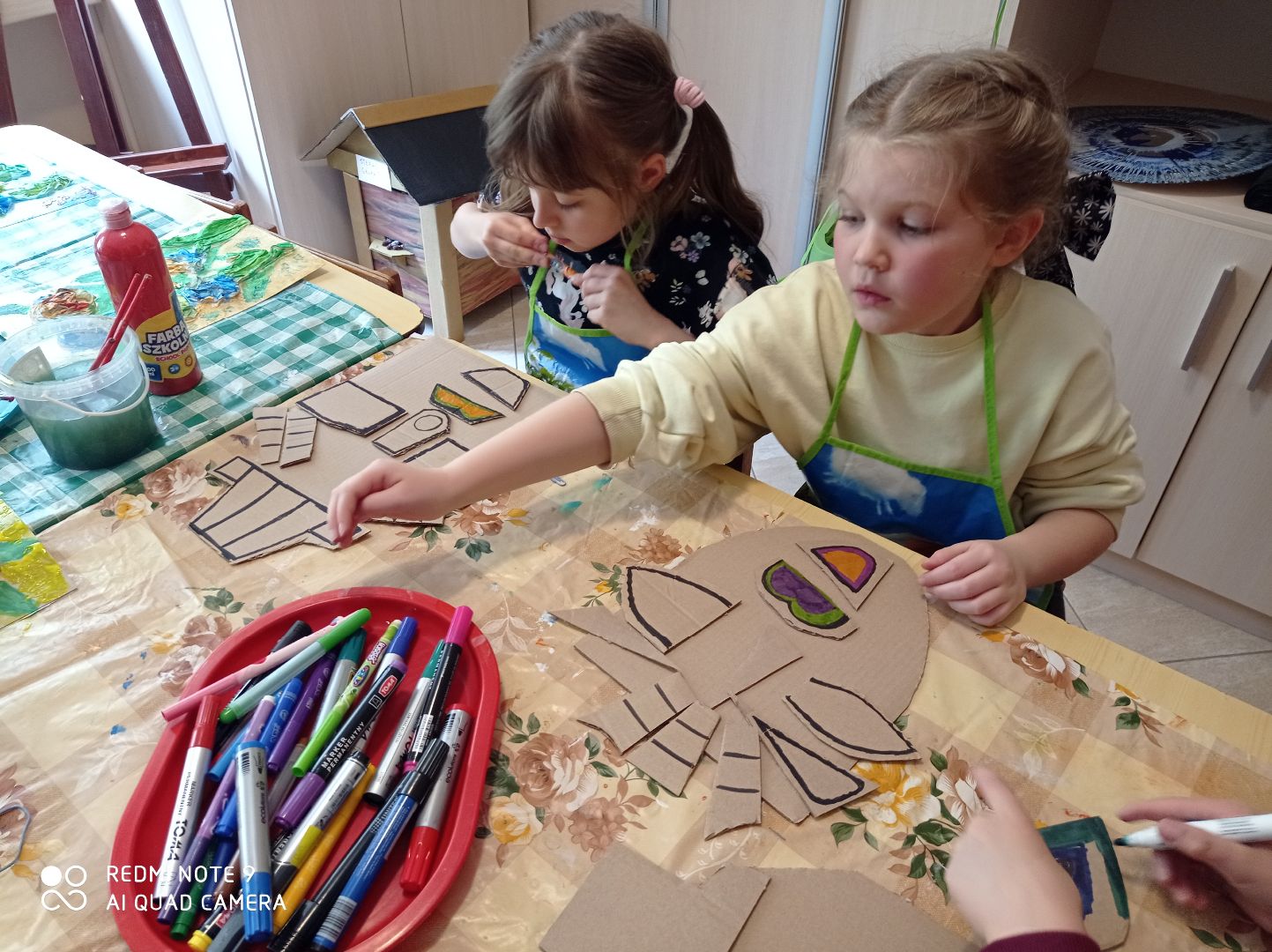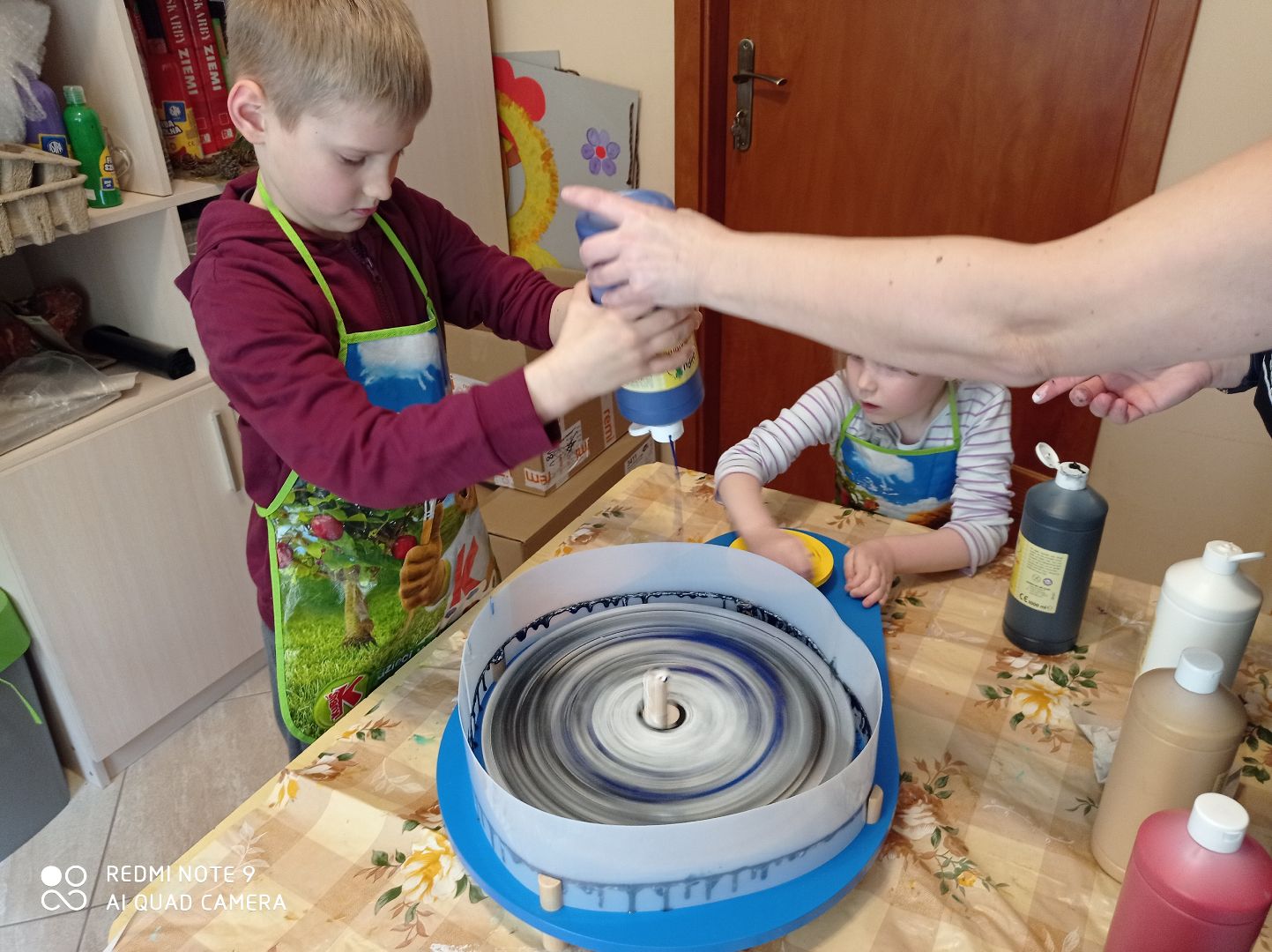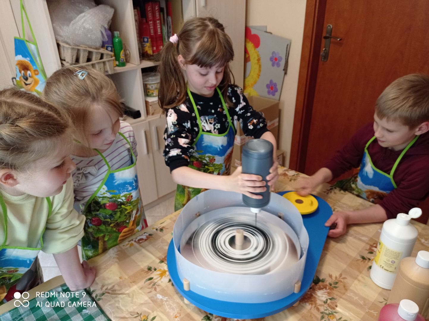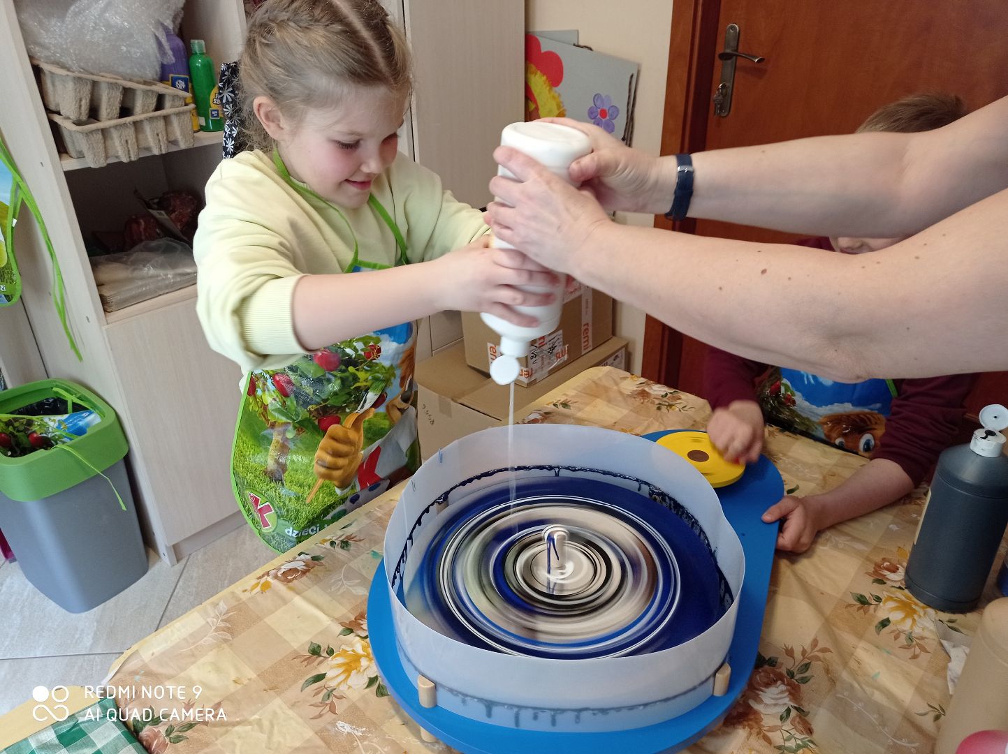 W tym tygodniu dzieci z grupy V malowały wcześniej przygotowane kwiaty, wykonane z tkaniny namoczonej w wikolu. Drugą pracę udało nam się zrobić dzięki zakupieniu przez Panią Dyrektor koła obrotowego do malowania. Powstały ciekawe abstrakcje. Rozpoczęliśmy również kolejną pracę dotyczącą kubizmu w sztuce - efekty do obejrzenia po następnych zajęciach.