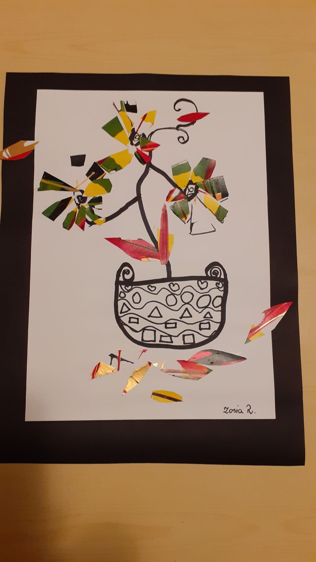 Pracę na kole plastycznym dzieci rozpoczęły od stworzenia kolorowych sów z plasteliny co było świetnym treningiem na usprawnianie palców po przerwie wakacyjnej. Kolejne spotkanie zaowocowało dwiema pracami: " Jesienny bukiet"- do zrobienia, której dzieci wykorzystały wcześniej przygotowane kolorowe kartki ( każde dziecko stworzyło własną kartkę przy użyciu koła kolorów i farb ) i czarne markery oraz "Kasztanowe ptaki" - kompozycja z wykorzystaniem drewnianych patyczków po lodach i materiału przyrodniczego.