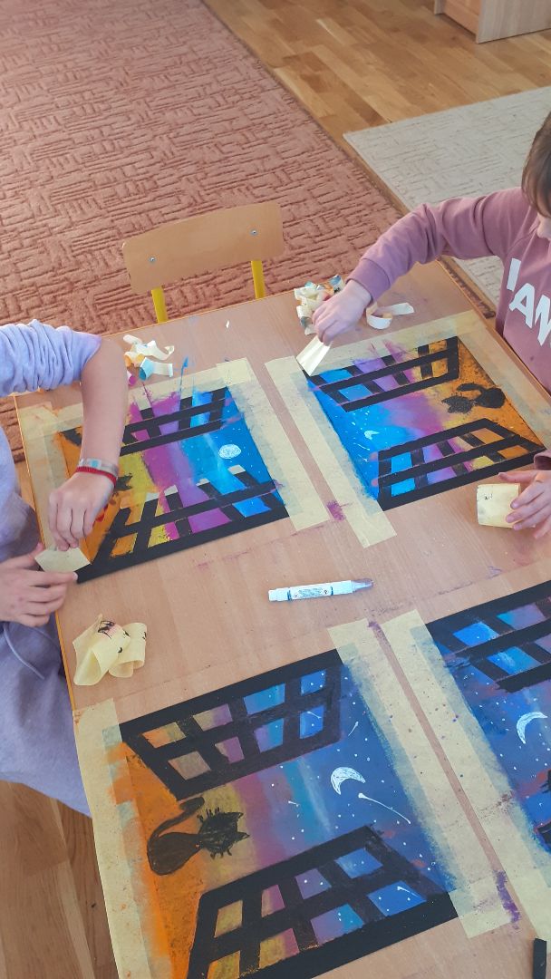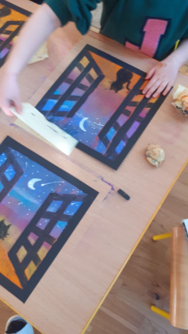 Dzieci z grupy Pani Eli wykonały ciekawą pracę. Podczas wykonywania zadania dzieci wykorzystały papierową taśmę malarską, suche pastele, czarny karton i korektor.