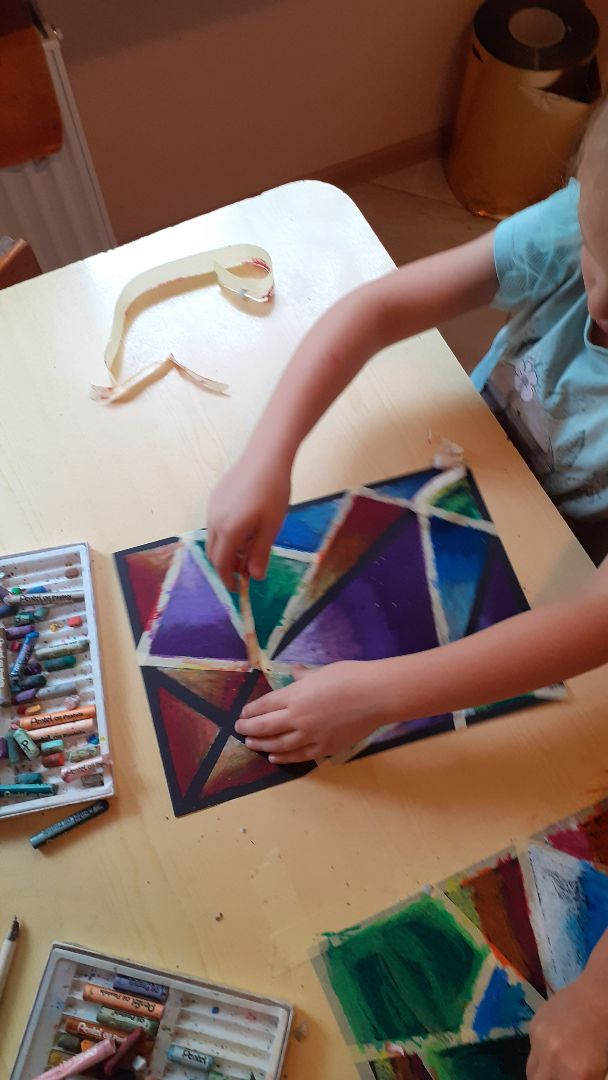 Dzieci wykonały pracę wykorzystując taśmę papierową, czarny karton i pastele olejne. Efekt końcowy uzyskano poprzez cieniowanie pasteli z użyciem wiszerów.