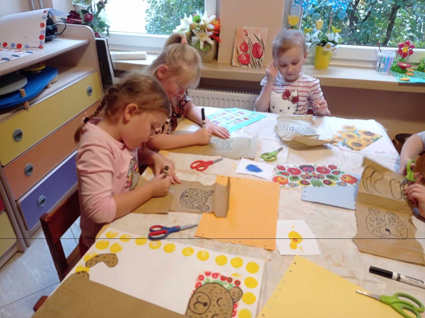 Kolejnym tematem pracy plastycznej na naszym kole był - śpiący miś. Dzieci  tapowały farbą , naklejały serwetki kolorowe, rysowały mazakami na szarym papierze i ręcznikach papierowych.