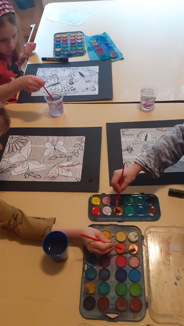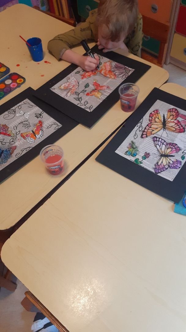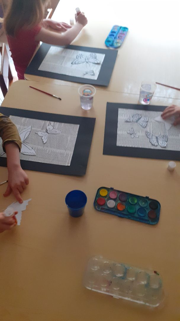 Dzieci wykonały pracę techniką mieszaną - malowały akwarelą na gazecie, rysowały markerem oraz naklejały szablony.