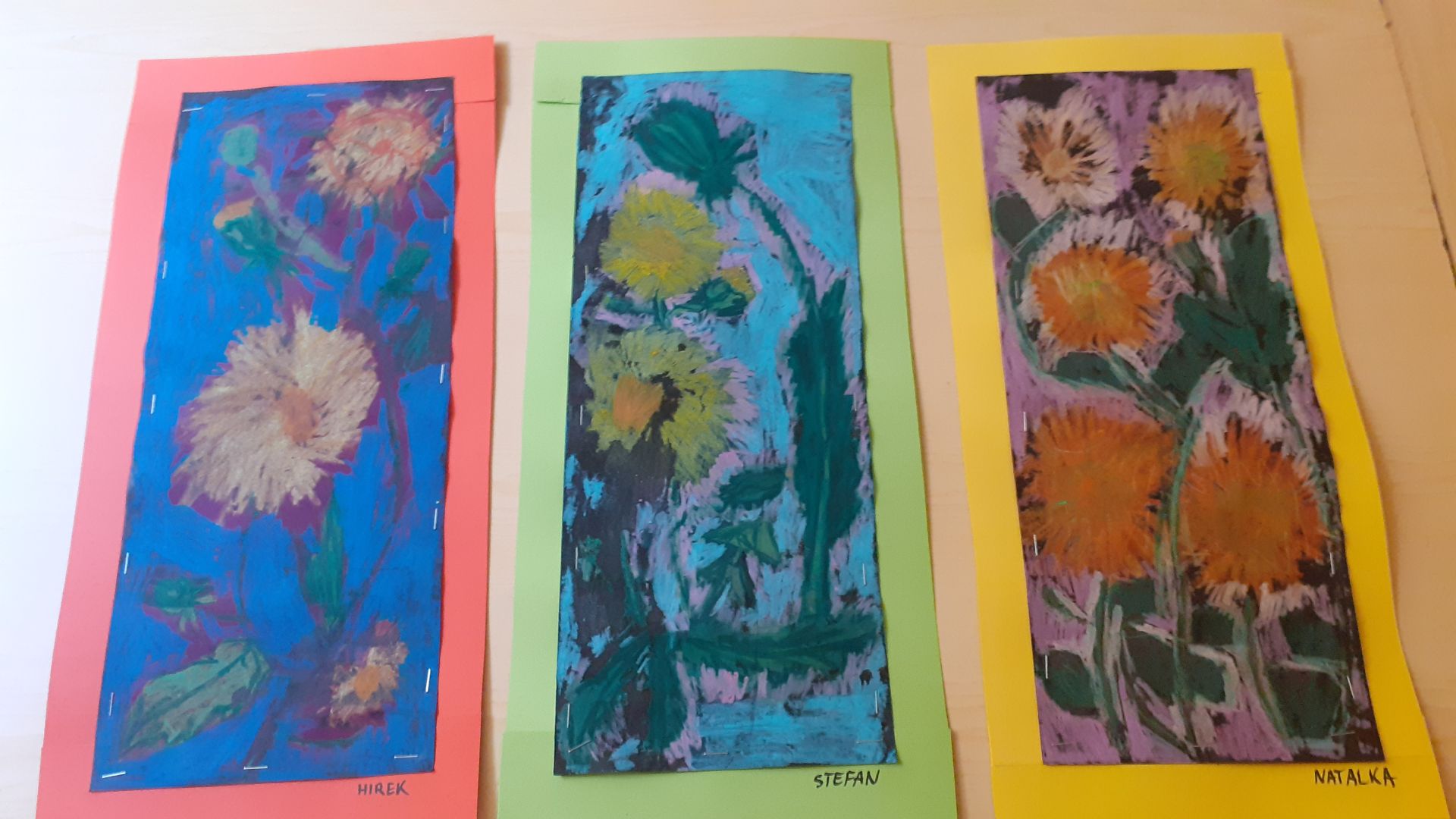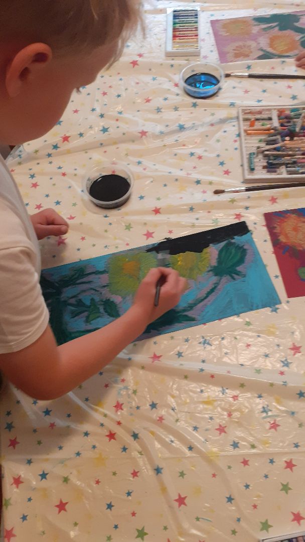 Na ostatnich zajęciach dzieci wykonały bardzo ciekawą pracę. Najpierw malowały pastelami olejnymi, potem wszystko zamalowały czarnym tuszem kreślarskim, a na koniec wszystko spłukano pod bieżącą wodą. Efekt był wspaniały.