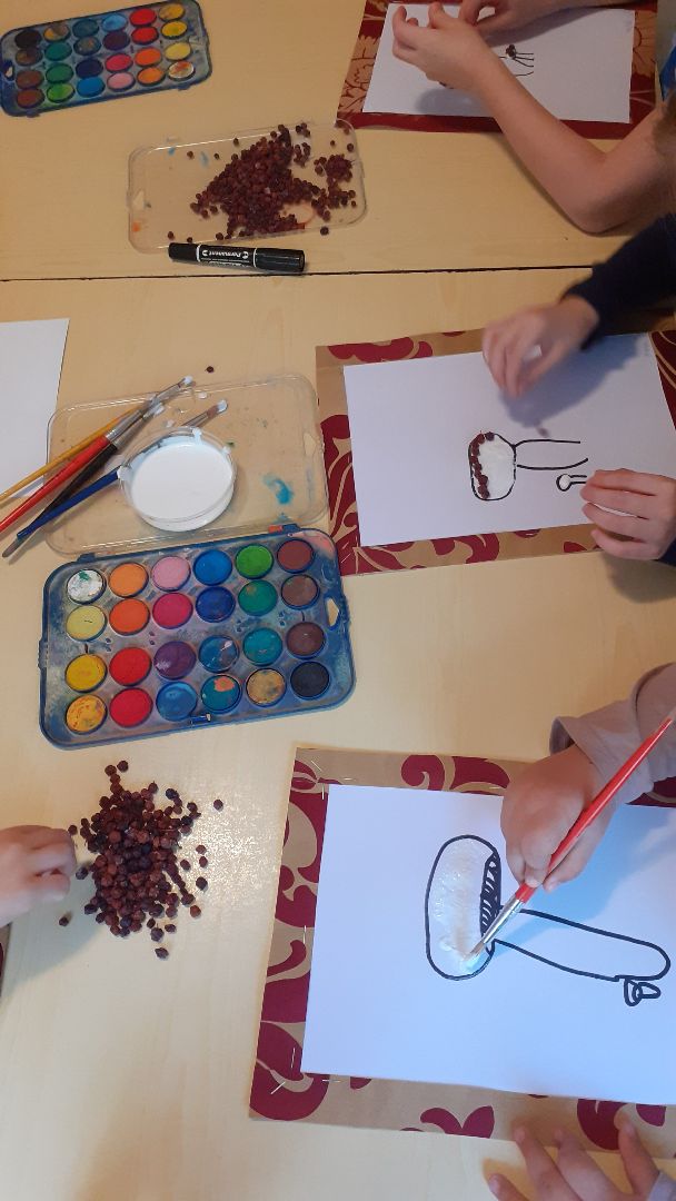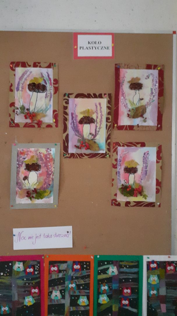 Podczas ostatnich zajęć dzieci wykonały jesienną pracę przedstawiającą grzyba we wrzosach. Do wykonania pracy wykorzystaliśmy kilka technik plastycznych: wyklejaliśmy suszoną jarzębiną, rysowaliśmy markerem, malowaliśmy pastelami olejnymi i akwarelami. Na koniec dodaliśmy materiał przyrodniczy w postaci liści i czerwonych owoców z różnych drzew ozdobnych i krzewów co nadało pracy efekt trójwymiarowości.