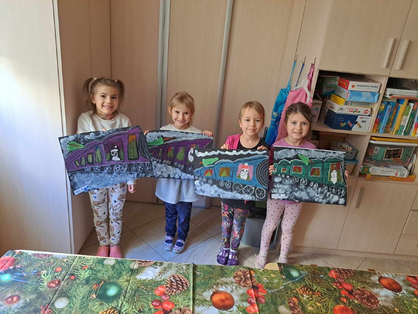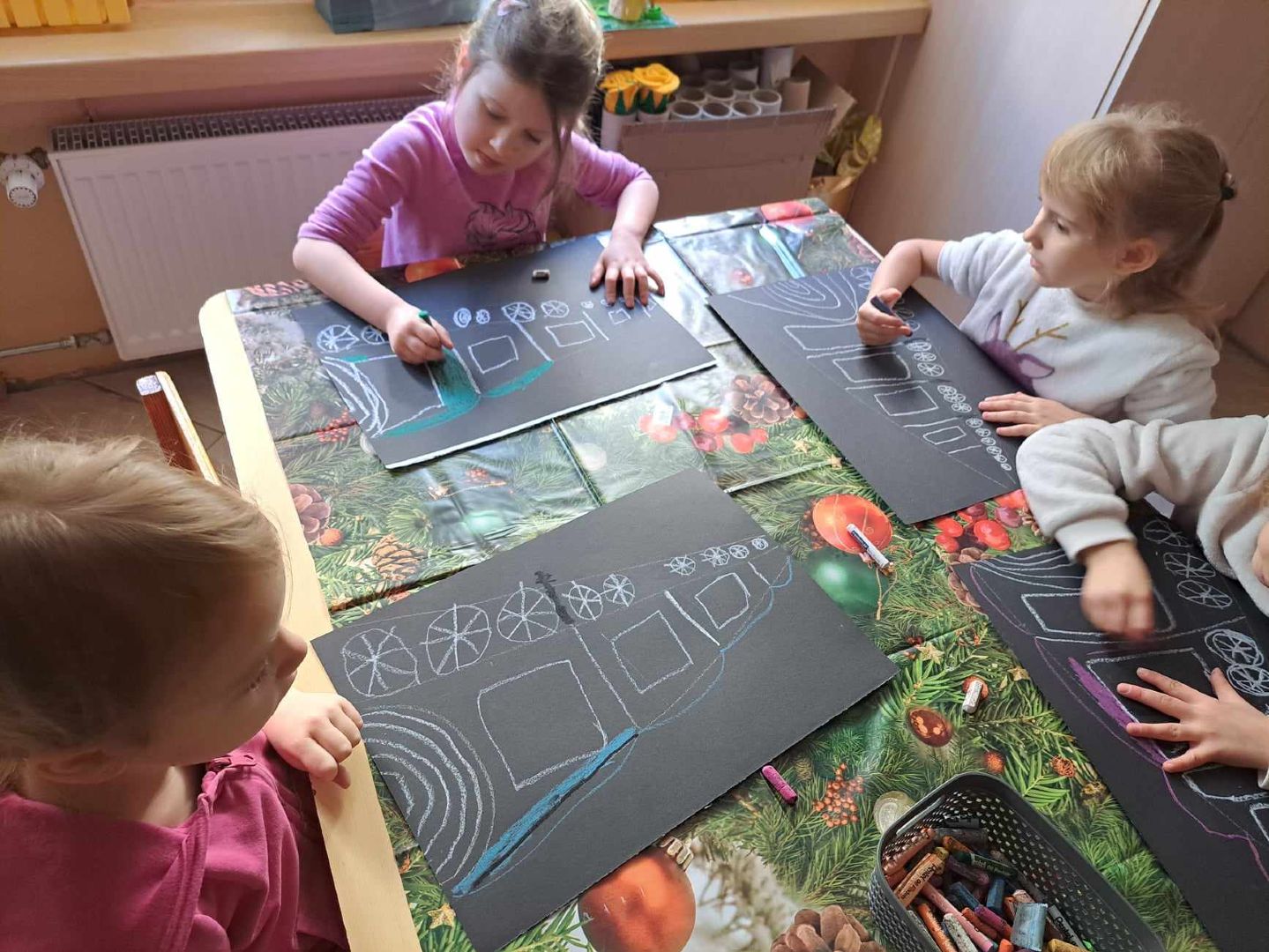 Na zajęciach dzieci rysowały pociąg Mikołaja pastelami olejnymi, oraz tapowały tło białą farbą akrylową.
