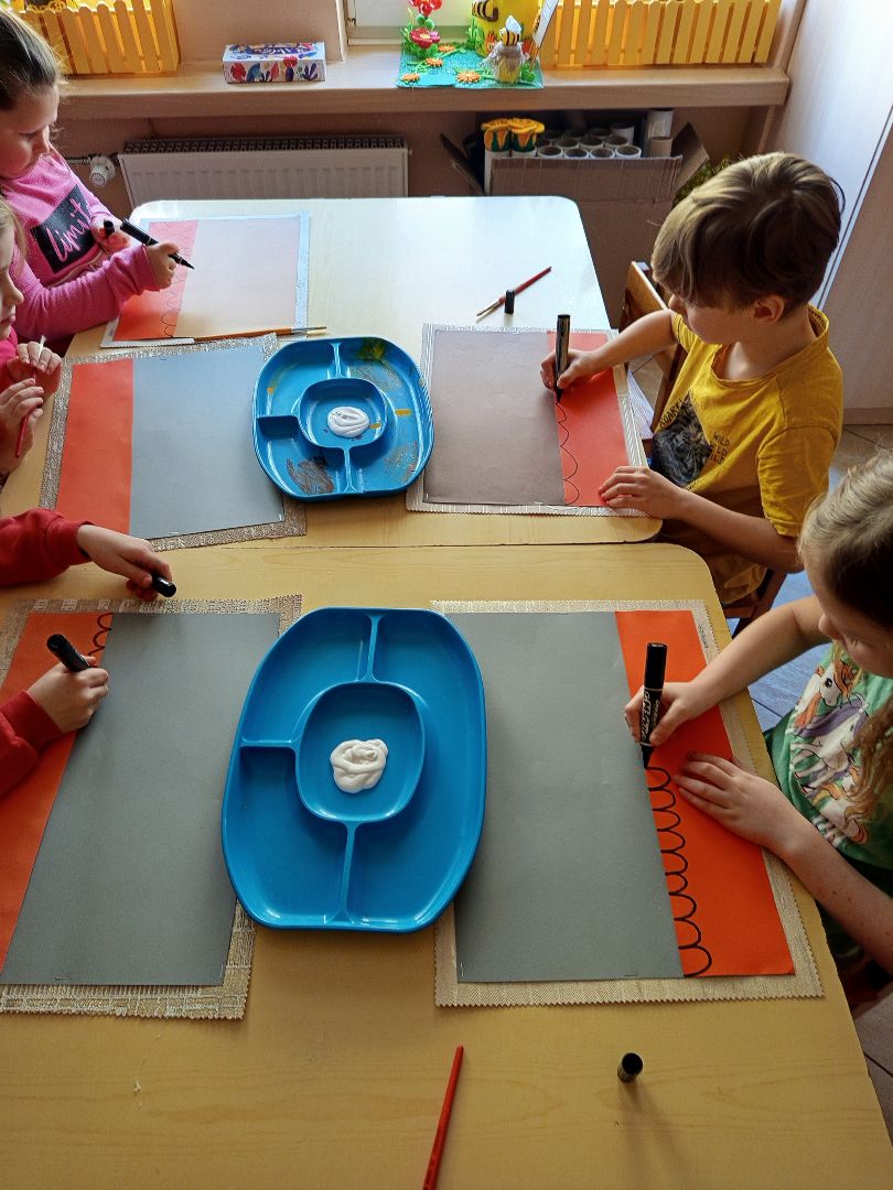 W środę wykonaliśmy pracę o tematyce zimowej pomimo, iż nie ma śniegu, Wykorzystaliśmy kolorowy karton, czarny marker, białą farbę plakatową, pocięte rolki po papierze toaletowym oraz klej wikol.
