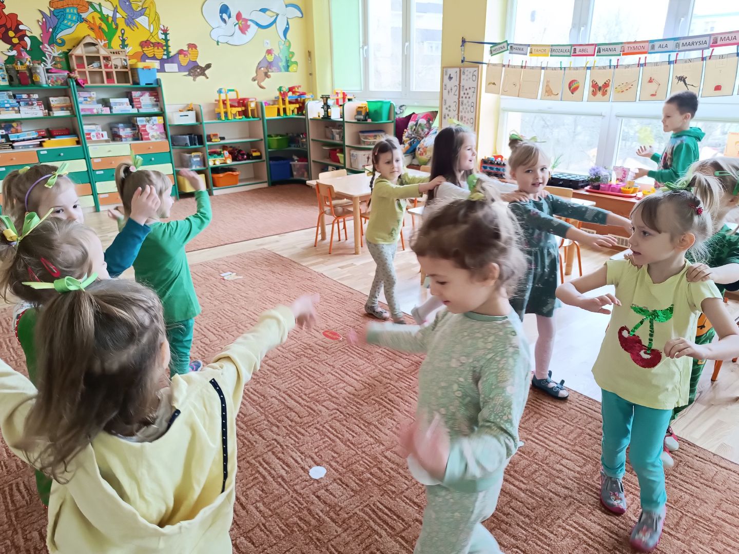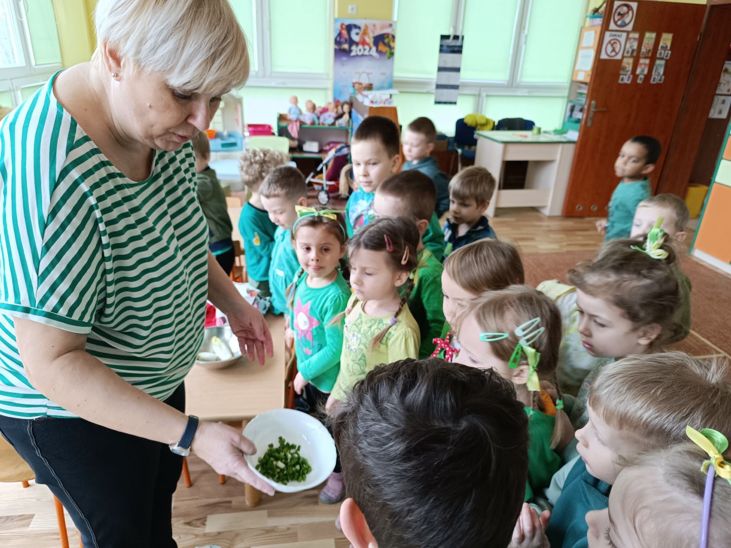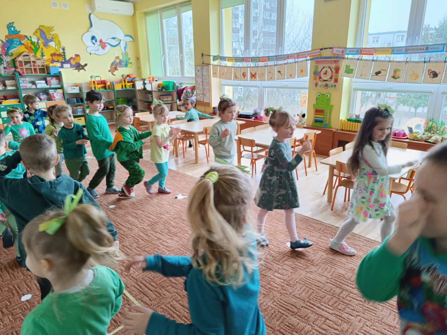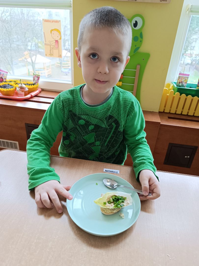 W tym tygodniu piątek to Dzień zielonego - dzieciaki ubrane na zielono zrobiły samodzielnie zielone kanapki - łódeczki - z cykorią, pastą i szczypiorkiem. Śniadanie zostało przygotowane przez wybranych z grupy kelnerów, którzy rozłożyli produkty i naczynia. Po śniadaniu odbyła się zielona gimnastyka i napisaliśmy wspólnie zieloną bajkę o zielonym smoku, dwóch zielonych gąsienicach i zielonej żabie. Na koniec odwiedziliśmy grupę I i II, które również świętowały dzień zielonego.