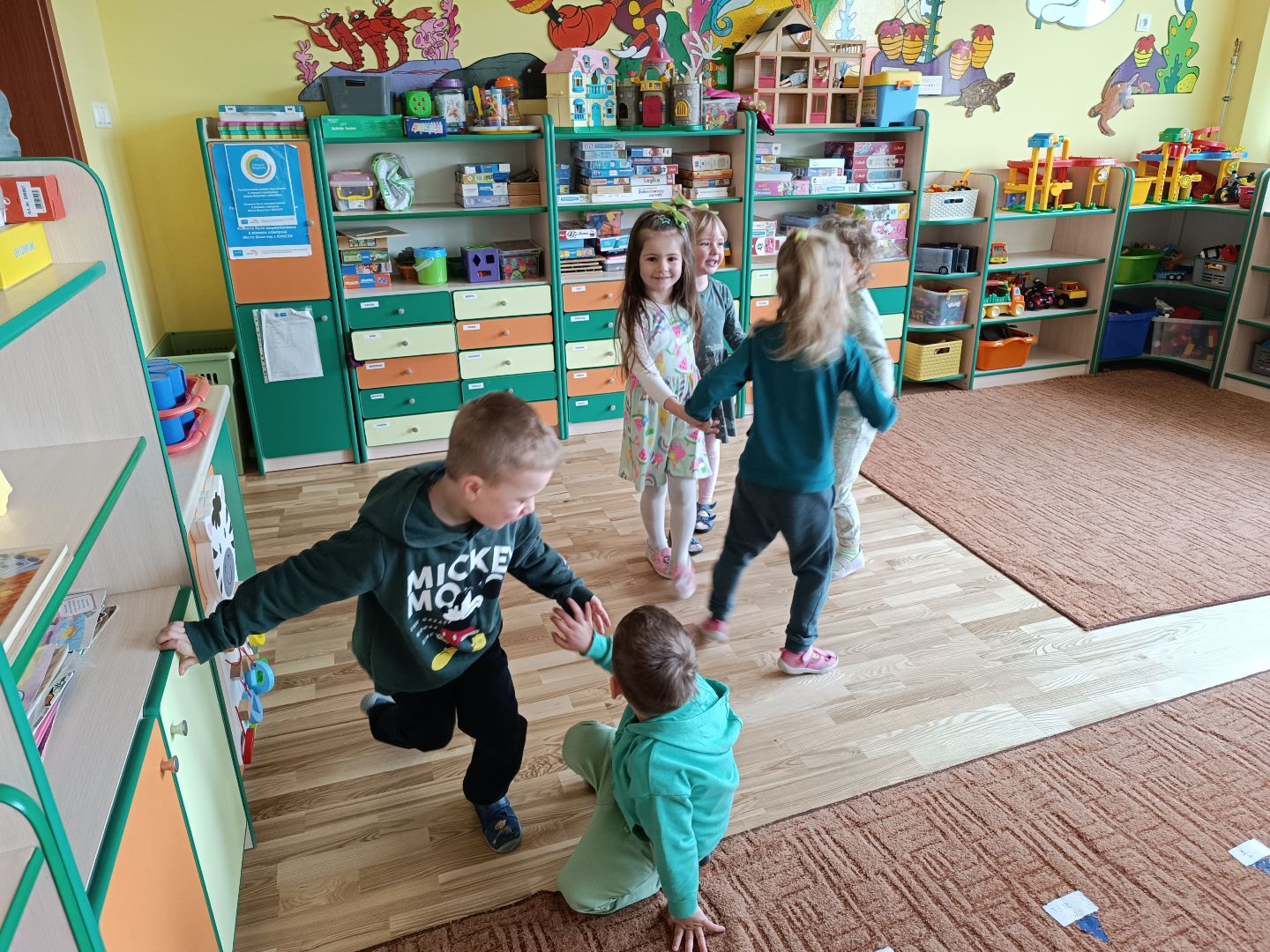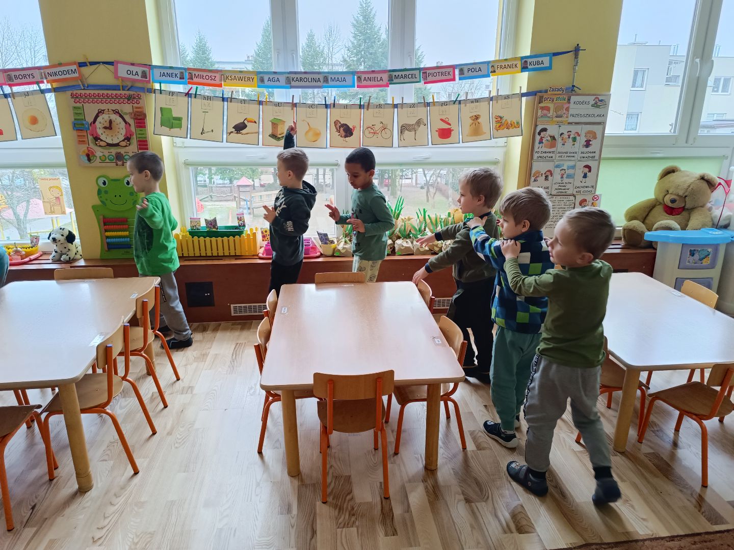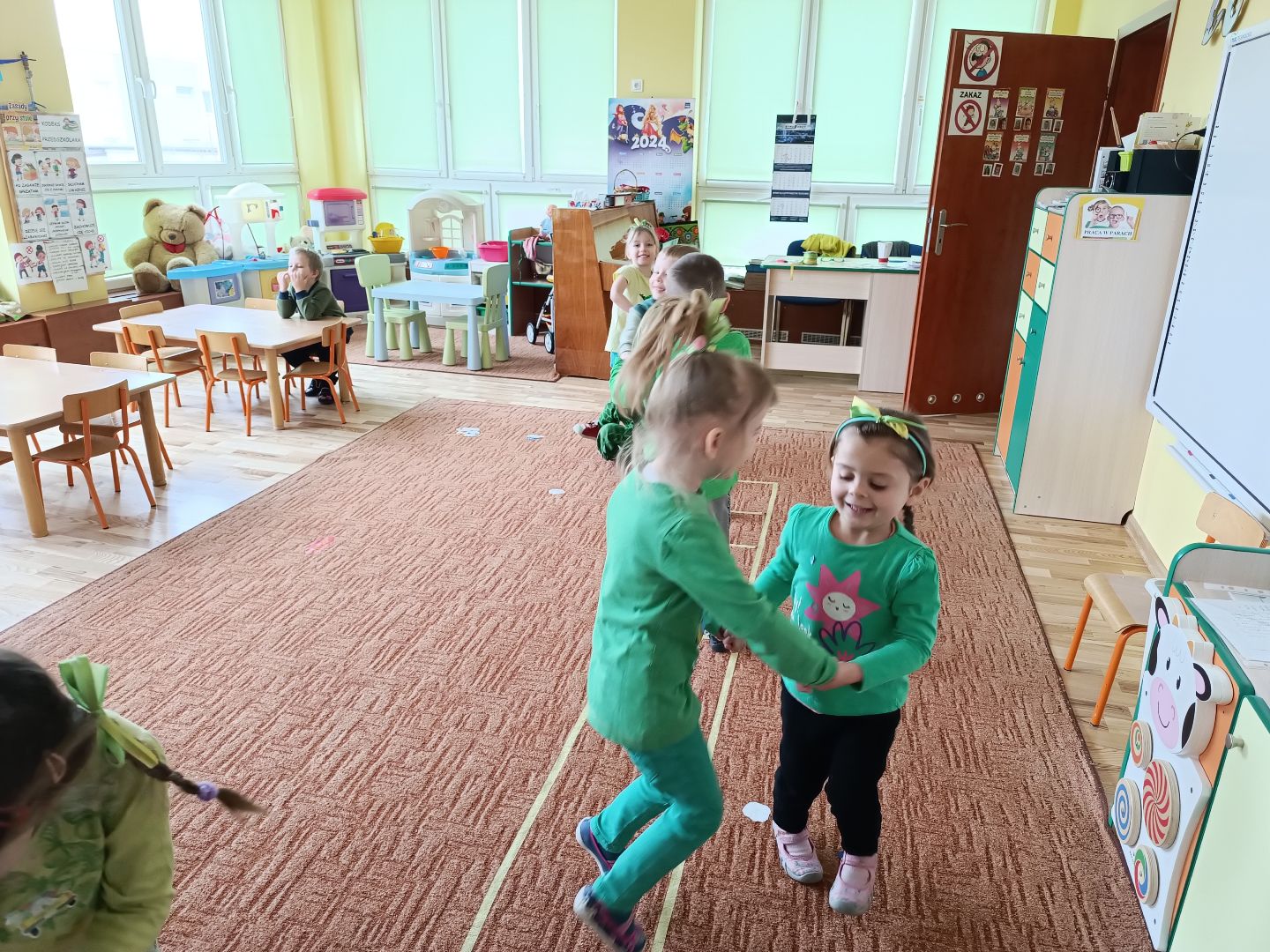 W tym tygodniu piątek to Dzień zielonego - dzieciaki ubrane na zielono zrobiły samodzielnie zielone kanapki - łódeczki - z cykorią, pastą i szczypiorkiem. Śniadanie zostało przygotowane przez wybranych z grupy kelnerów, którzy rozłożyli produkty i naczynia. Po śniadaniu odbyła się zielona gimnastyka i napisaliśmy wspólnie zieloną bajkę o zielonym smoku, dwóch zielonych gąsienicach i zielonej żabie. Na koniec odwiedziliśmy grupę I i II, które również świętowały dzień zielonego.