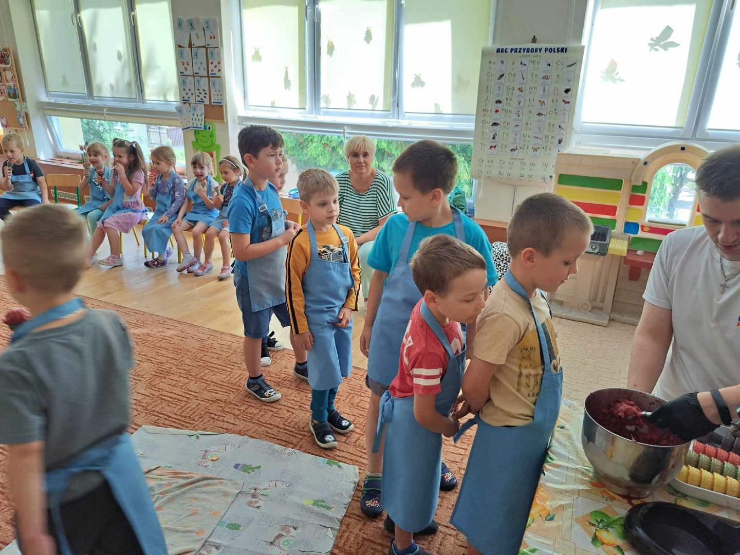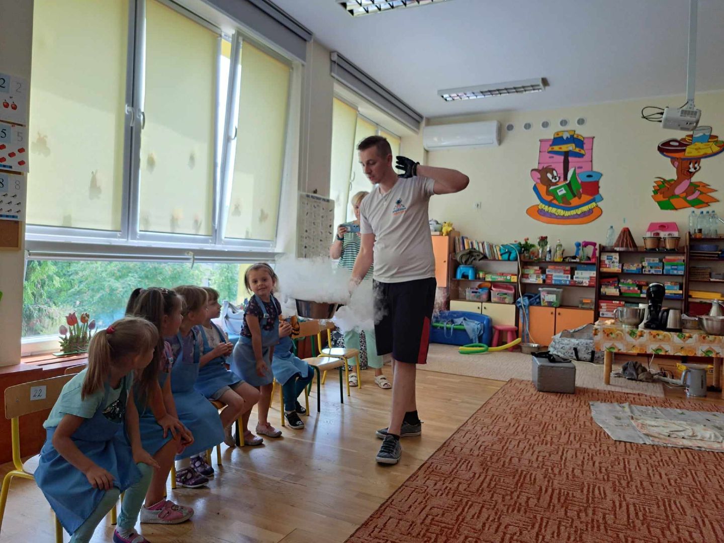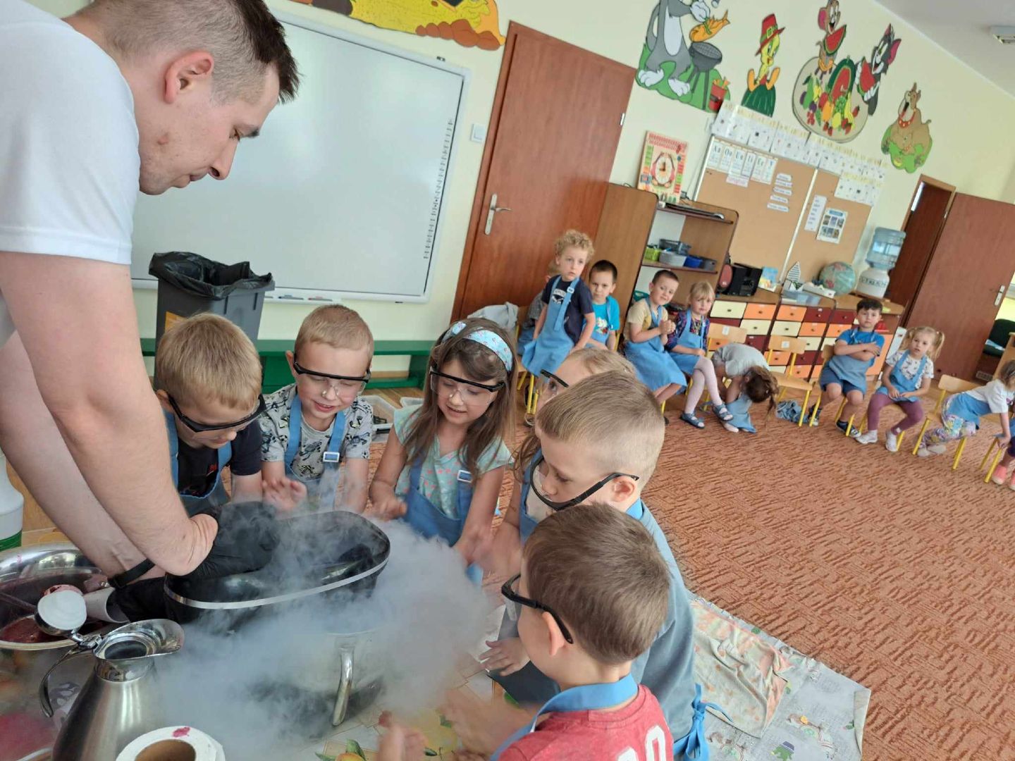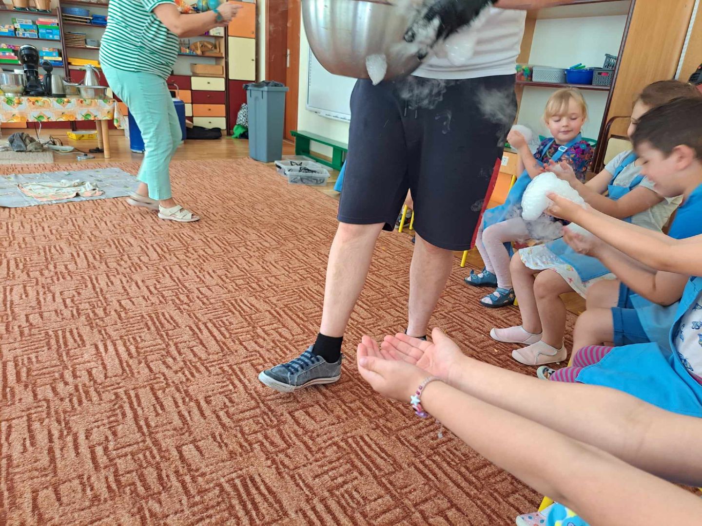 W piątek do naszego przedszkola zawitała kuchnia molekularna Podczas warsztatów dzieci poznały zjawisko sublimacji suchego lodu podczas którego wydziela się dwutlenek węgla. Z wykorzystaniem tej substancji napompuje się balon i powstało dużo „ciężkiego dymu” na podłodze. Zapoznaliśmy się także z możliwością wykorzystania suchego lodu w różnych obszarach działalności człowieka. Wspólnie odkrywaliśmy, czy mandarynka wsadzona do suchego lodu zamrozi się i czy uda nam się ją rozbić młotkiem. Na warsztatach wytworzono także suchą pianę i zrobiono dymiące fryzury. Na koniec przy pomocy dzieci, ukręcono pyszne lody, które z apetytem zajadaliśmy.