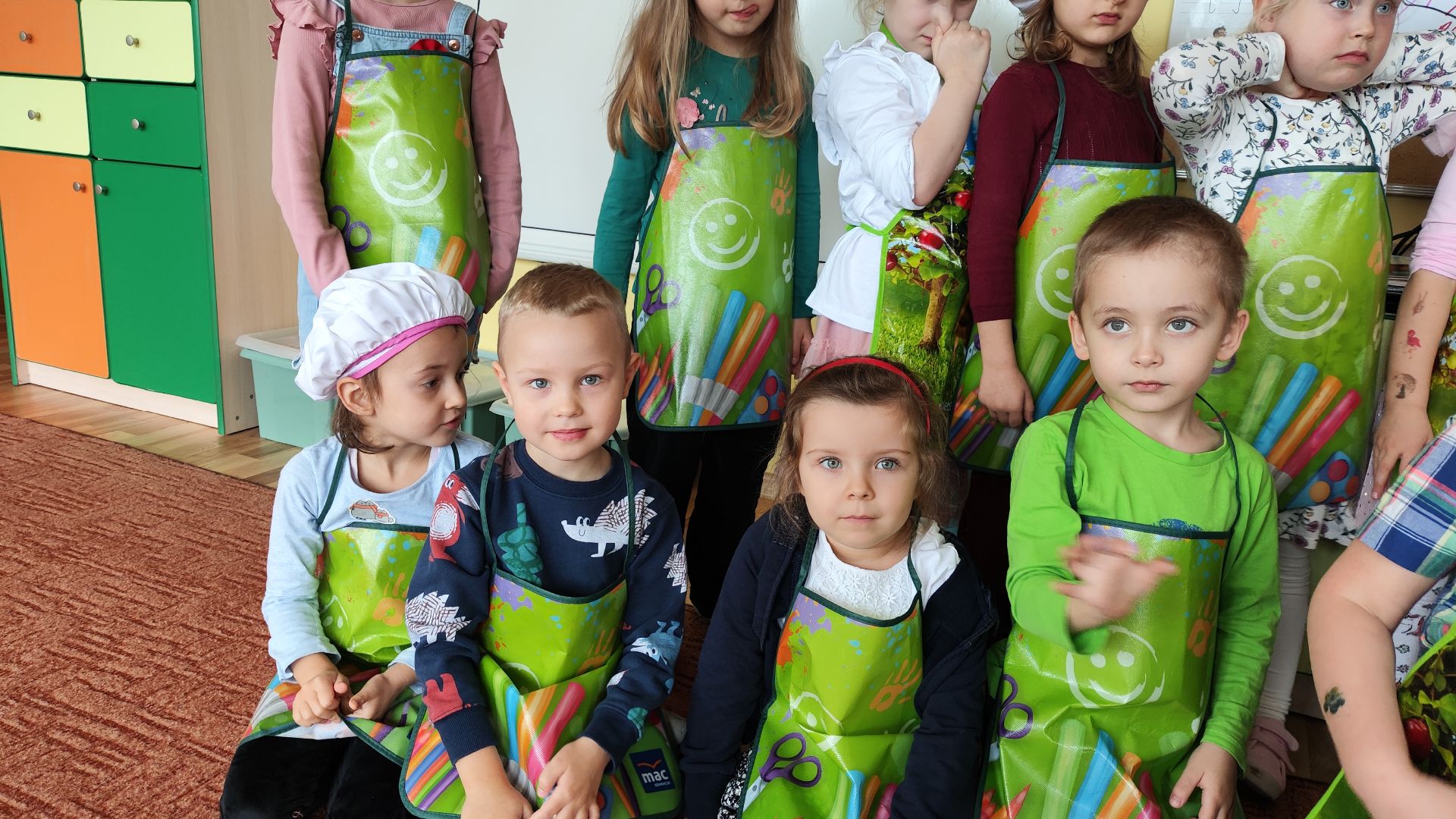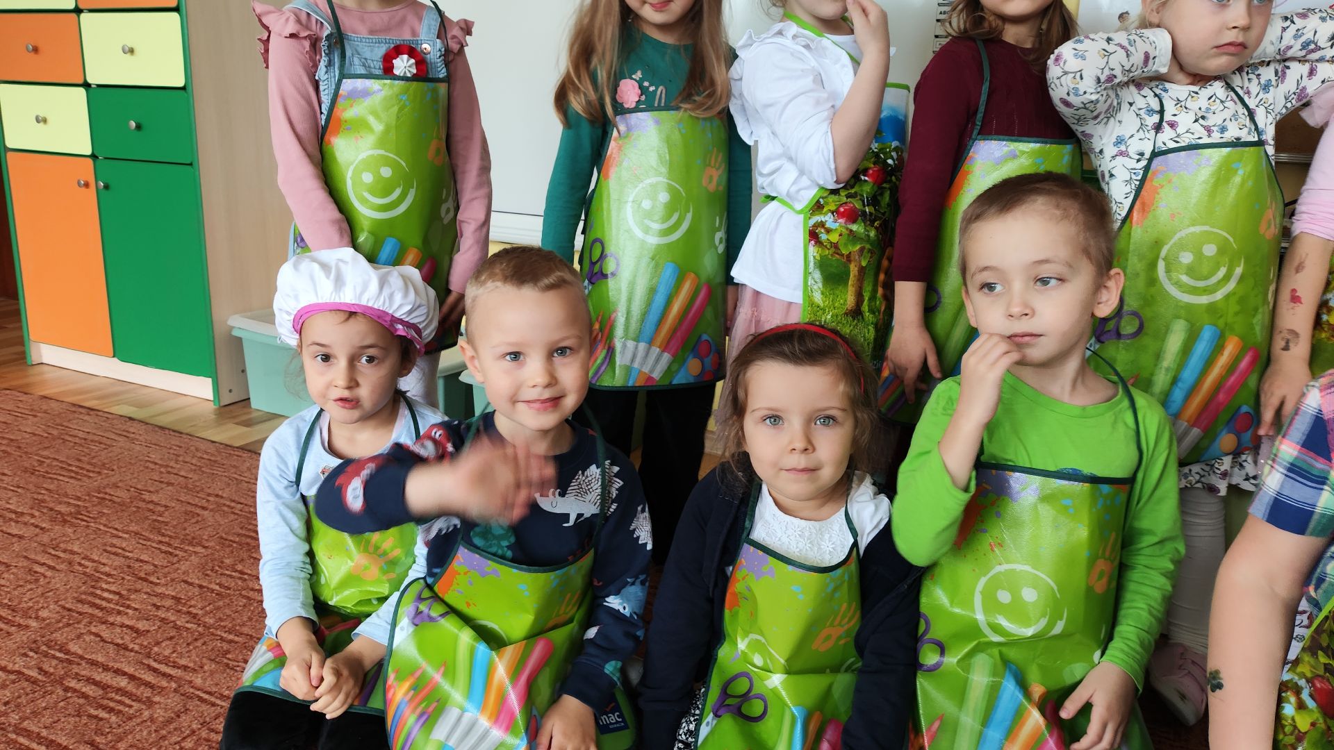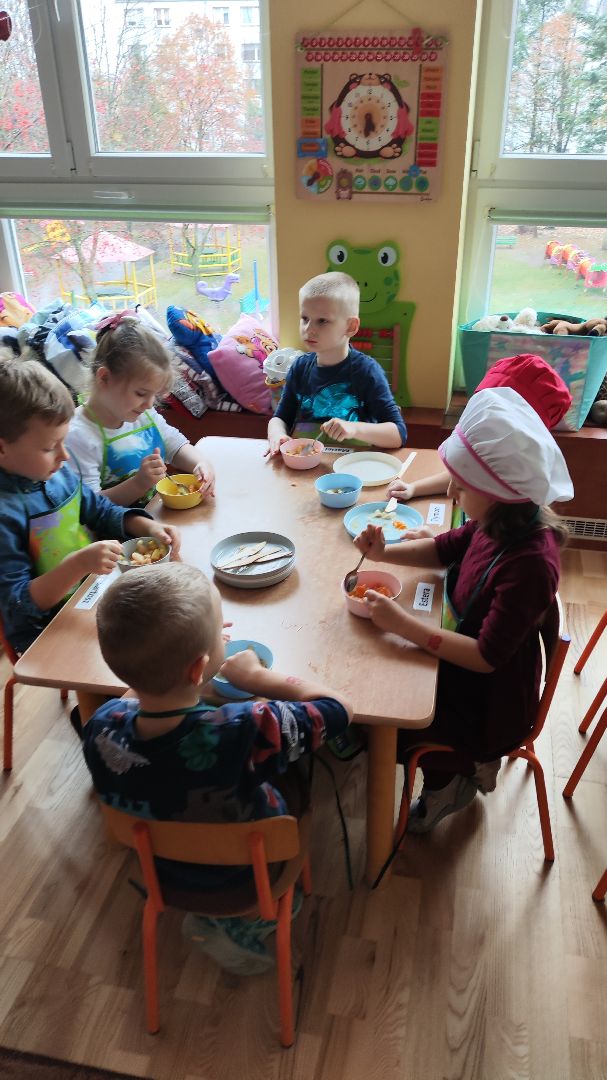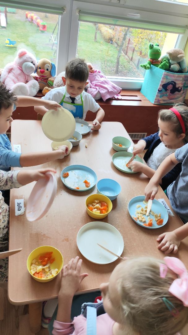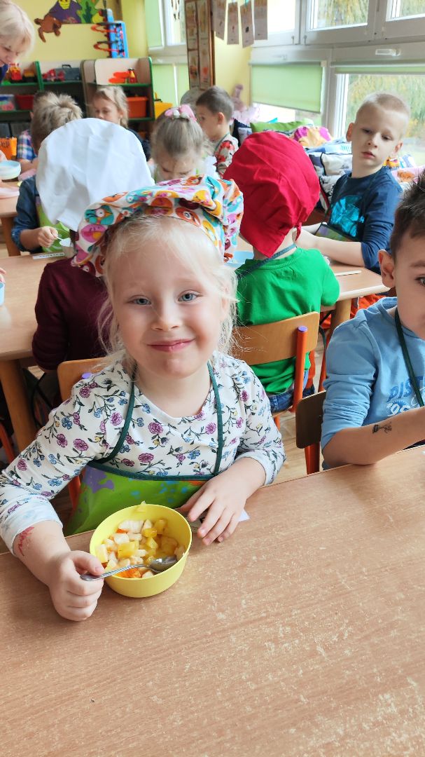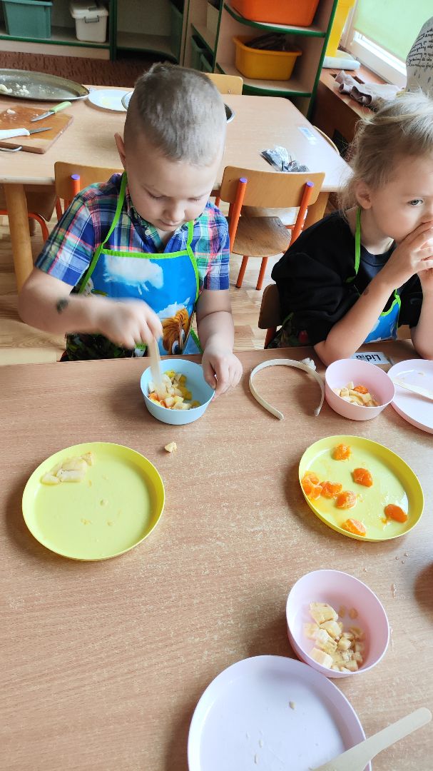 Kroimy, kroimy i się cieszymy!!!!! W ramach koła kulinarnego w dniu dzisiejszym byliśmy wszyscy  w kuchni Małego Misia. Samodzielnie kroilismy sałatkę owocową. Pychotka.