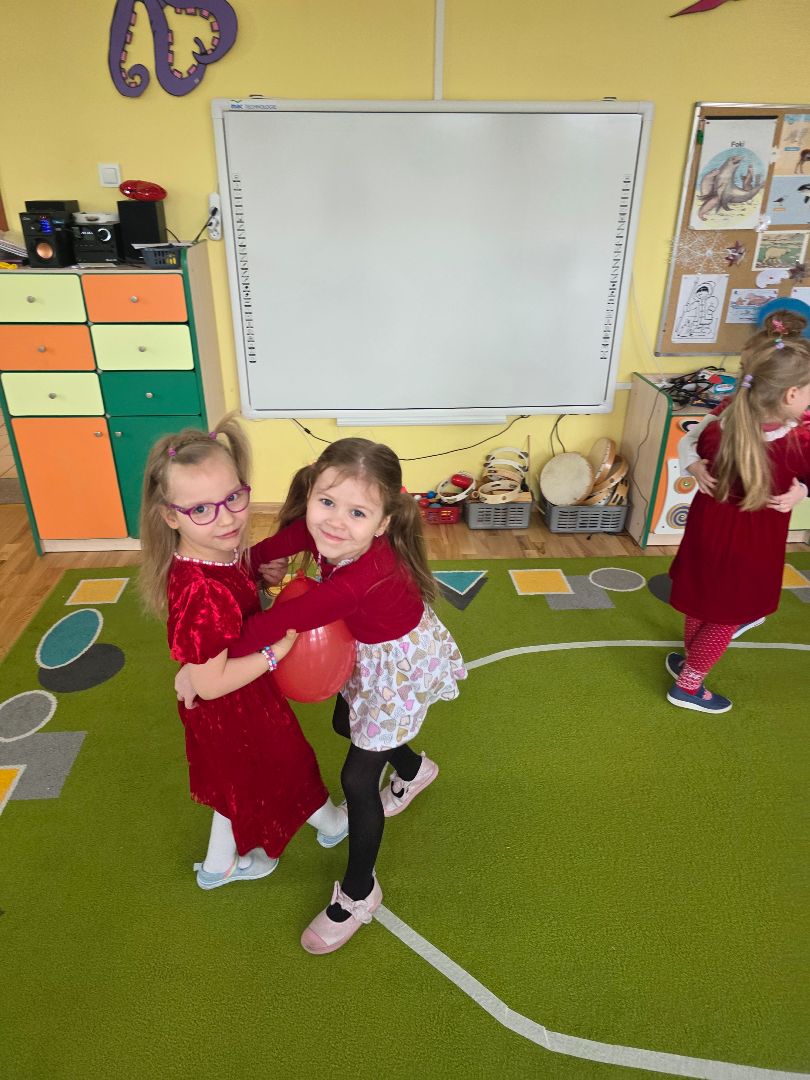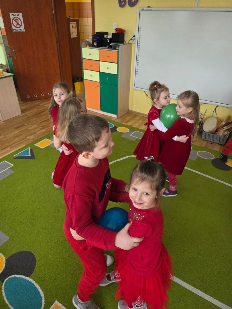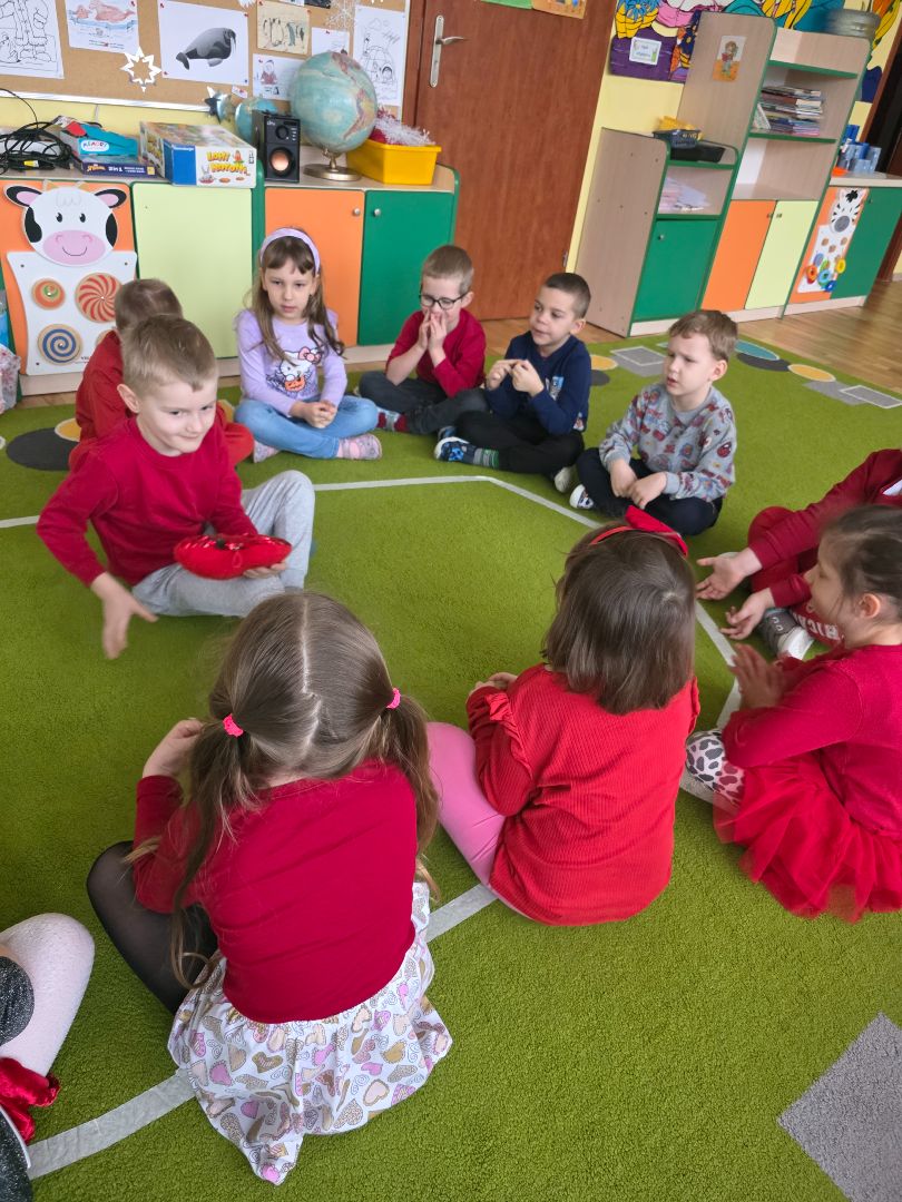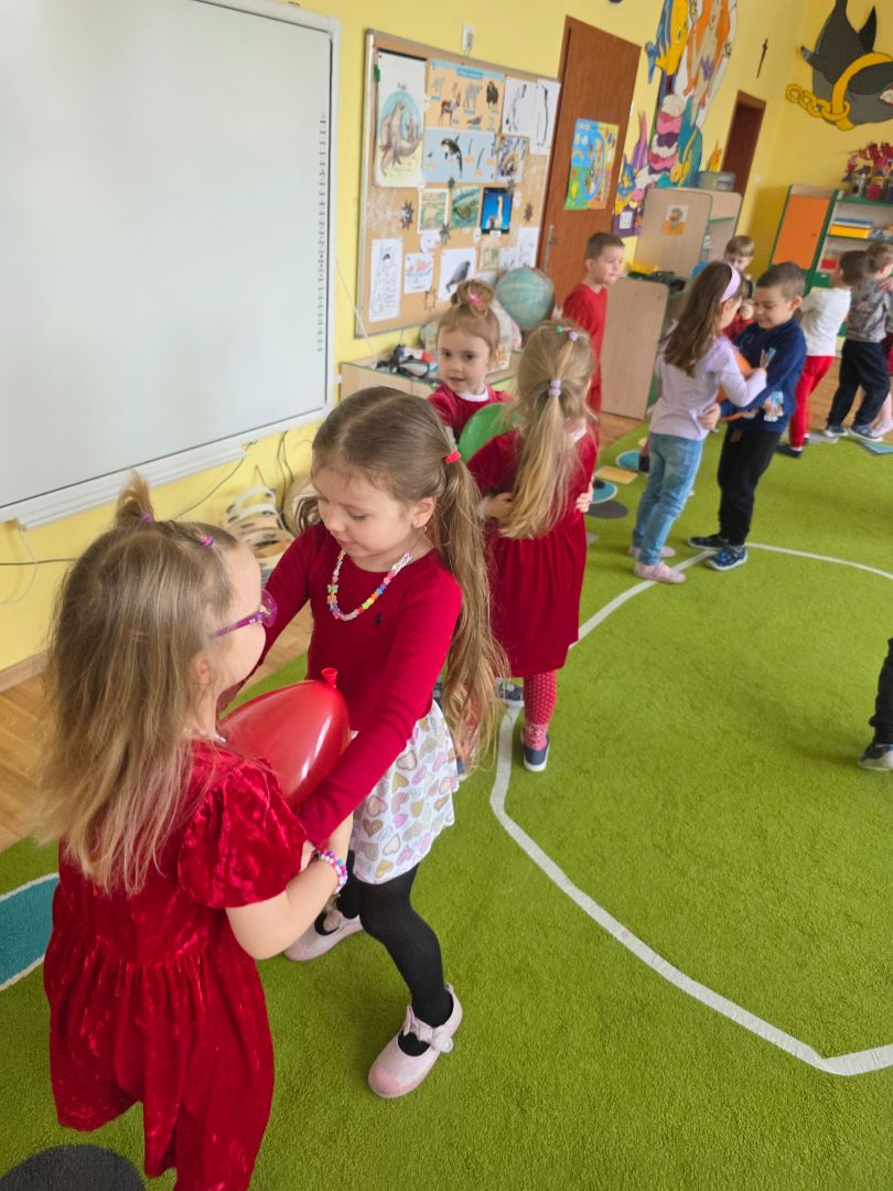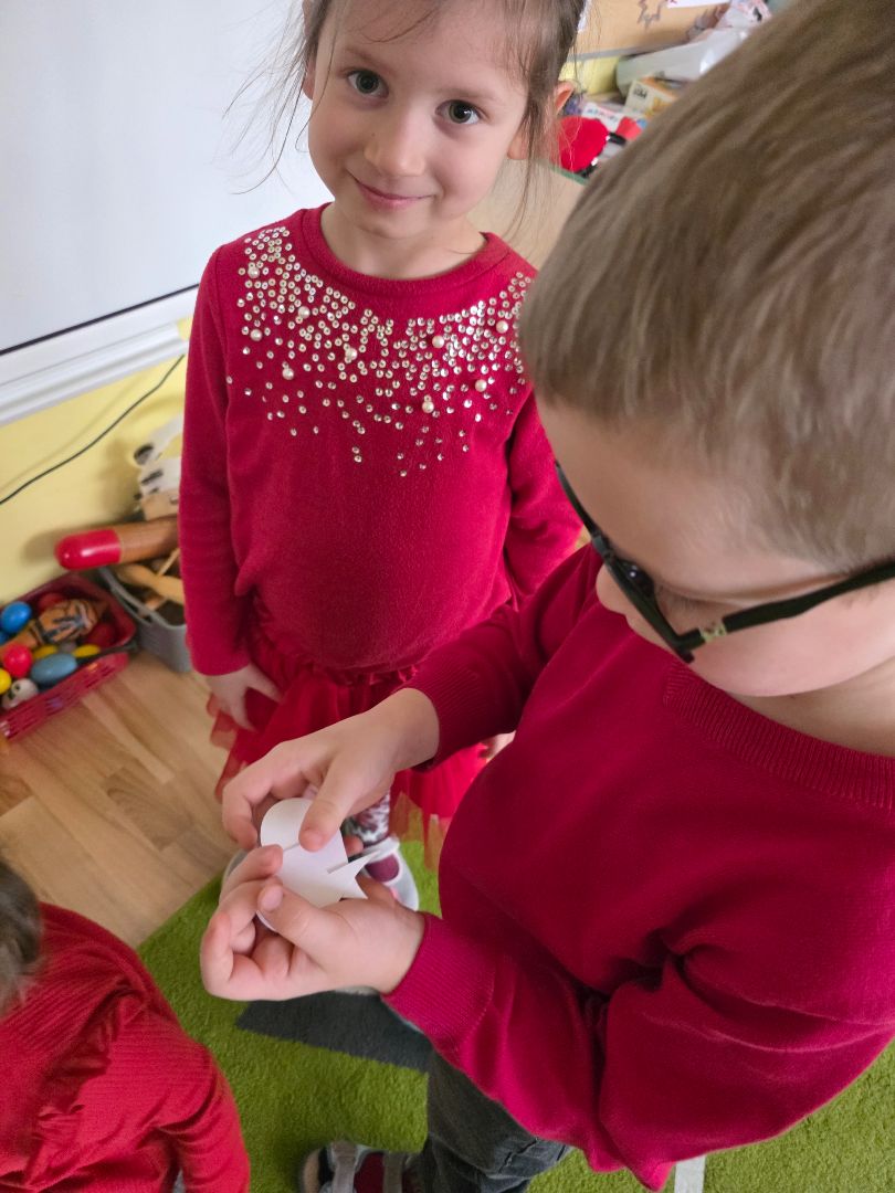 Dziś w naszym przedszkolu królowała przyjaźń! Świętowanie zaczęliśmy od zabawy w „poszukiwaczy połówek”, gdzie bystre oczy przedszkolaków musiały odnaleźć pasujące do siebie elementy serduszek. Następnie usiedliśmy w kręgu, by stworzyć „łańcuch komplementów”- każde dziecko przekazywało koledze obok pluszowe serce a wraz z nim mówiło coś miłego, wywołując mnóstwo radosnych wypieków na twarzy. Zwieńczeniem dnia było wręczenie walentynek wykonanych wcześniej w domu. Te proste gesty pokazały, że największą wartością jest czas spędzony razem w atmosferze wzajemnej życzliwości.
