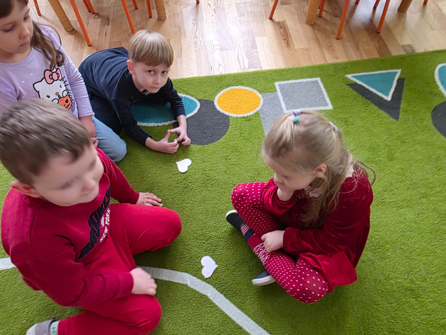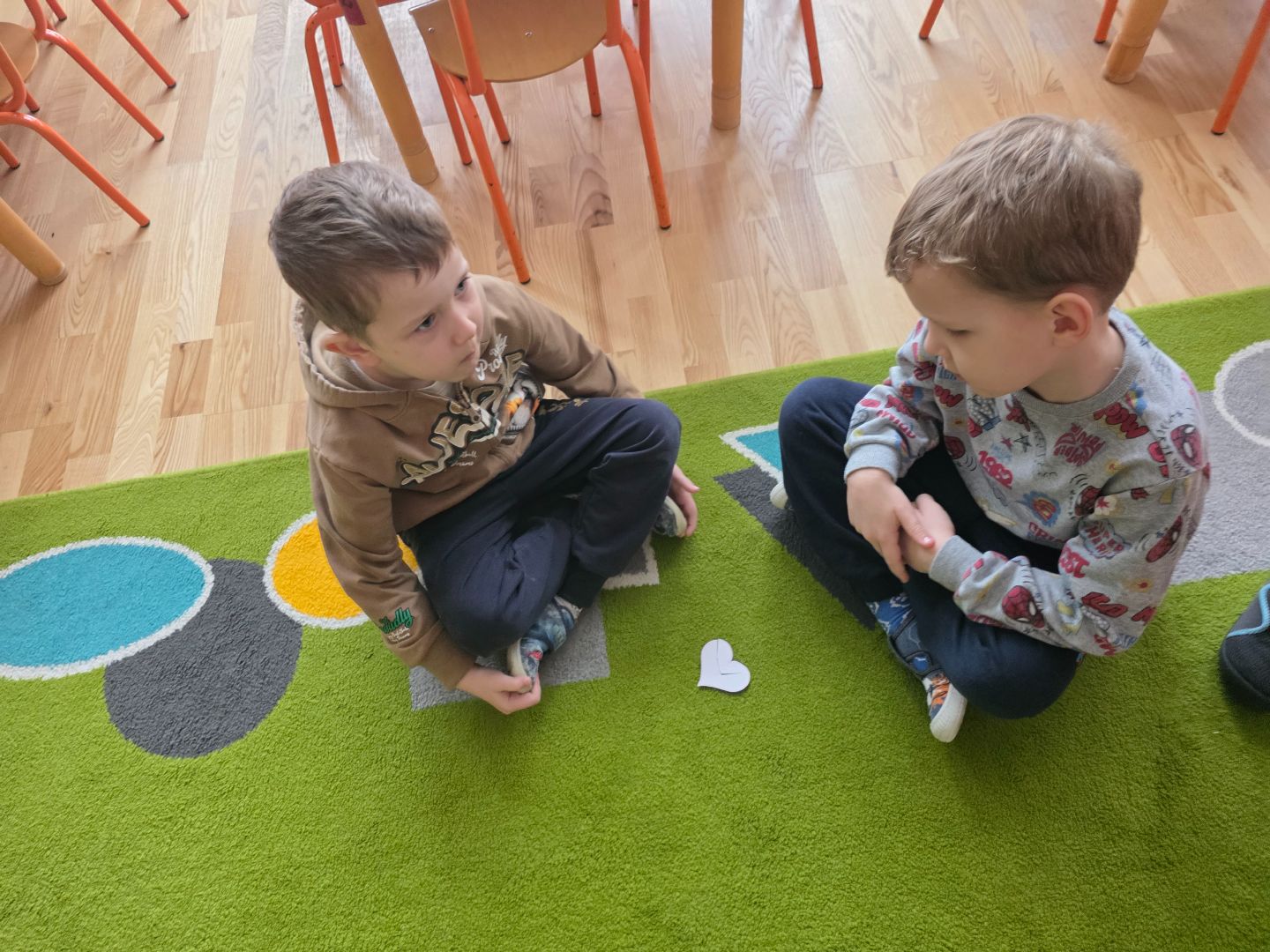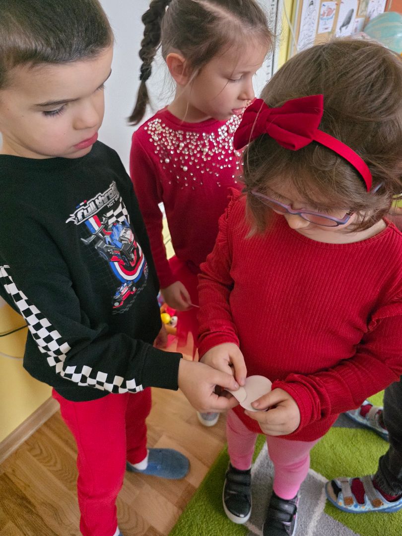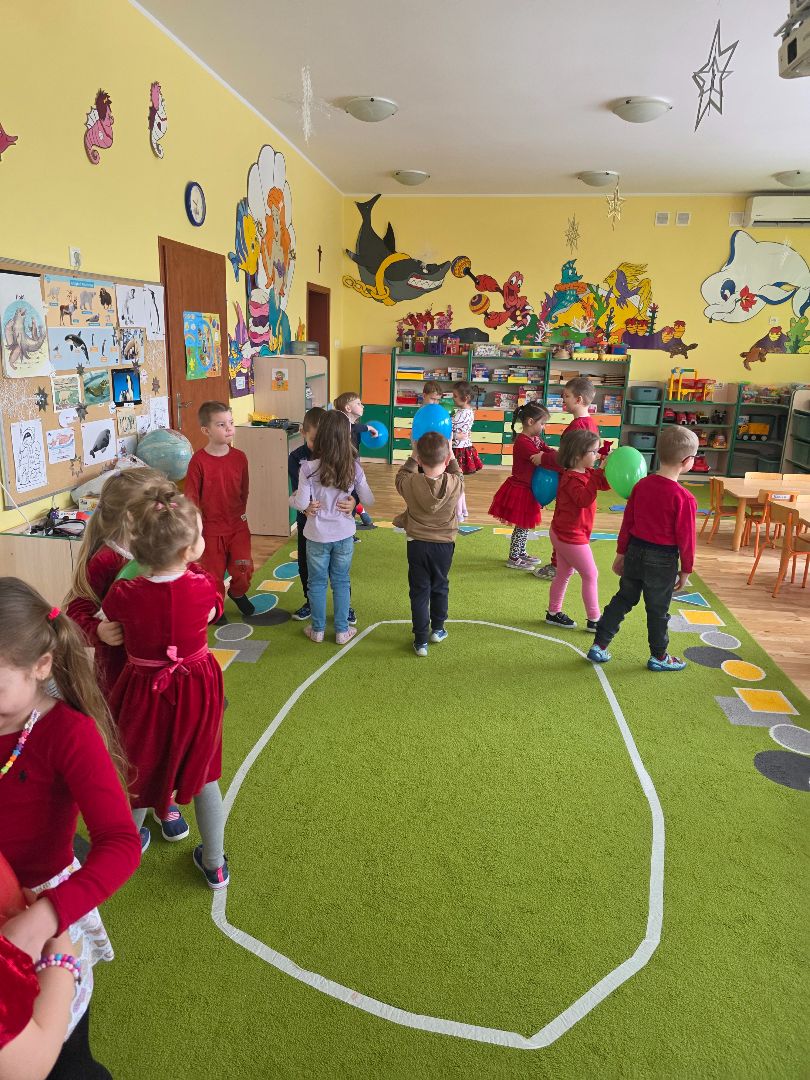 Dziś w naszym przedszkolu królowała przyjaźń! Świętowanie zaczęliśmy od zabawy w „poszukiwaczy połówek”, gdzie bystre oczy przedszkolaków musiały odnaleźć pasujące do siebie elementy serduszek. Następnie usiedliśmy w kręgu, by stworzyć „łańcuch komplementów”- każde dziecko przekazywało koledze obok pluszowe serce a wraz z nim mówiło coś miłego, wywołując mnóstwo radosnych wypieków na twarzy. Zwieńczeniem dnia było wręczenie walentynek wykonanych wcześniej w domu. Te proste gesty pokazały, że największą wartością jest czas spędzony razem w atmosferze wzajemnej życzliwości.