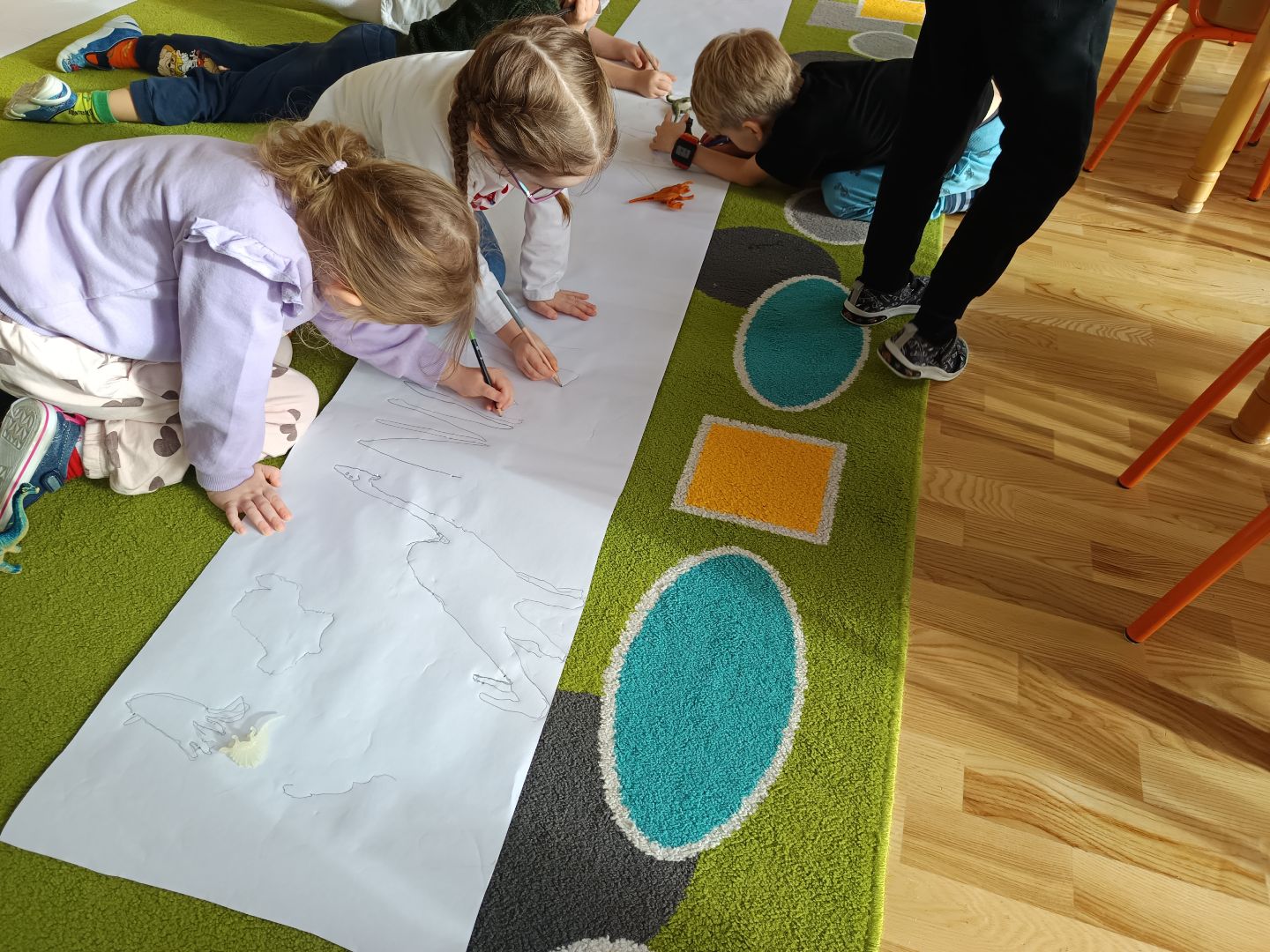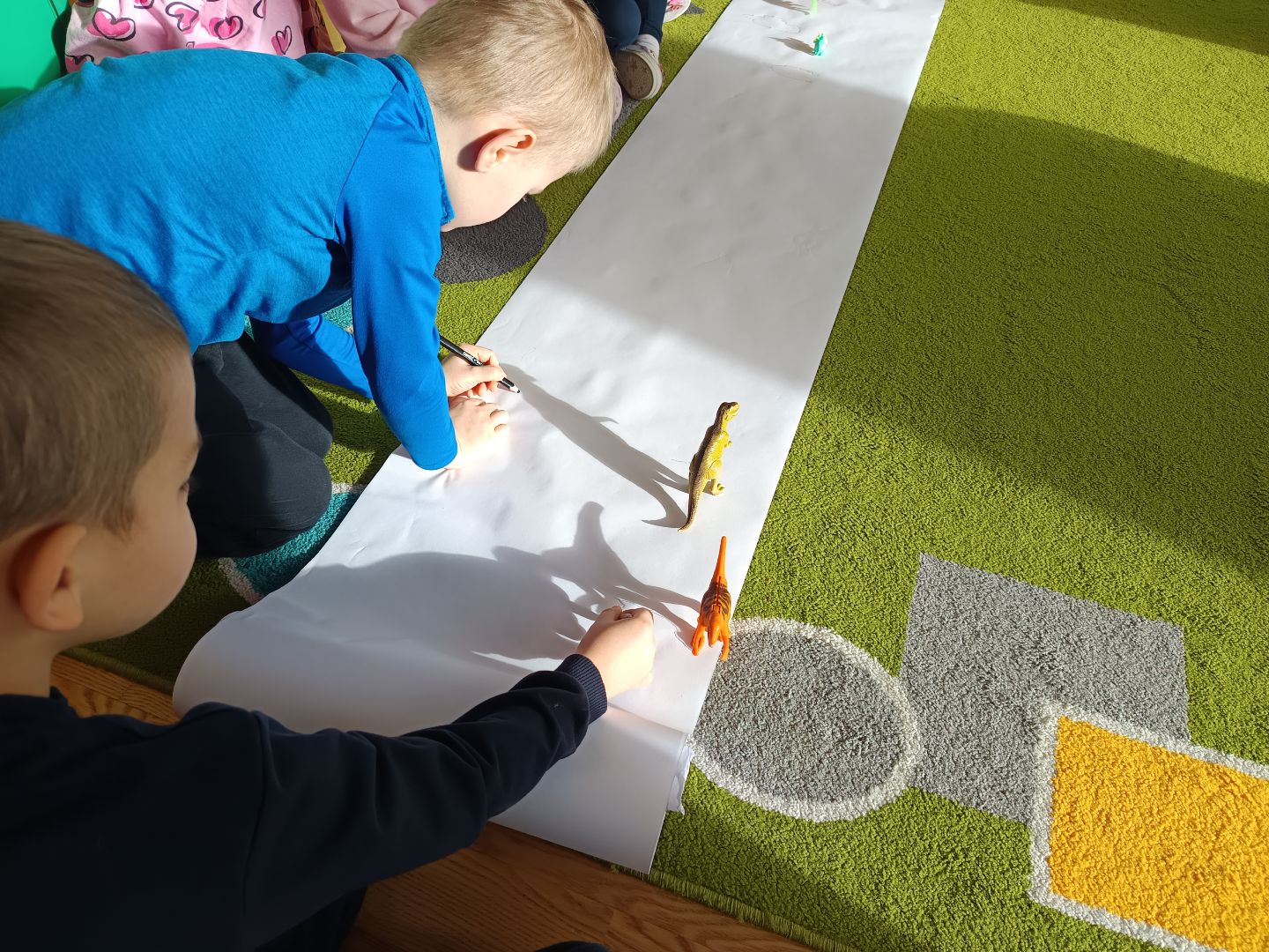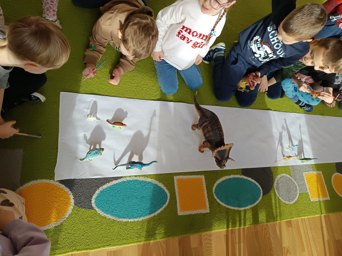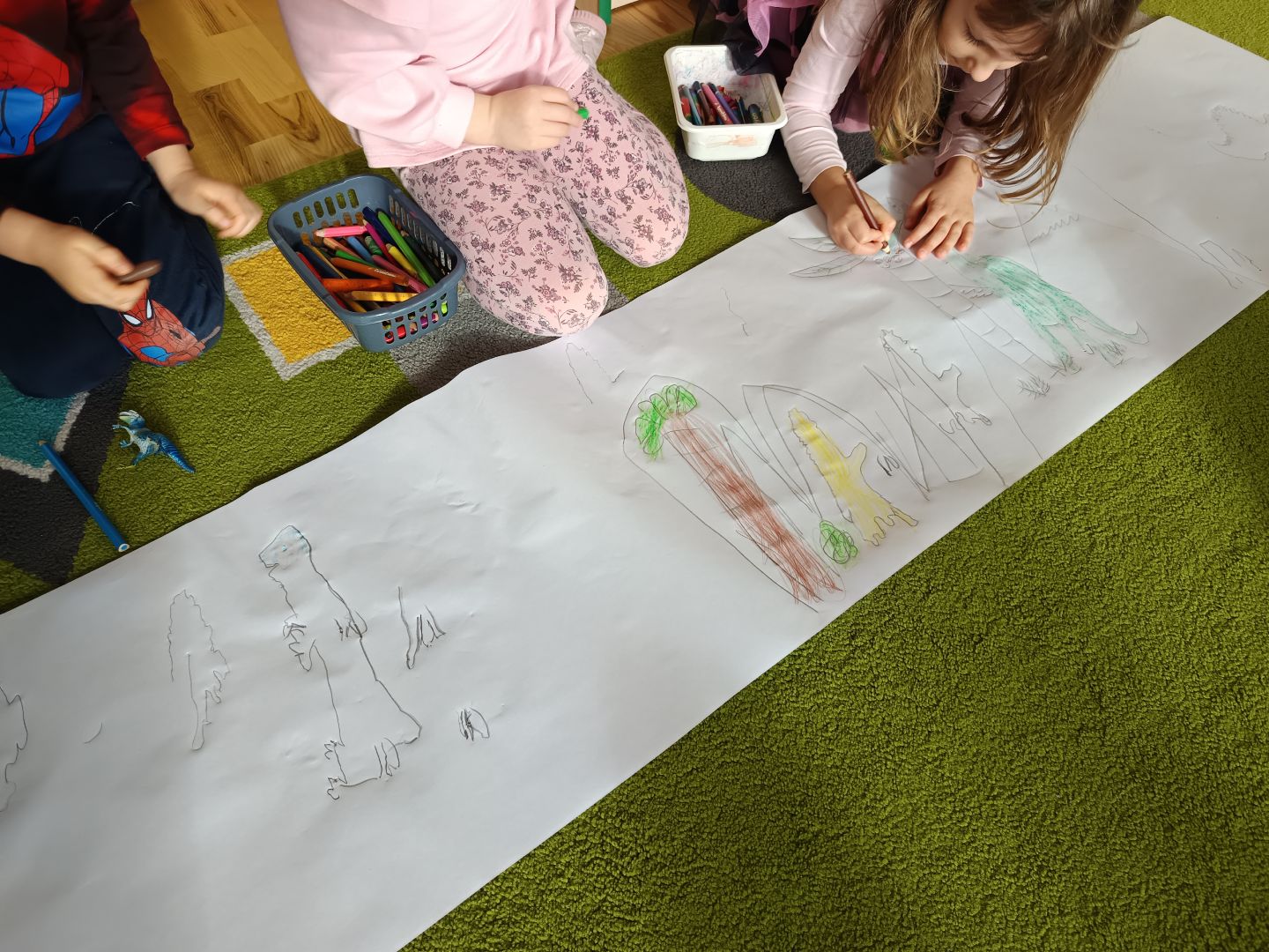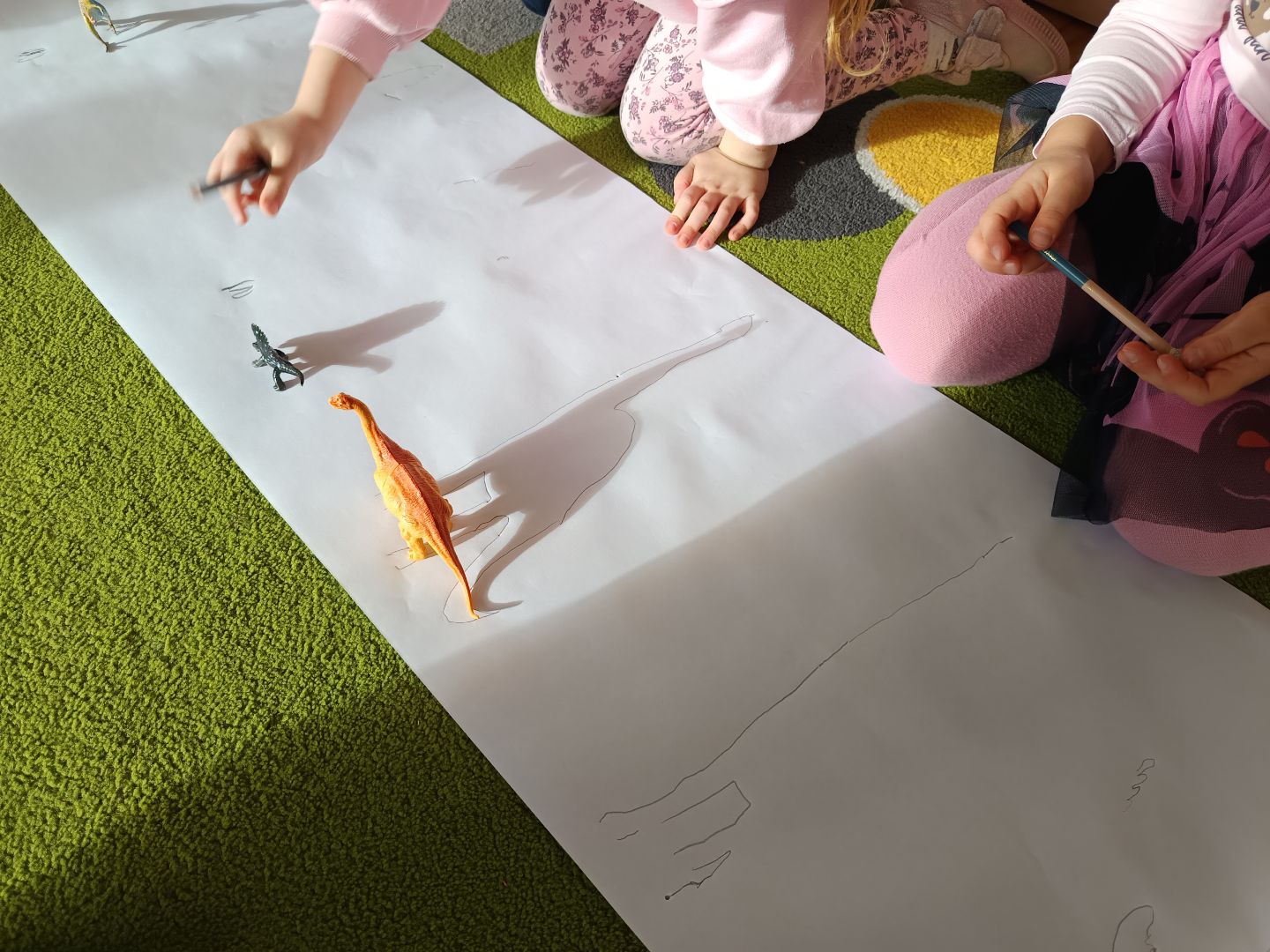 W tym tygodniu nasza grupa przeniosła się w czasie aż do epoki dinozaurów! Każdego dnia dzieliliśmy się ciekawostkami o tych fascynujących stworzeniach, rozmawialiśmy o ich zwyczajach i odkryciach naukowych. Każdy z nas odrysował cień swojego ulubionego dinozaura – powstały ogromne sylwetki tyranozaurów, diplodoków i wielu innych! Razem narysowaliśmy własny park jurajski — pełen drzewiastych terenów, jurajskich jezior i prehistorycznych olbrzymów! Bawiliśmy się w prawdziwe wykopaliska – szukaliśmy i odkopywaliśmy dinozaury oraz ich szkielety, czując się jak mali paleontolodzy! Ćwiczyliśmy czworakowanie z omijaniem przeszkód – jak prawdziwe dinozaury. Dodawaliśmy i odejmowaliśmy
