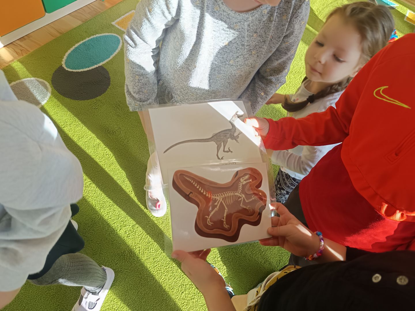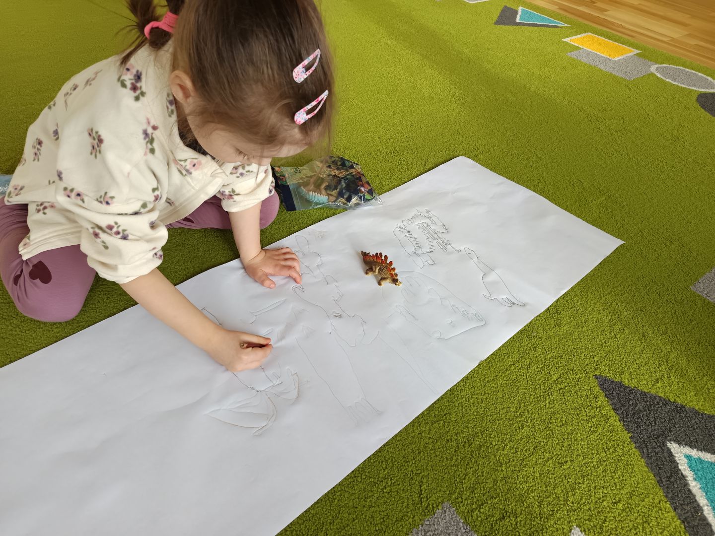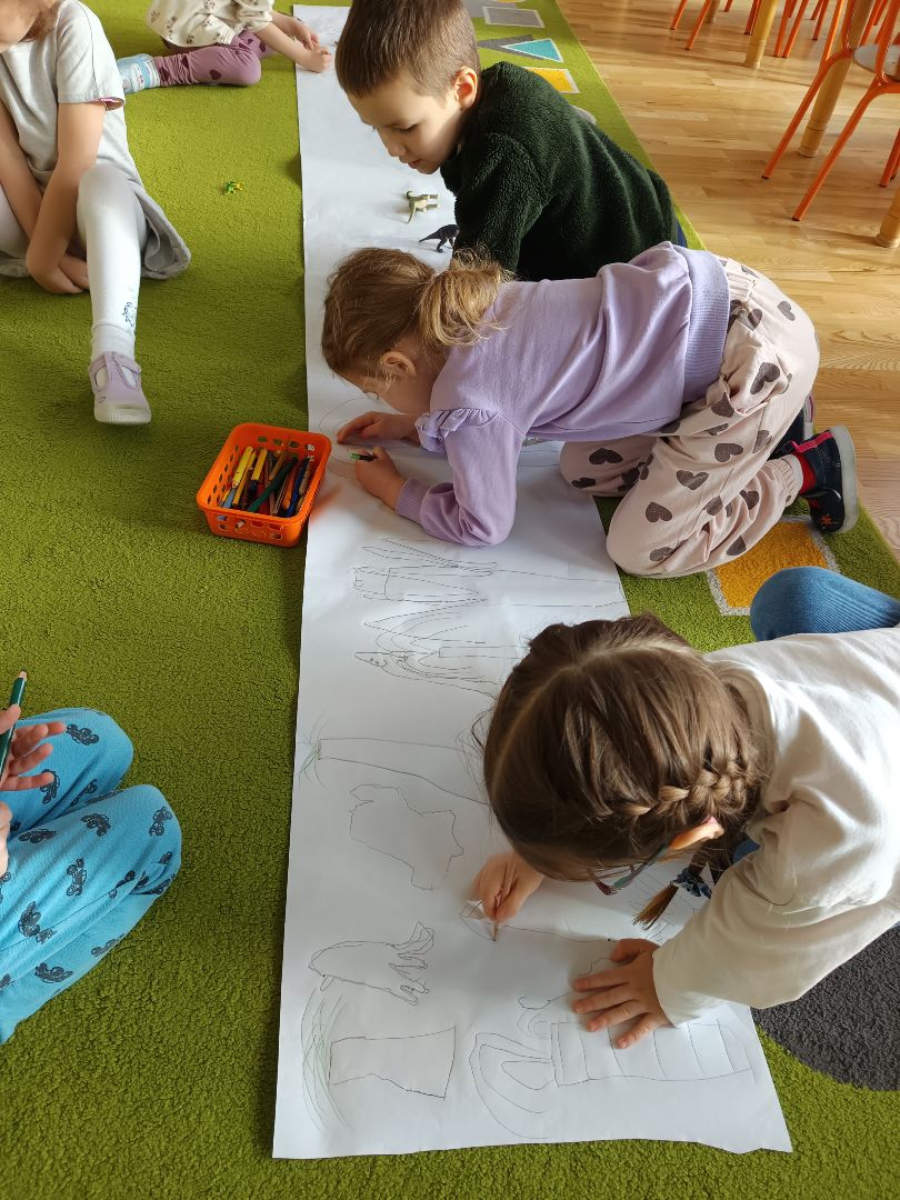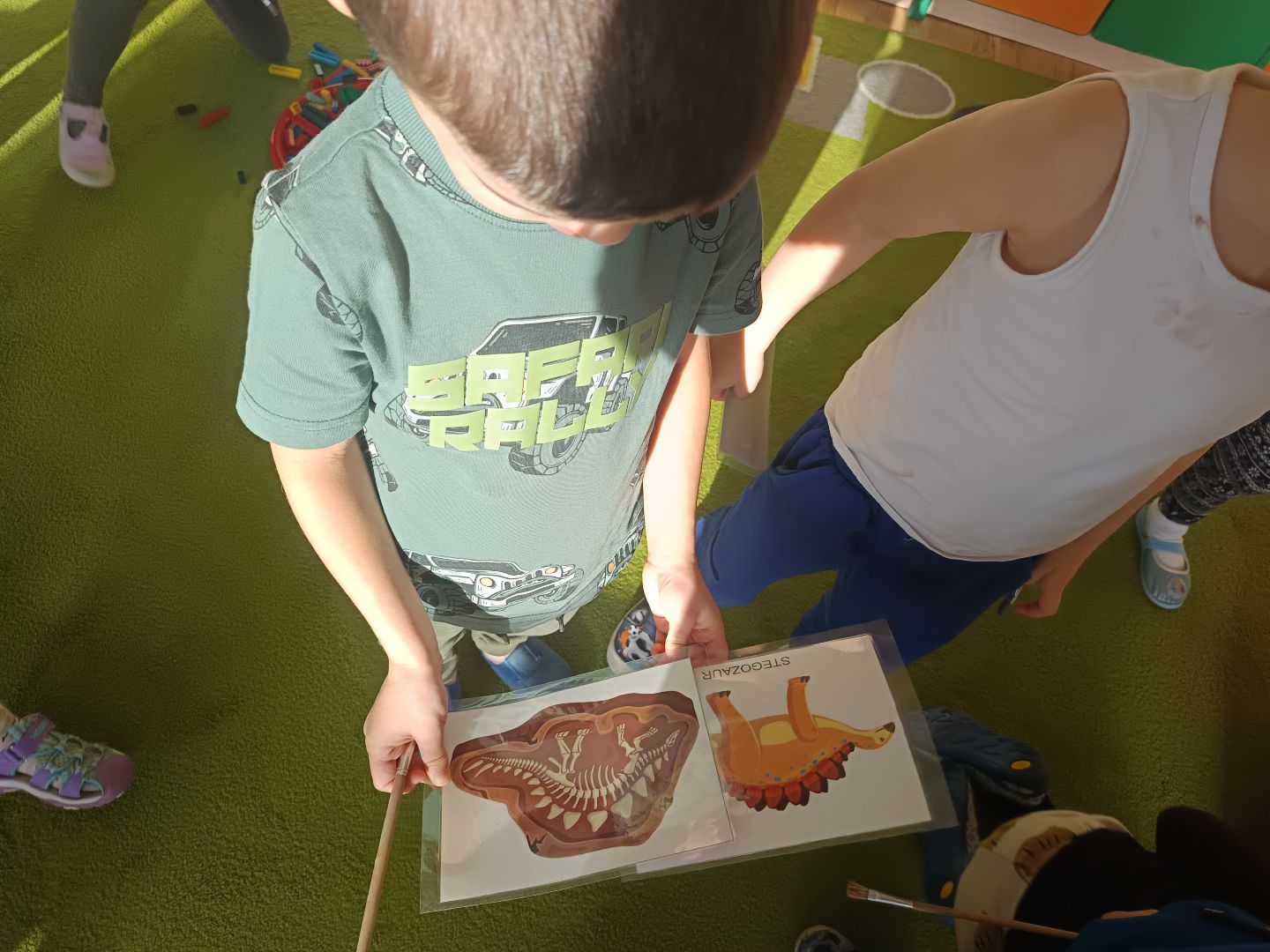 W tym tygodniu nasza grupa przeniosła się w czasie aż do epoki dinozaurów! Każdego dnia dzieliliśmy się ciekawostkami o tych fascynujących stworzeniach, rozmawialiśmy o ich zwyczajach i odkryciach naukowych. Każdy z nas odrysował cień swojego ulubionego dinozaura – powstały ogromne sylwetki tyranozaurów, diplodoków i wielu innych! Razem narysowaliśmy własny park jurajski — pełen drzewiastych terenów, jurajskich jezior i prehistorycznych olbrzymów! Bawiliśmy się w prawdziwe wykopaliska – szukaliśmy i odkopywaliśmy dinozaury oraz ich szkielety, czując się jak mali paleontolodzy! Ćwiczyliśmy czworakowanie z omijaniem przeszkód – jak prawdziwe dinozaury. Dodawaliśmy i odejmowaliśmy