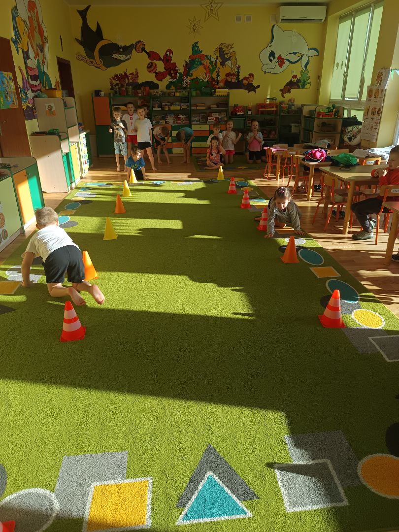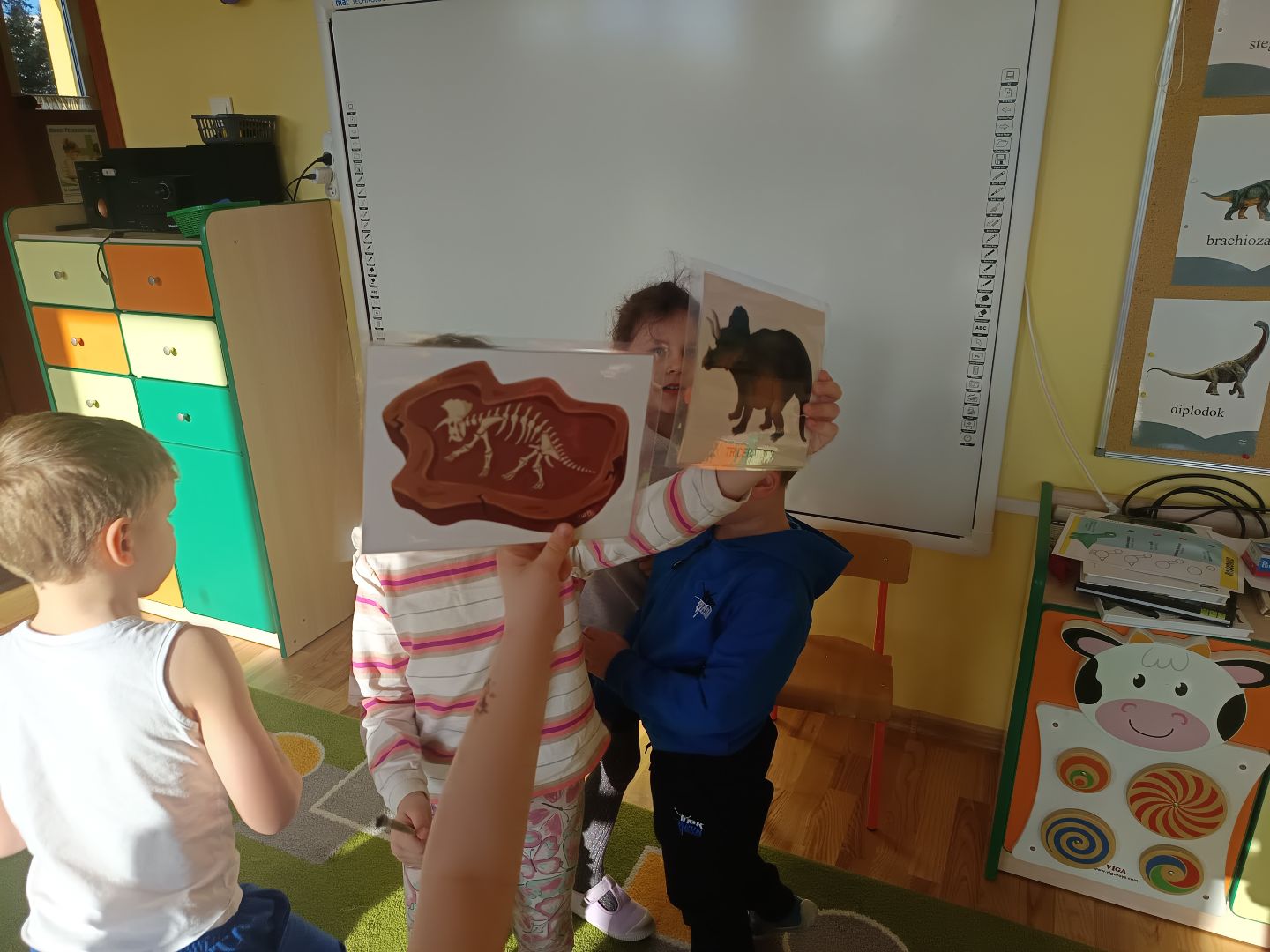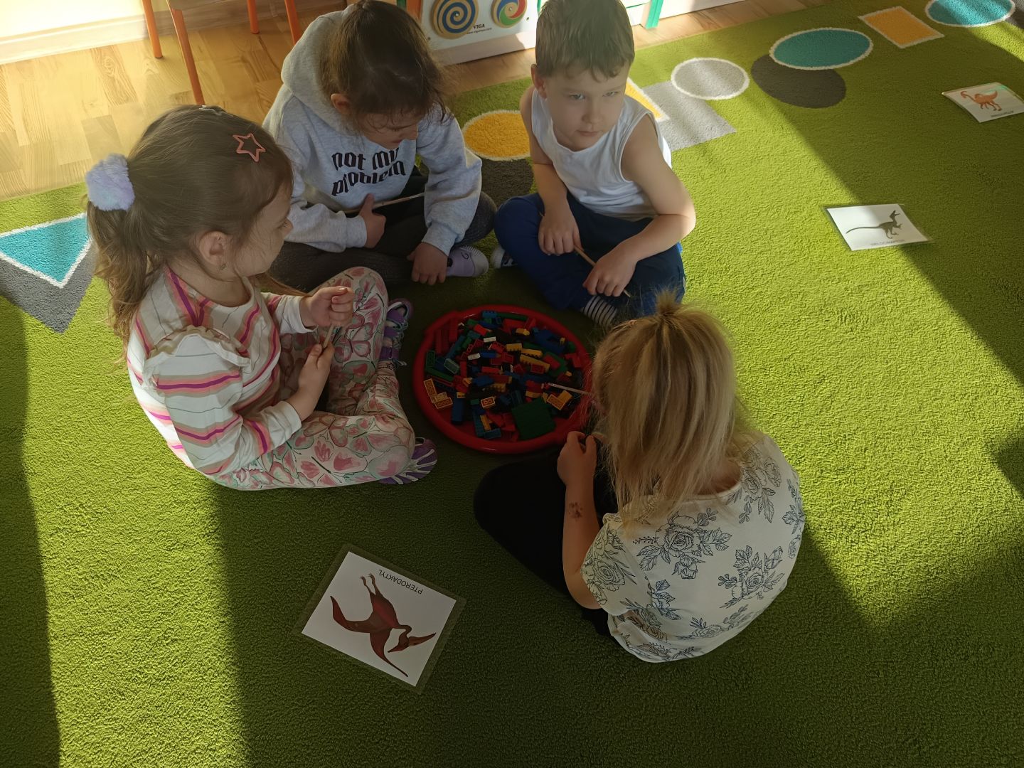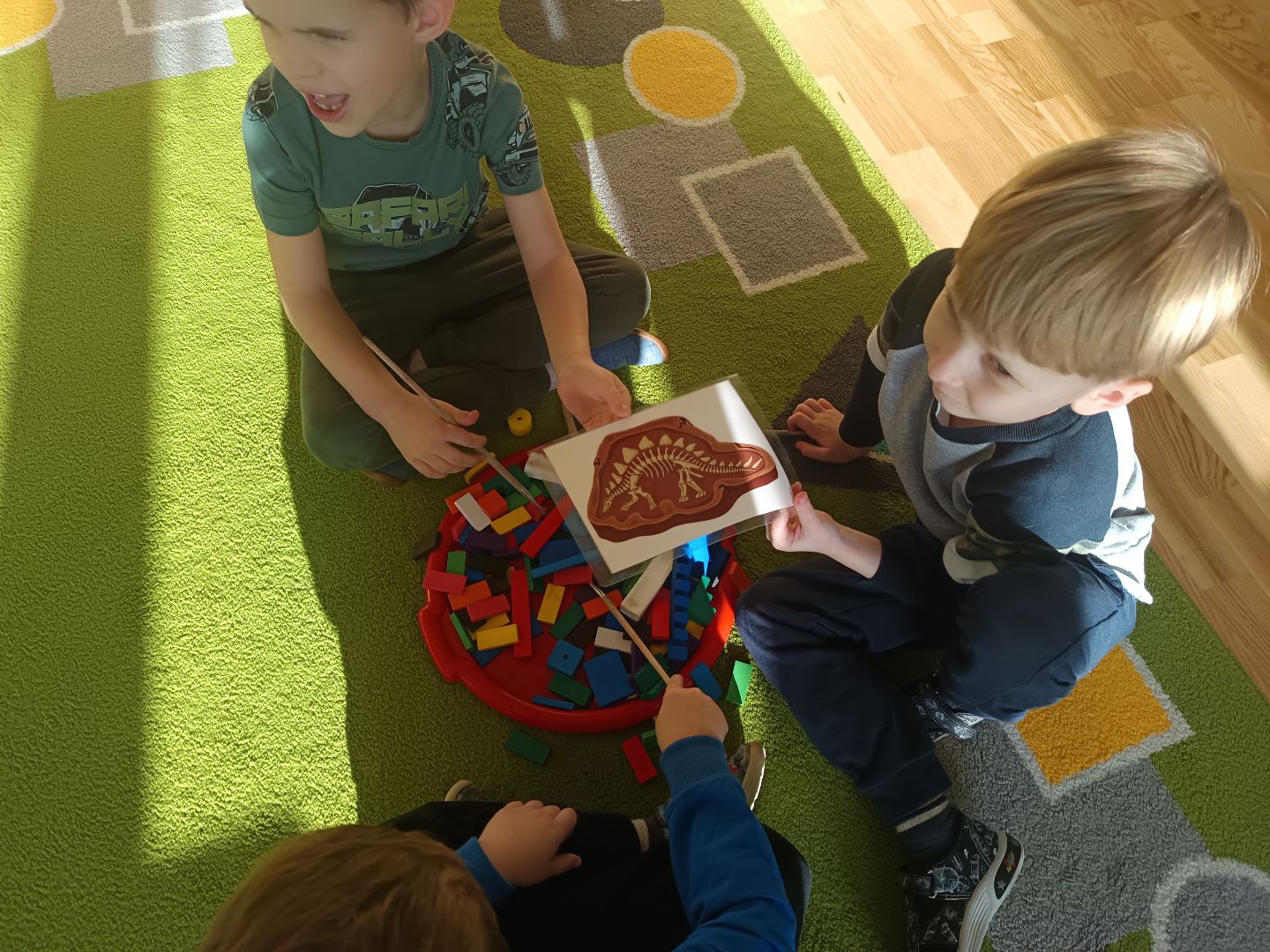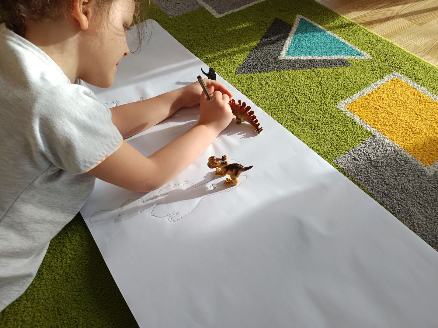 W tym tygodniu nasza grupa przeniosła się w czasie aż do epoki dinozaurów! Każdego dnia dzieliliśmy się ciekawostkami o tych fascynujących stworzeniach, rozmawialiśmy o ich zwyczajach i odkryciach naukowych. Każdy z nas odrysował cień swojego ulubionego dinozaura – powstały ogromne sylwetki tyranozaurów, diplodoków i wielu innych! Razem narysowaliśmy własny park jurajski — pełen drzewiastych terenów, jurajskich jezior i prehistorycznych olbrzymów! Bawiliśmy się w prawdziwe wykopaliska – szukaliśmy i odkopywaliśmy dinozaury oraz ich szkielety, czując się jak mali paleontolodzy! Ćwiczyliśmy czworakowanie z omijaniem przeszkód – jak prawdziwe dinozaury. Dodawaliśmy i odejmowaliśmy