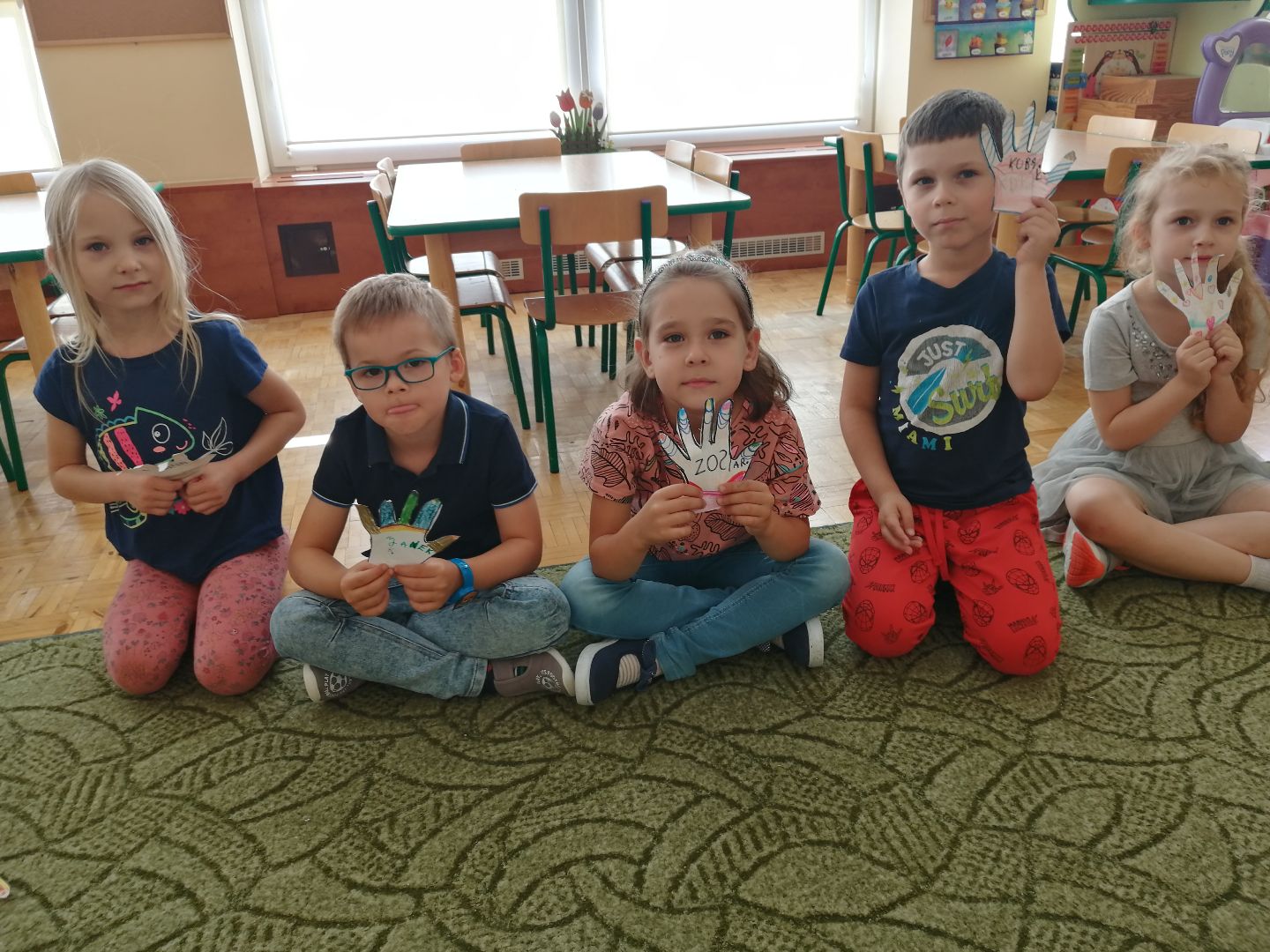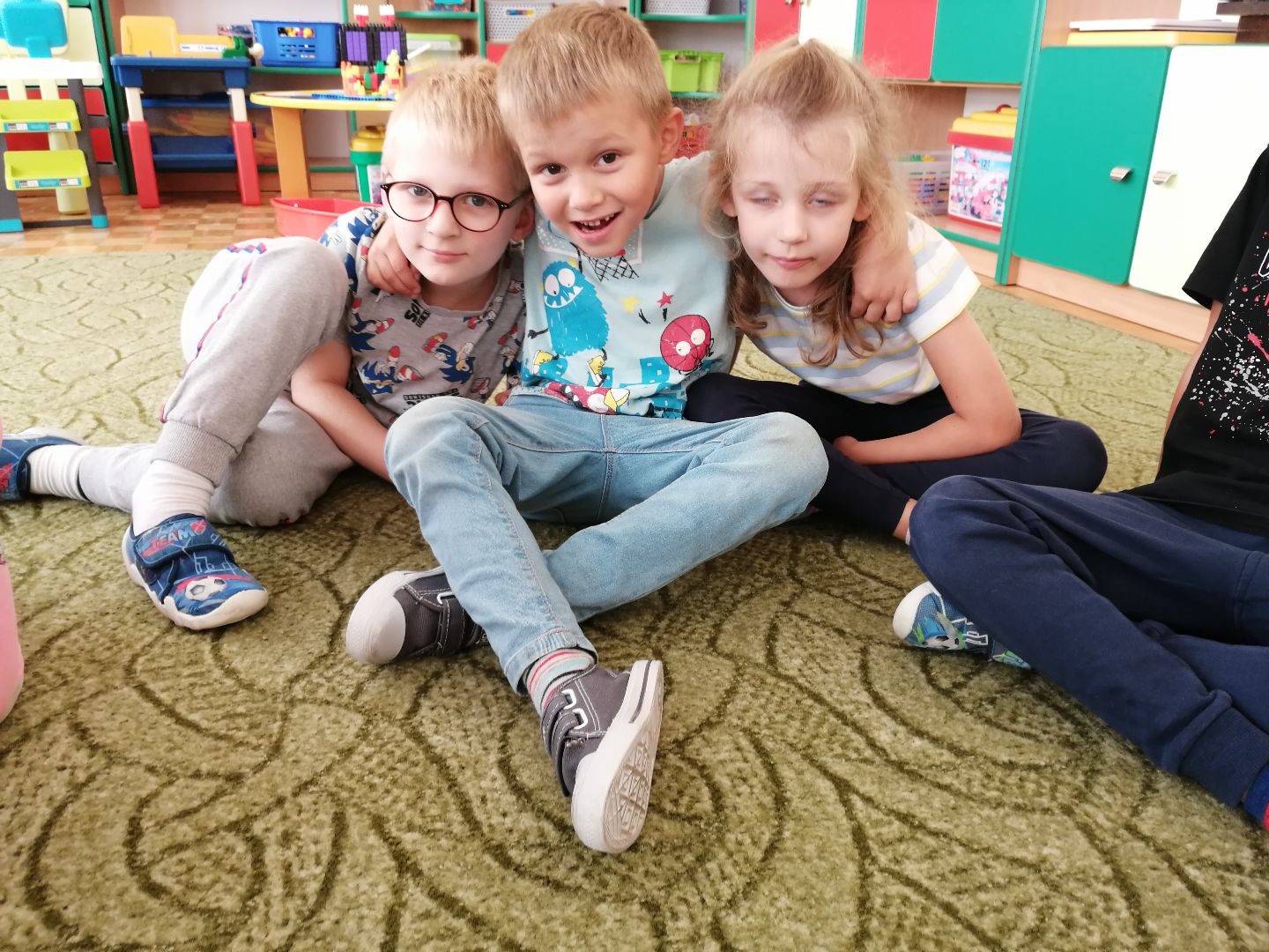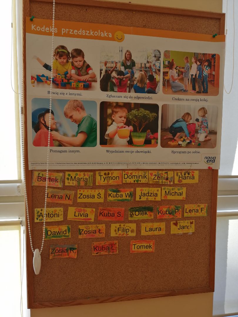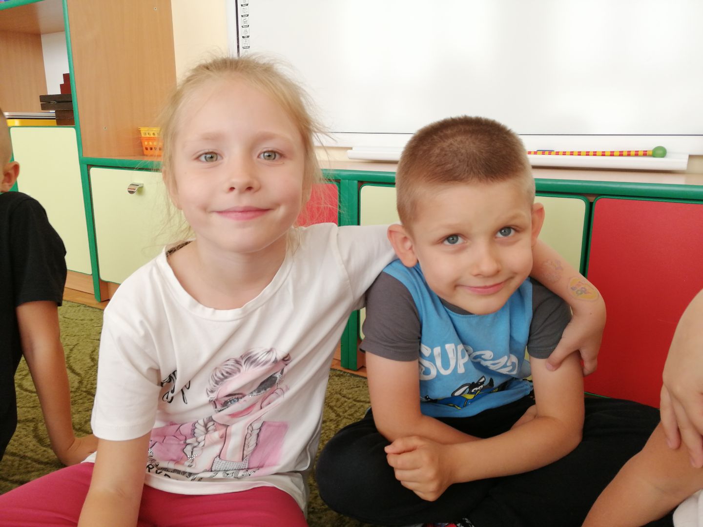 W pierwszych dniach poznawaliśmy pomieszczenia przedszkola- salę, szatnię, łazienkę oraz utrwalaliśmy znajomość imion koleżanek i kolegów z grupy. Dowiedzieliśmy się, jakie zasady obowiązują w przedszkolu. Rozpoznawaliśmy swoje wizytówki, ozdobiliśmy je i umieściliśmy na tablicy pod opracowanym kodeksem grupowym. Wykonaliśmy pracę plastyczną „Moje przedszkole”. Bawiliśmy się do piosenek „Taniec powitalny” oraz „Wesołe ręce”. Wszystkim dopisywał humor - dzieci zgodnie oznajmiły, że cieszą się, że po przerwie wakacyjnej będą się znowu spotykać.