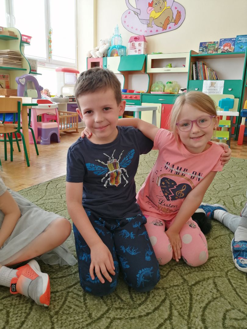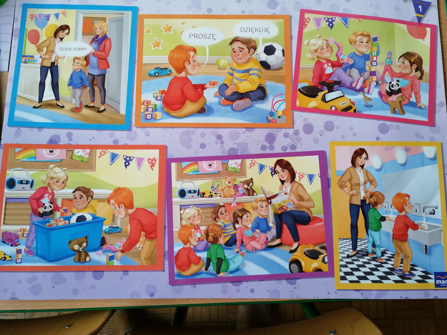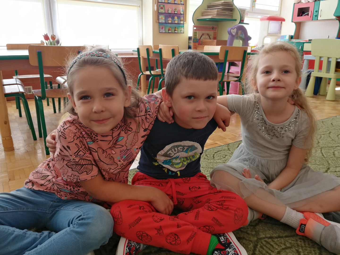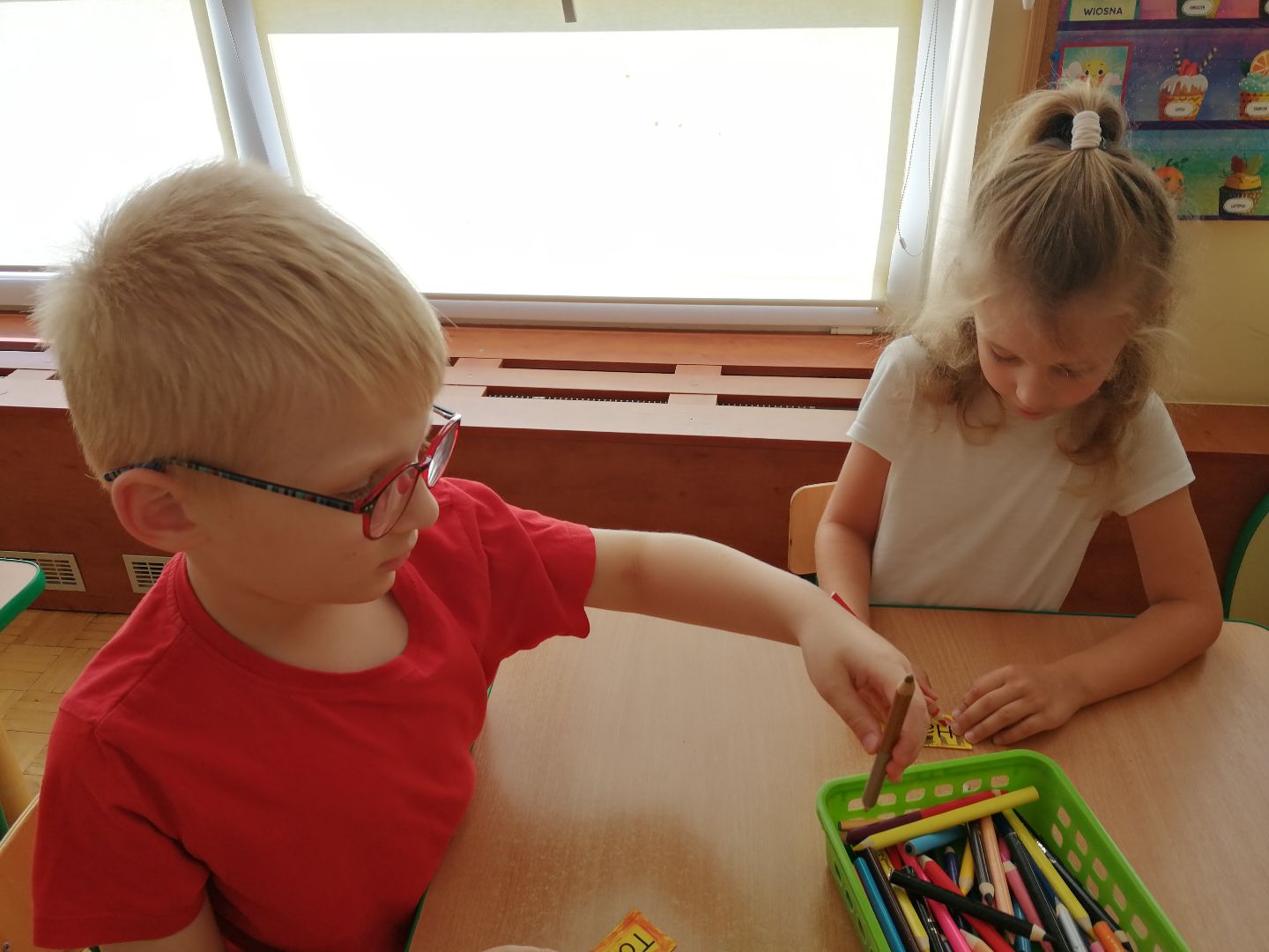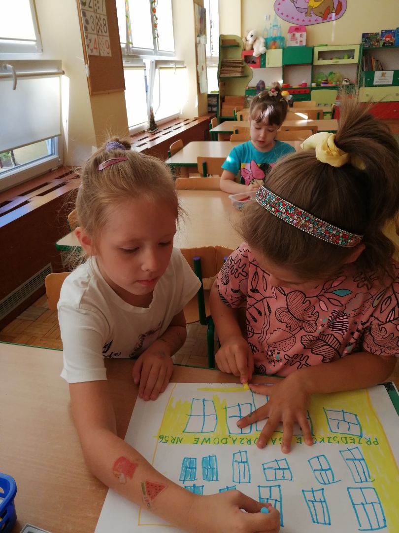 W pierwszych dniach poznawaliśmy pomieszczenia przedszkola- salę, szatnię, łazienkę oraz utrwalaliśmy znajomość imion koleżanek i kolegów z grupy. Dowiedzieliśmy się, jakie zasady obowiązują w przedszkolu. Rozpoznawaliśmy swoje wizytówki, ozdobiliśmy je i umieściliśmy na tablicy pod opracowanym kodeksem grupowym. Wykonaliśmy pracę plastyczną „Moje przedszkole”. Bawiliśmy się do piosenek „Taniec powitalny” oraz „Wesołe ręce”. Wszystkim dopisywał humor - dzieci zgodnie oznajmiły, że cieszą się, że po przerwie wakacyjnej będą się znowu spotykać.
