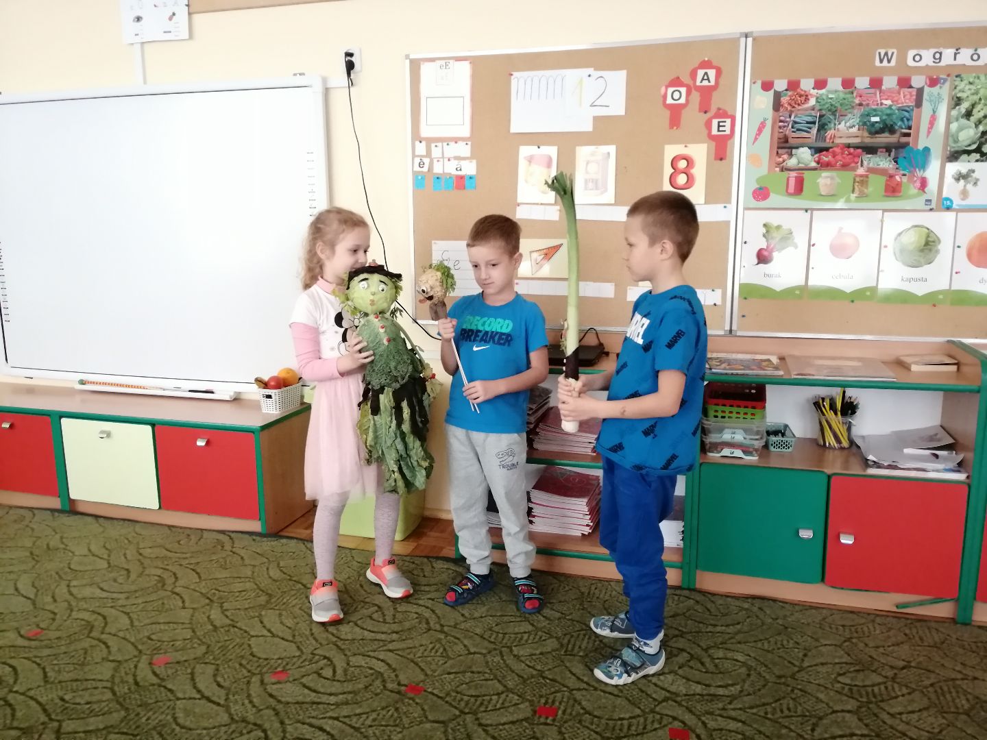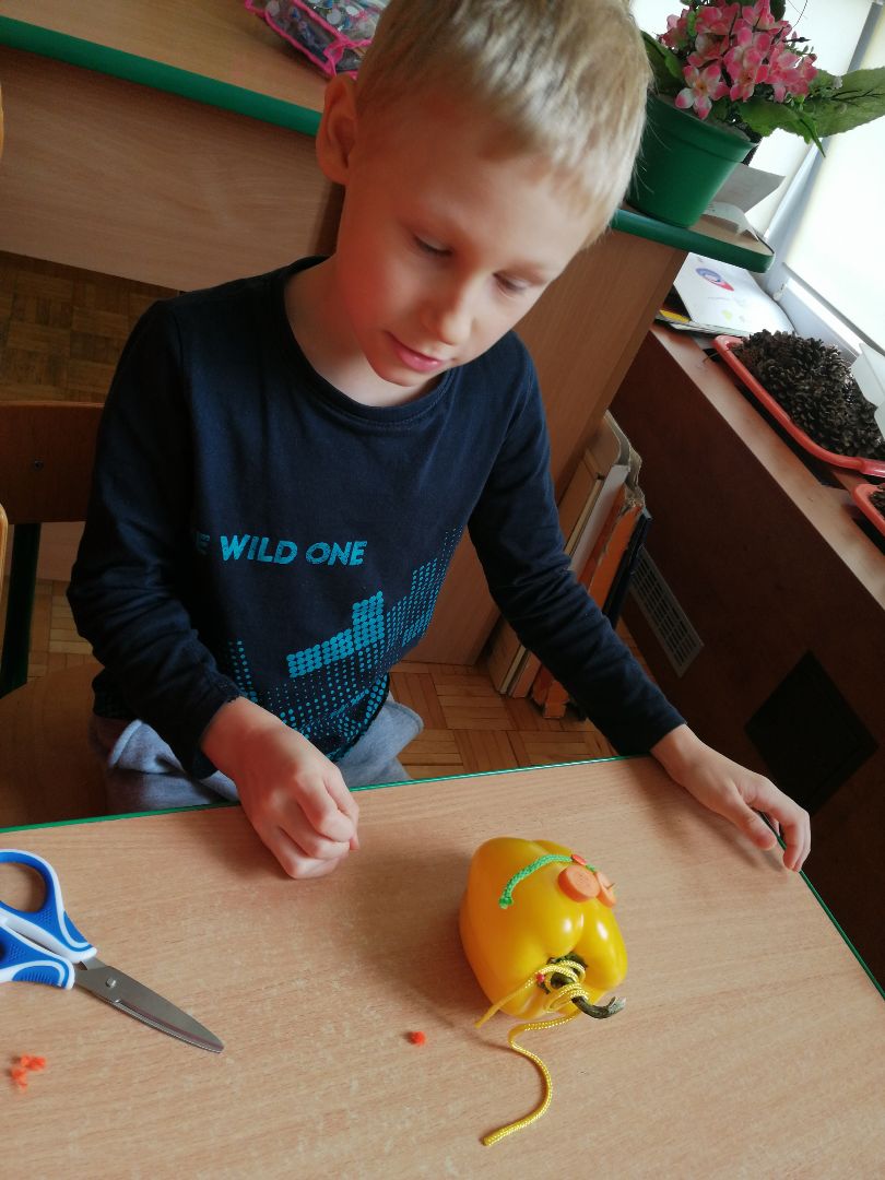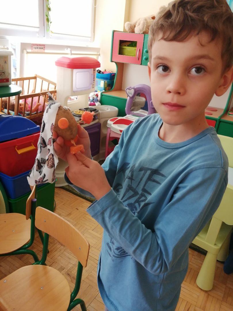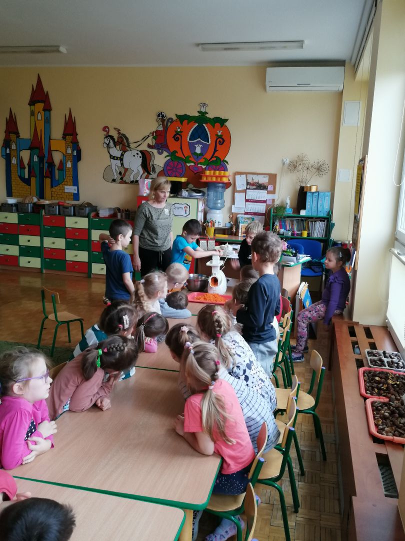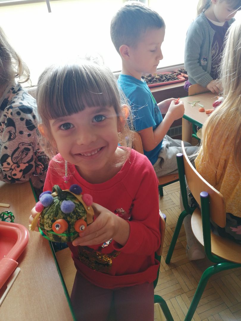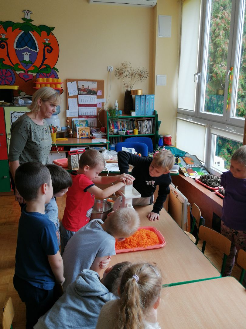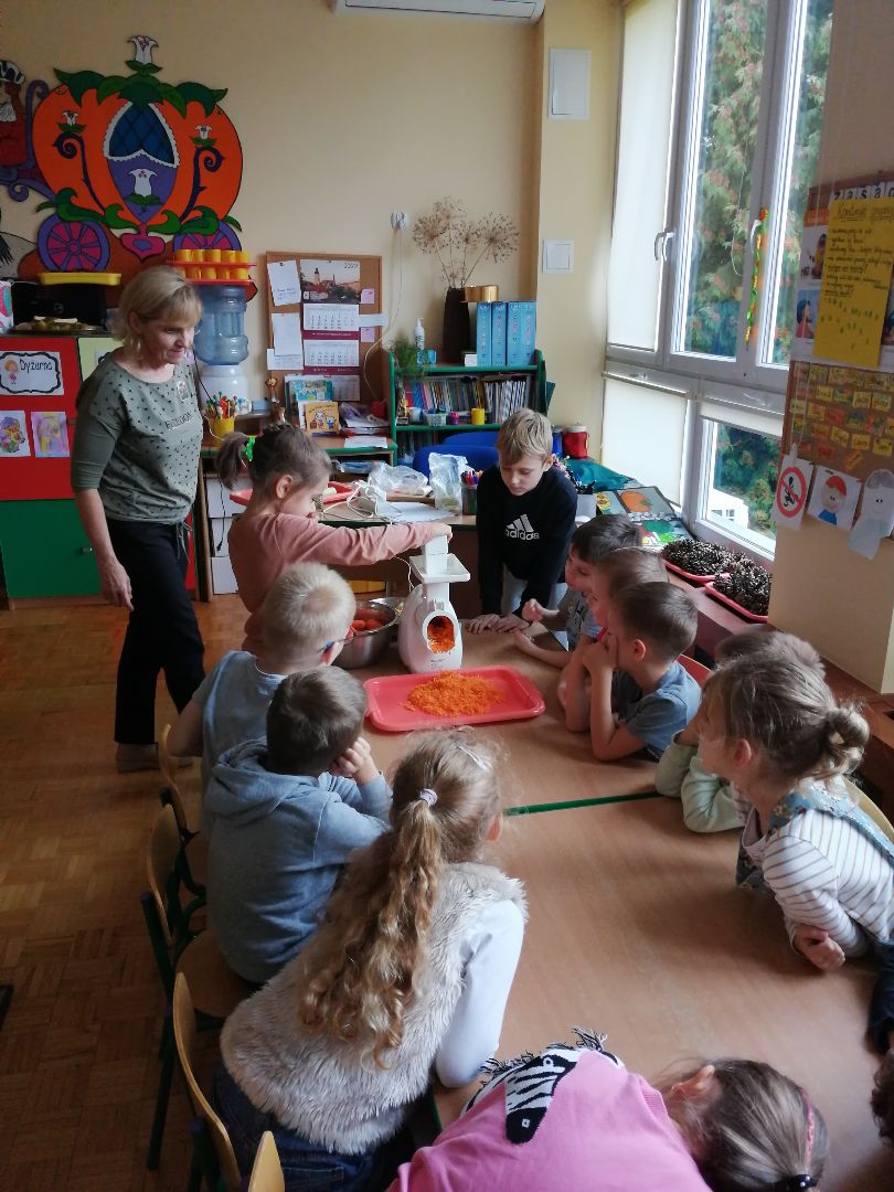W minionym tygodniu rozmawialiśmy na temat jesiennych prac w ogrodzie. Obchodziliśmy szóste urodziny naszej koleżanki Hani. Poznaliśmy nową literę E,e jak ekran. Wybraliśmy się na wycieczkę na ryneczek, aby zakupić warzywa do przedszkola. W trakcie zajęć mieliśmy okazję rozpoznawać i nazywać warzywa za pomocą węchu, dotyku, segregować je na odpowiednie tace, przeliczać. Sami zrobiliśmy sobie kanapki z wykorzystaniem różnorodnych warzyw. Przygotowaliśmy smaczną surówkę z marchwi, jabłek i pora. Obejrzeliśmy teatrzyk kukiełkowy na podst. utworu pt.:„Kapuściana dama”( B. Pasiuk) w wykonaniu kolegów z grupy. Wykonaliśmy własne kukiełki z warzyw. Przedszkolaki przyniosły do przedszkola wiele ciekawych okazów warzyw. Niektóre nie potrzebowały wiele, aby stać się zwierzątkiem, znaną postacią…Dzieci z dużym zaangażowaniem realizowały swoje twórcze zamiary. Dziękujemy rodzicom za wzbogacenie naszych zajęć i dostarczanie różnorodnych warzyw.