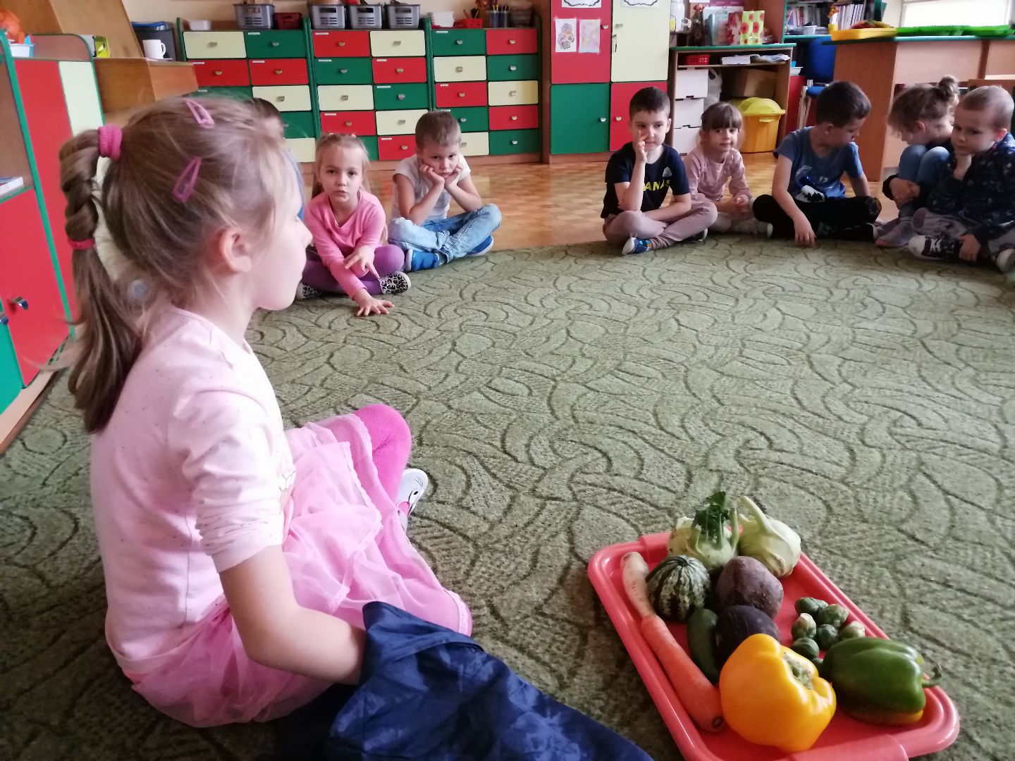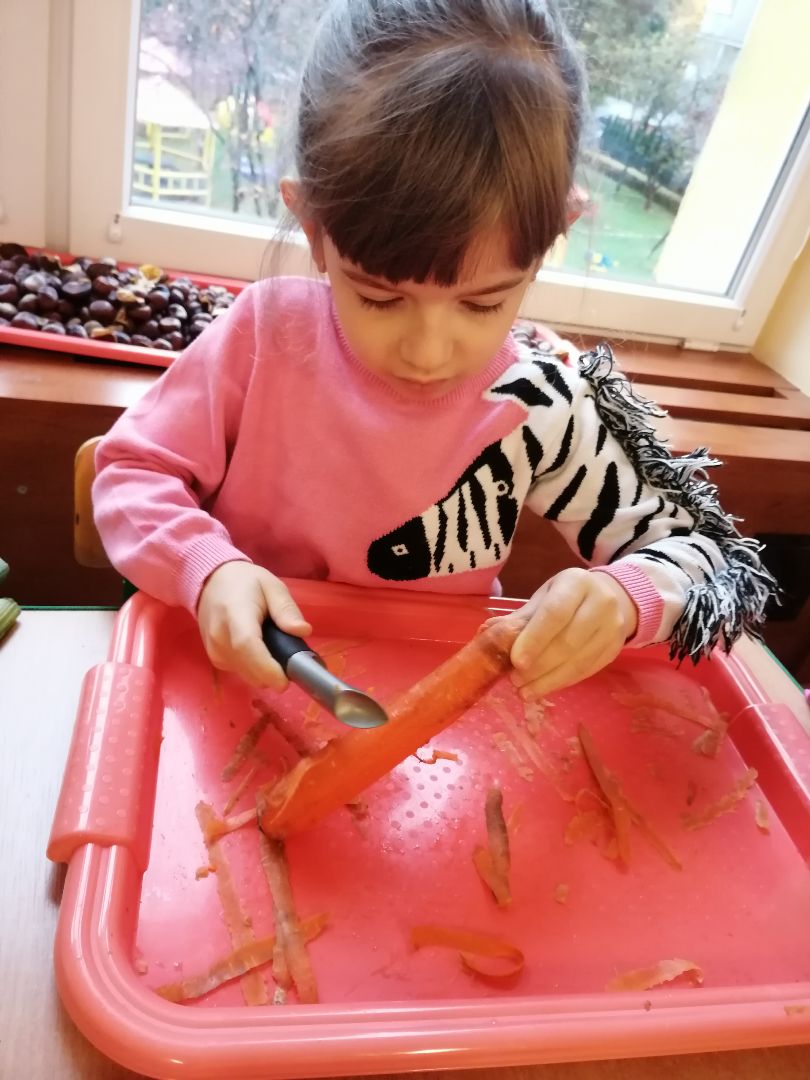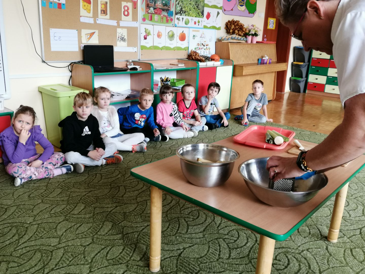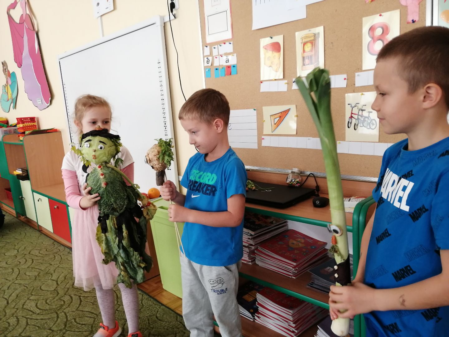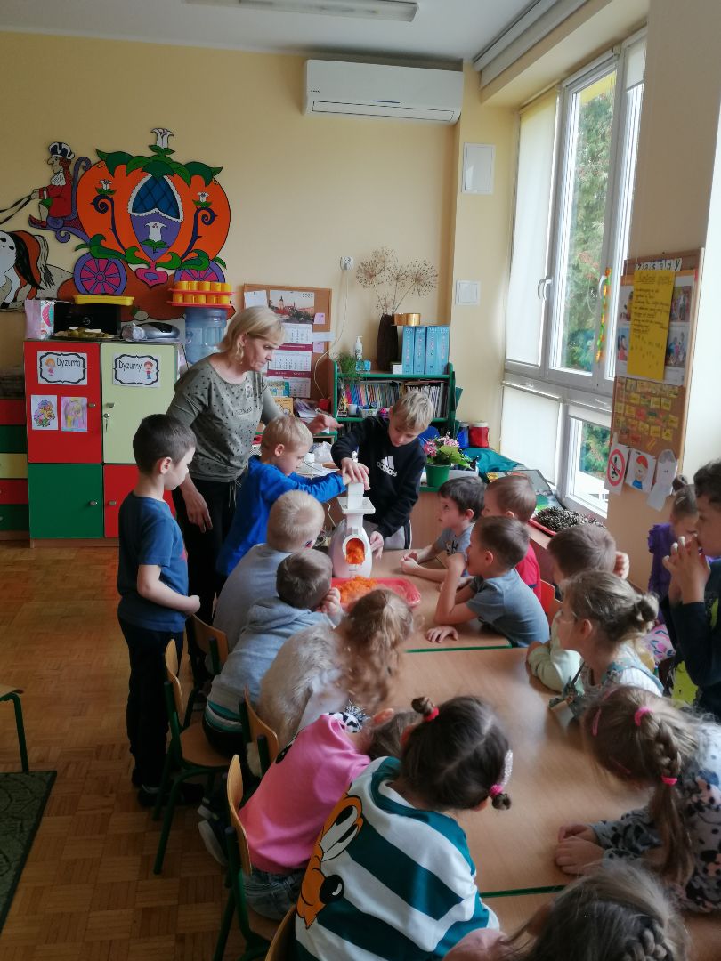 W minionym tygodniu rozmawialiśmy na temat jesiennych prac w ogrodzie. Obchodziliśmy szóste urodziny naszej koleżanki Hani. Poznaliśmy nową literę E,e jak ekran. Wybraliśmy się na wycieczkę na ryneczek, aby zakupić warzywa do przedszkola. W trakcie zajęć mieliśmy okazję rozpoznawać i nazywać warzywa za pomocą węchu, dotyku, segregować je na odpowiednie tace, przeliczać. Sami zrobiliśmy sobie kanapki z wykorzystaniem różnorodnych warzyw. Przygotowaliśmy smaczną surówkę z marchwi, jabłek i pora. Obejrzeliśmy teatrzyk kukiełkowy na podst. utworu pt.:„Kapuściana dama”( B. Pasiuk) w wykonaniu kolegów z grupy. Wykonaliśmy własne kukiełki z warzyw. Przedszkolaki przyniosły do przedszkola wiele ciekawych okazów warzyw. Niektóre nie potrzebowały wiele, aby stać się zwierzątkiem, znaną postacią…Dzieci z dużym zaangażowaniem realizowały swoje twórcze zamiary. Dziękujemy rodzicom za wzbogacenie naszych zajęć i dostarczanie różnorodnych warzyw.