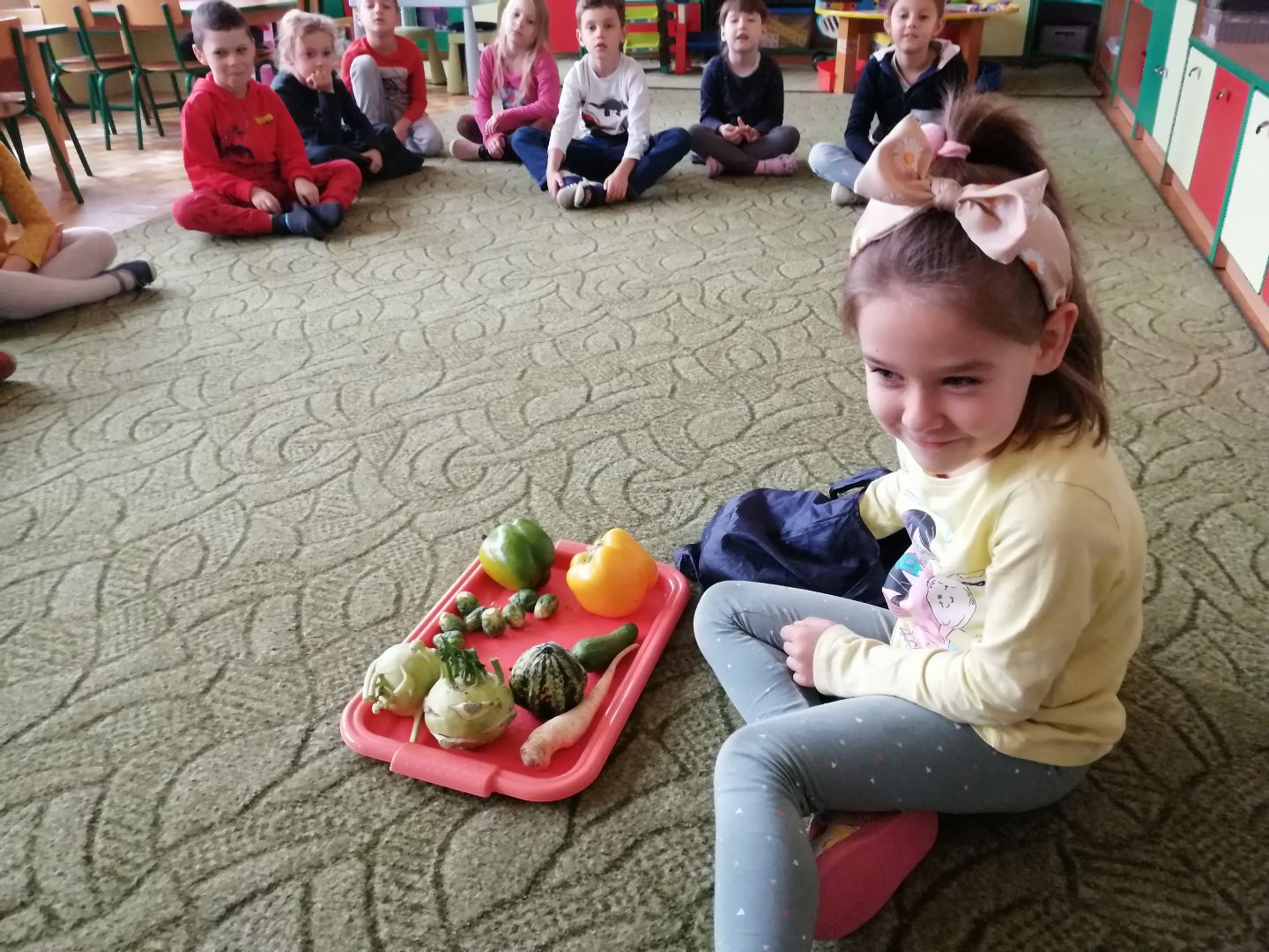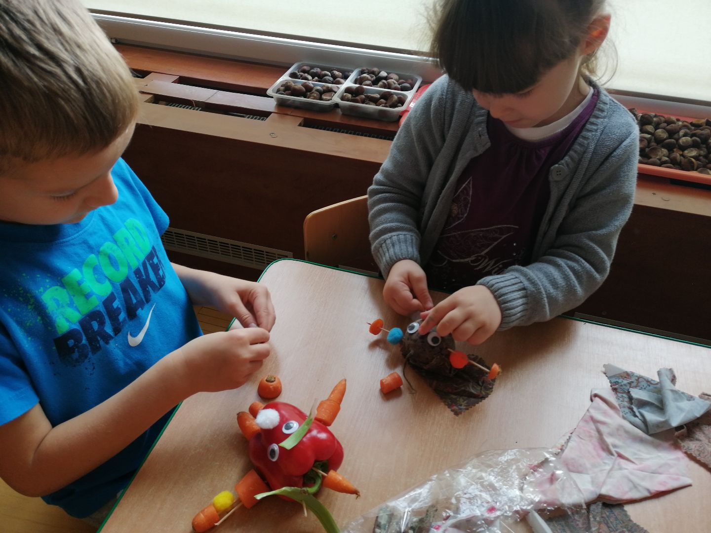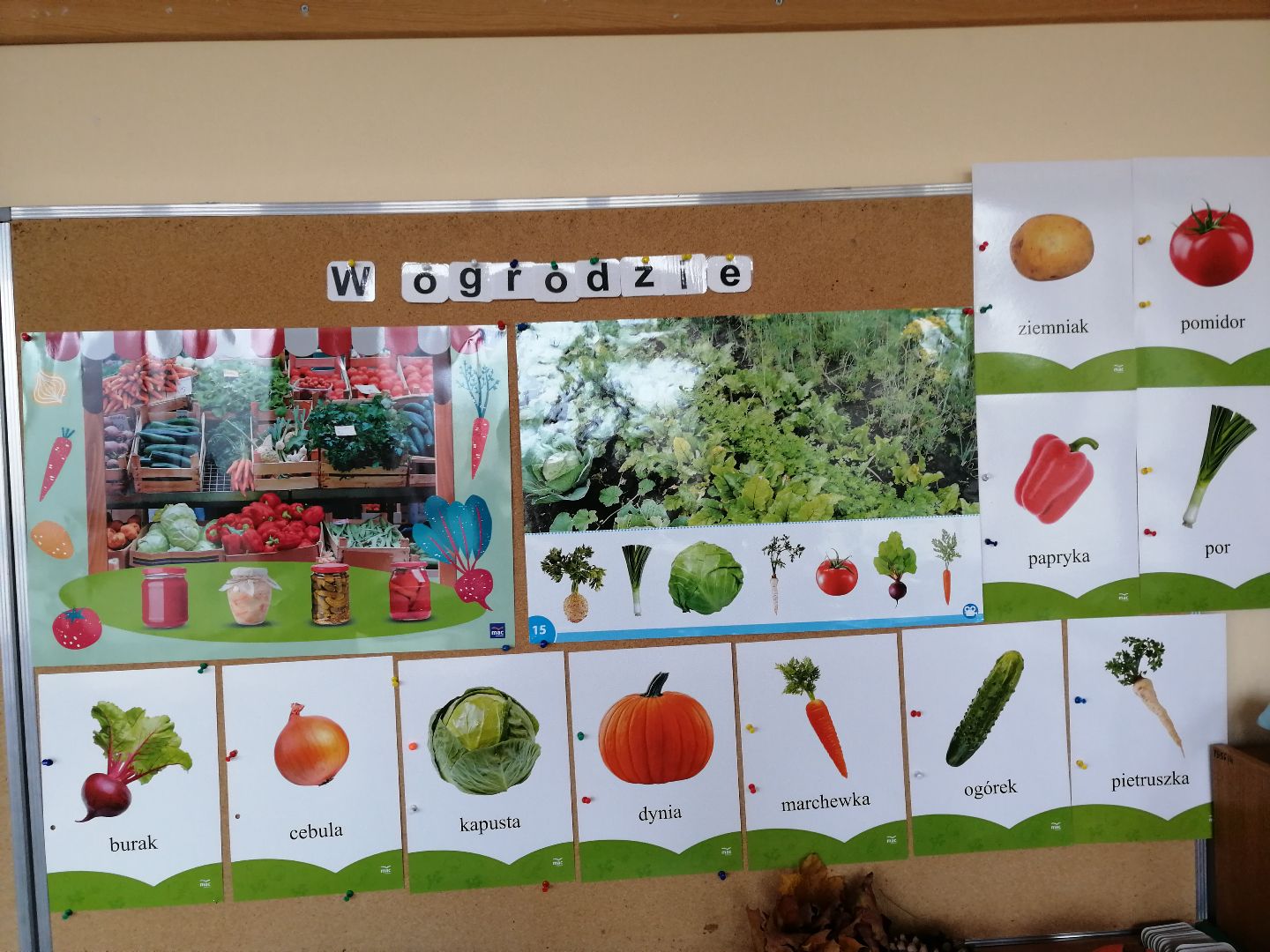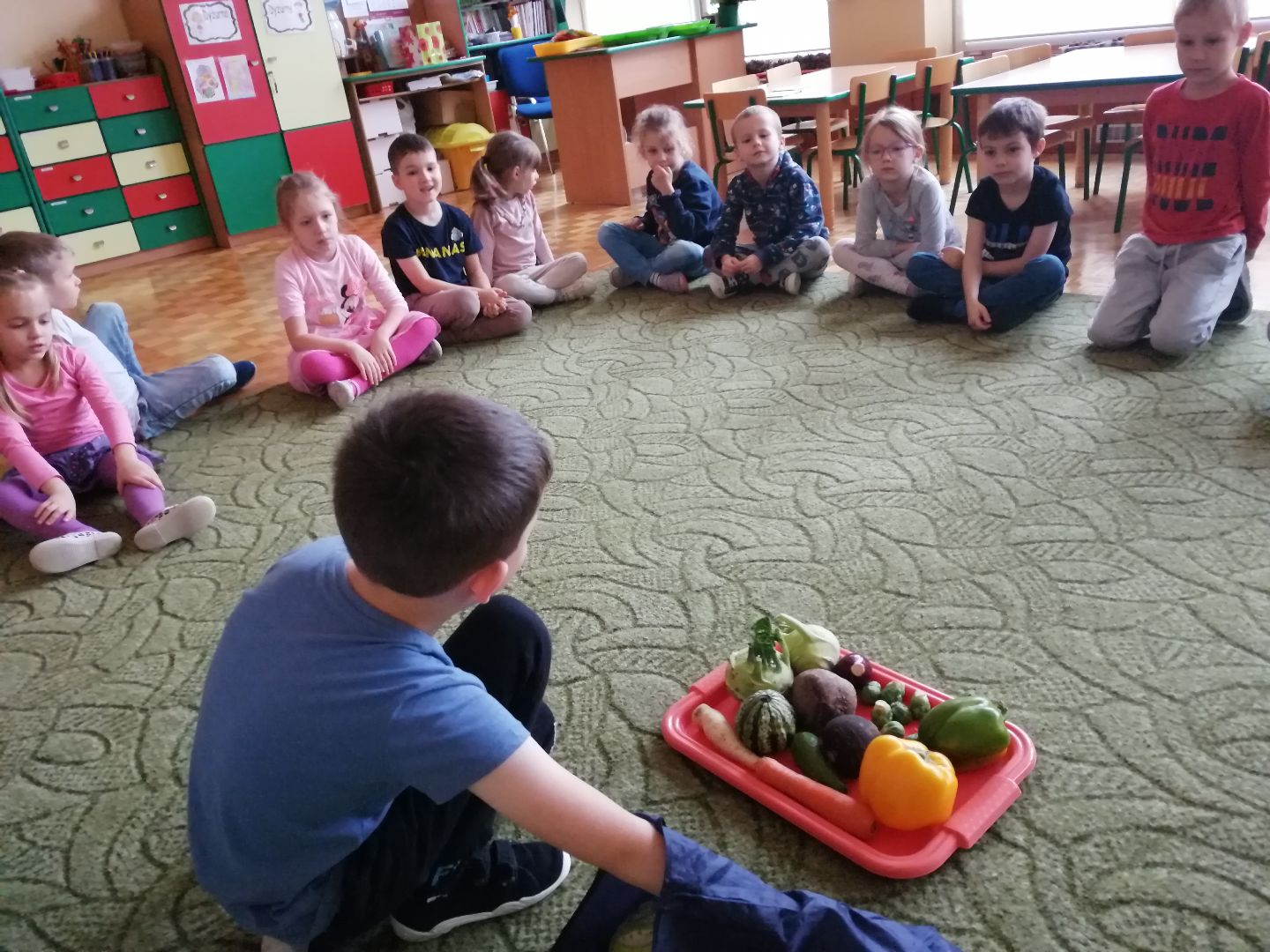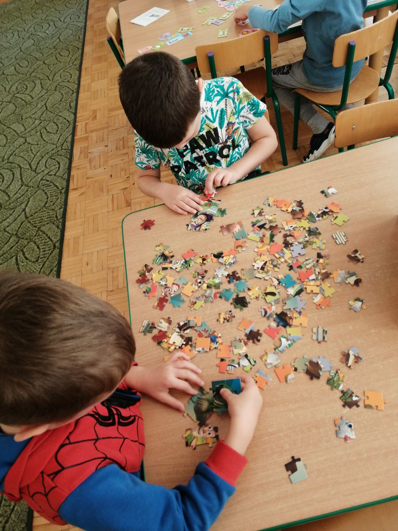 W minionym tygodniu rozmawialiśmy na temat jesiennych prac w ogrodzie. Obchodziliśmy szóste urodziny naszej koleżanki Hani. Poznaliśmy nową literę E,e jak ekran. Wybraliśmy się na wycieczkę na ryneczek, aby zakupić warzywa do przedszkola. W trakcie zajęć mieliśmy okazję rozpoznawać i nazywać warzywa za pomocą węchu, dotyku, segregować je na odpowiednie tace, przeliczać. Sami zrobiliśmy sobie kanapki z wykorzystaniem różnorodnych warzyw. Przygotowaliśmy smaczną surówkę z marchwi, jabłek i pora. Obejrzeliśmy teatrzyk kukiełkowy na podst. utworu pt.:„Kapuściana dama”( B. Pasiuk) w wykonaniu kolegów z grupy. Wykonaliśmy własne kukiełki z warzyw. Przedszkolaki przyniosły do przedszkola wiele ciekawych okazów warzyw. Niektóre nie potrzebowały wiele, aby stać się zwierzątkiem, znaną postacią…Dzieci z dużym zaangażowaniem realizowały swoje twórcze zamiary. Dziękujemy rodzicom za wzbogacenie naszych zajęć i dostarczanie różnorodnych warzyw.