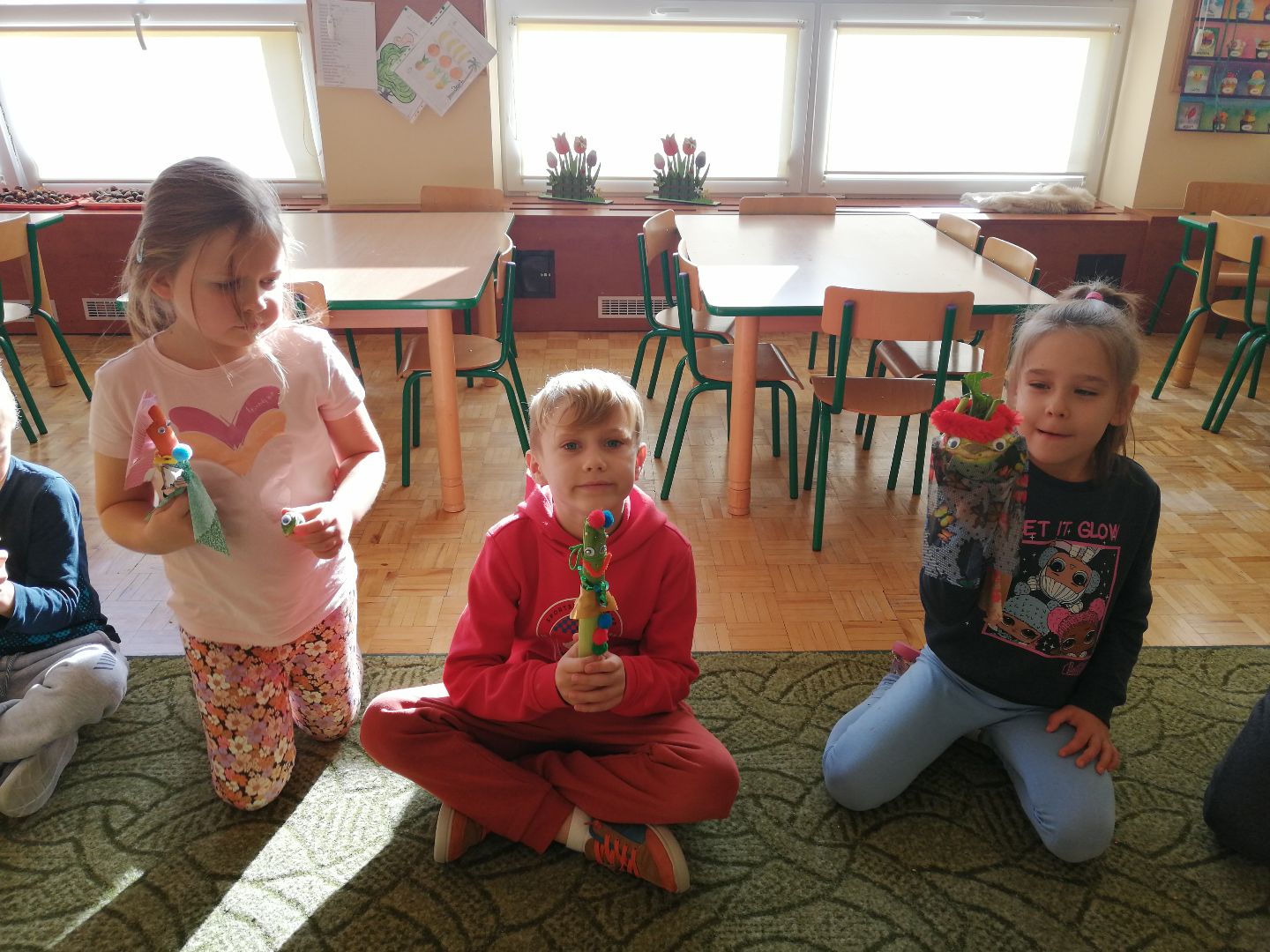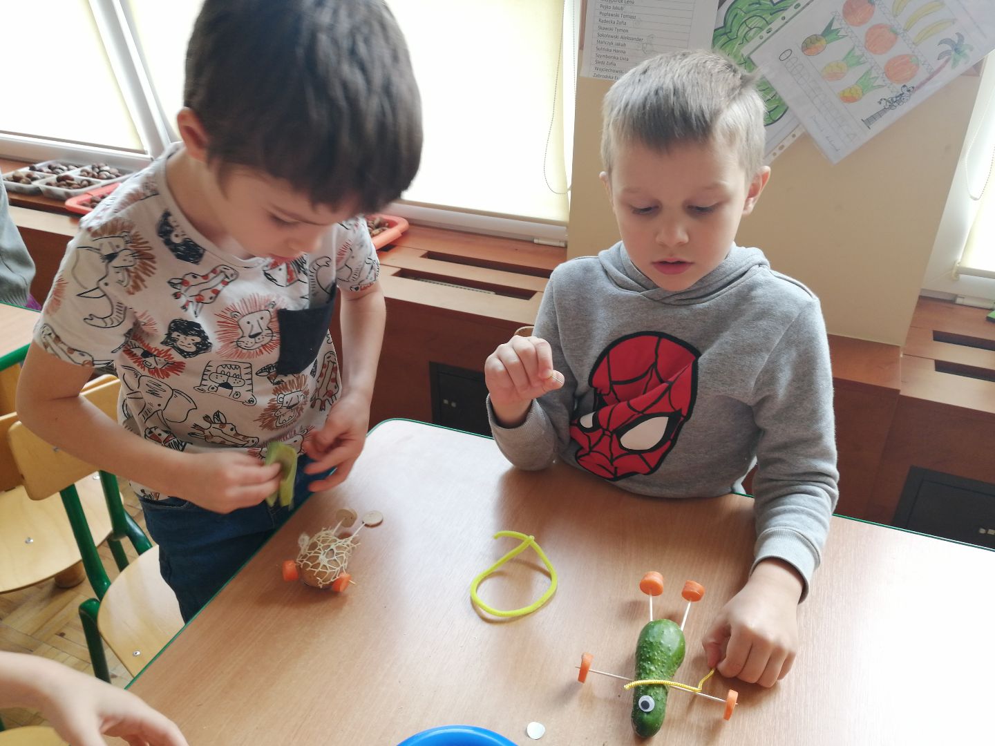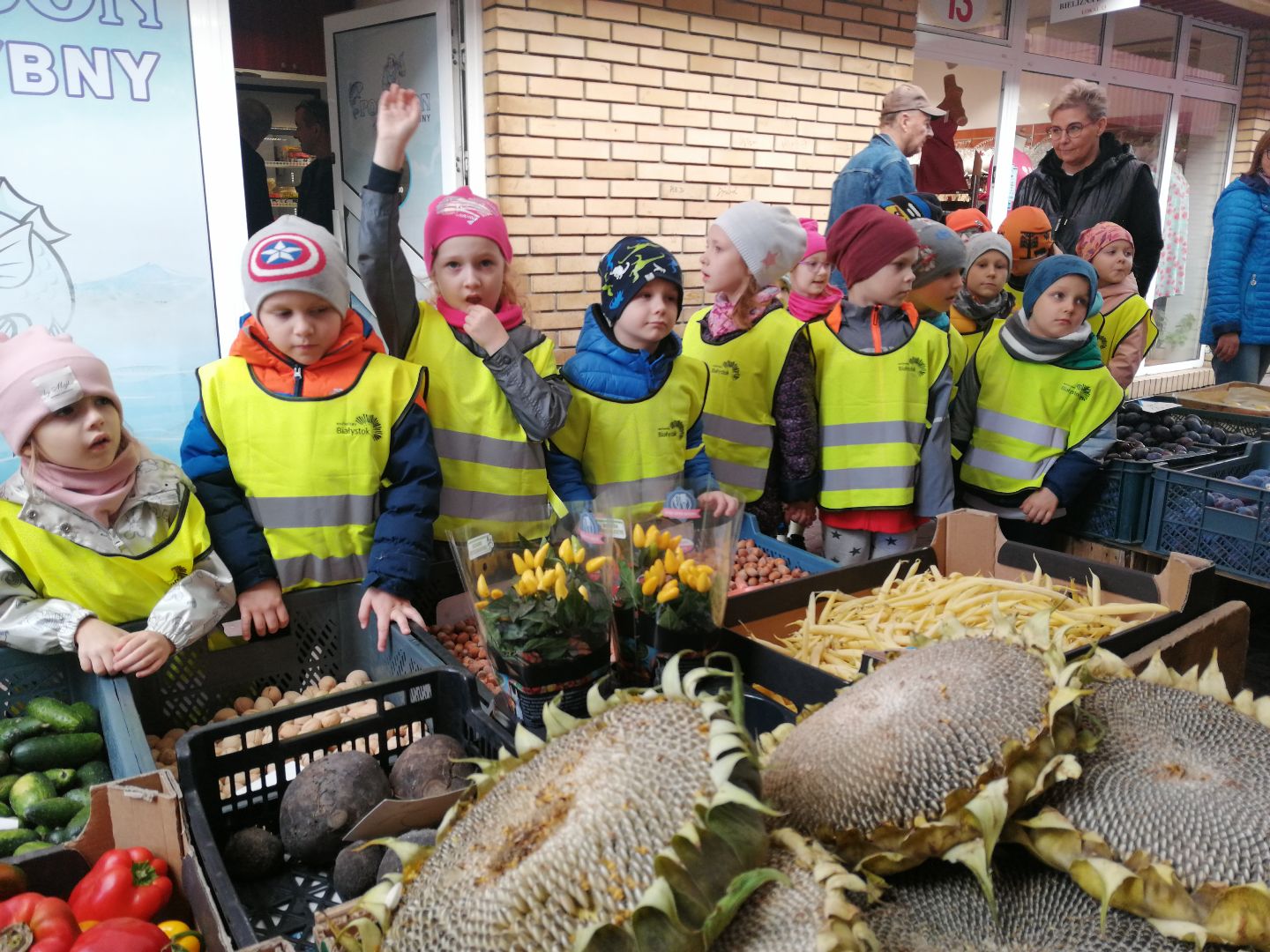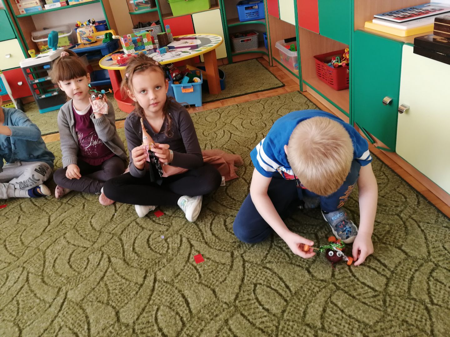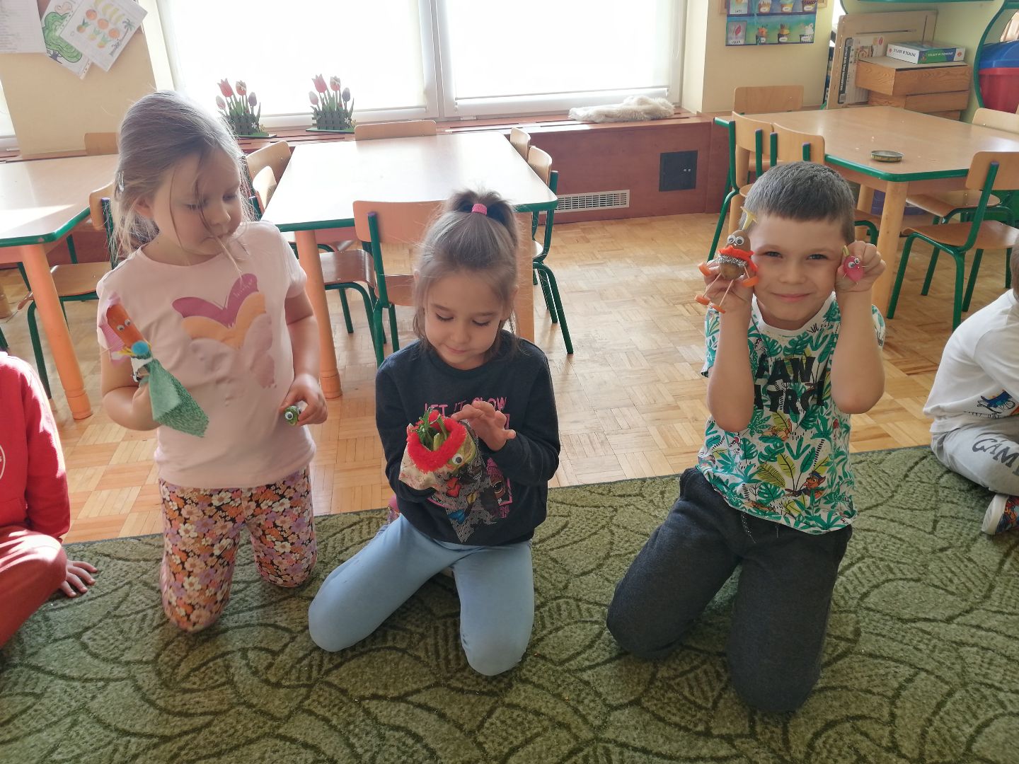 W minionym tygodniu rozmawialiśmy na temat jesiennych prac w ogrodzie. Obchodziliśmy szóste urodziny naszej koleżanki Hani. Poznaliśmy nową literę E,e jak ekran. Wybraliśmy się na wycieczkę na ryneczek, aby zakupić warzywa do przedszkola. W trakcie zajęć mieliśmy okazję rozpoznawać i nazywać warzywa za pomocą węchu, dotyku, segregować je na odpowiednie tace, przeliczać. Sami zrobiliśmy sobie kanapki z wykorzystaniem różnorodnych warzyw. Przygotowaliśmy smaczną surówkę z marchwi, jabłek i pora. Obejrzeliśmy teatrzyk kukiełkowy na podst. utworu pt.:„Kapuściana dama”( B. Pasiuk) w wykonaniu kolegów z grupy. Wykonaliśmy własne kukiełki z warzyw. Przedszkolaki przyniosły do przedszkola wiele ciekawych okazów warzyw. Niektóre nie potrzebowały wiele, aby stać się zwierzątkiem, znaną postacią…Dzieci z dużym zaangażowaniem realizowały swoje twórcze zamiary. Dziękujemy rodzicom za wzbogacenie naszych zajęć i dostarczanie różnorodnych warzyw.