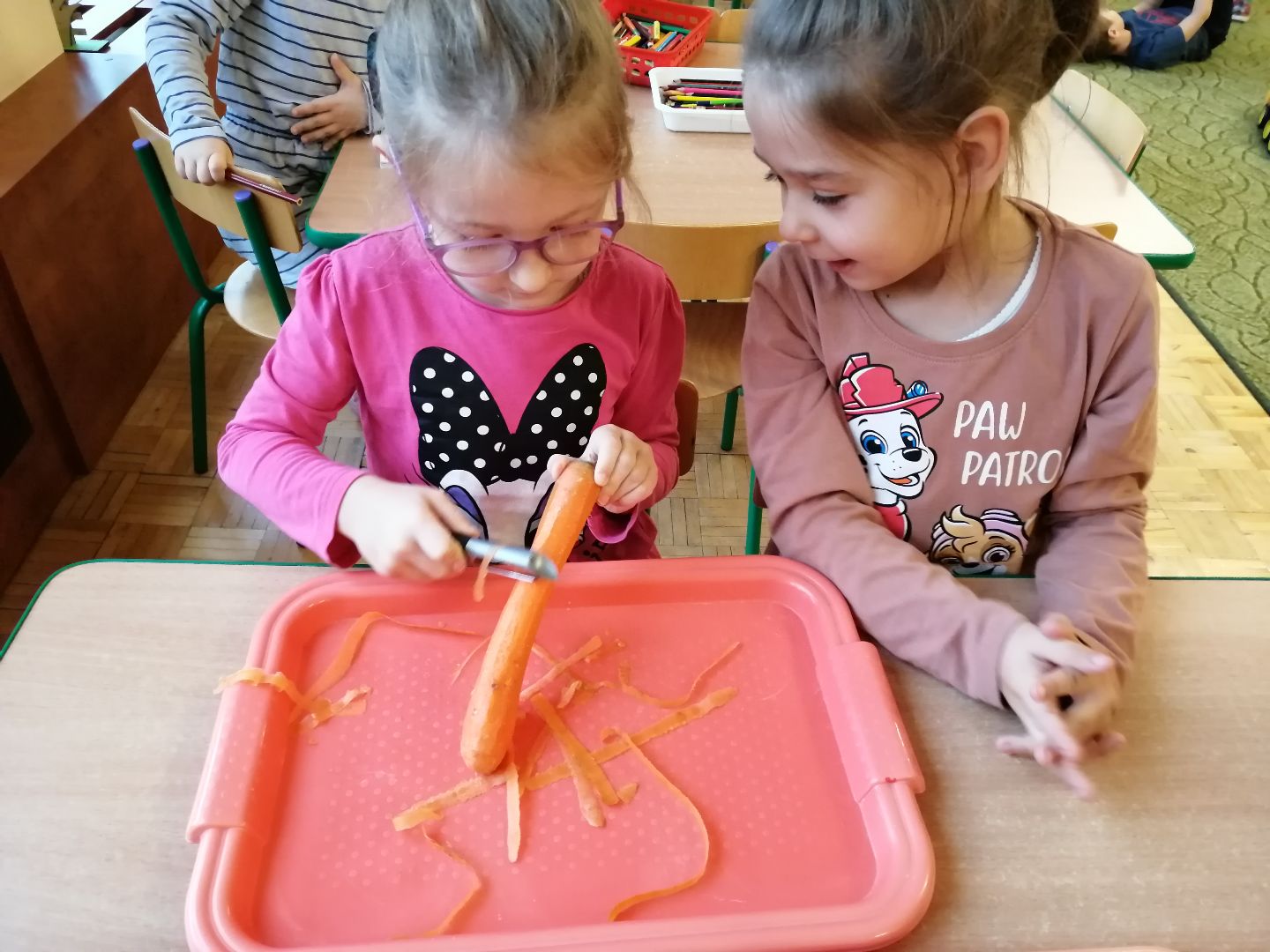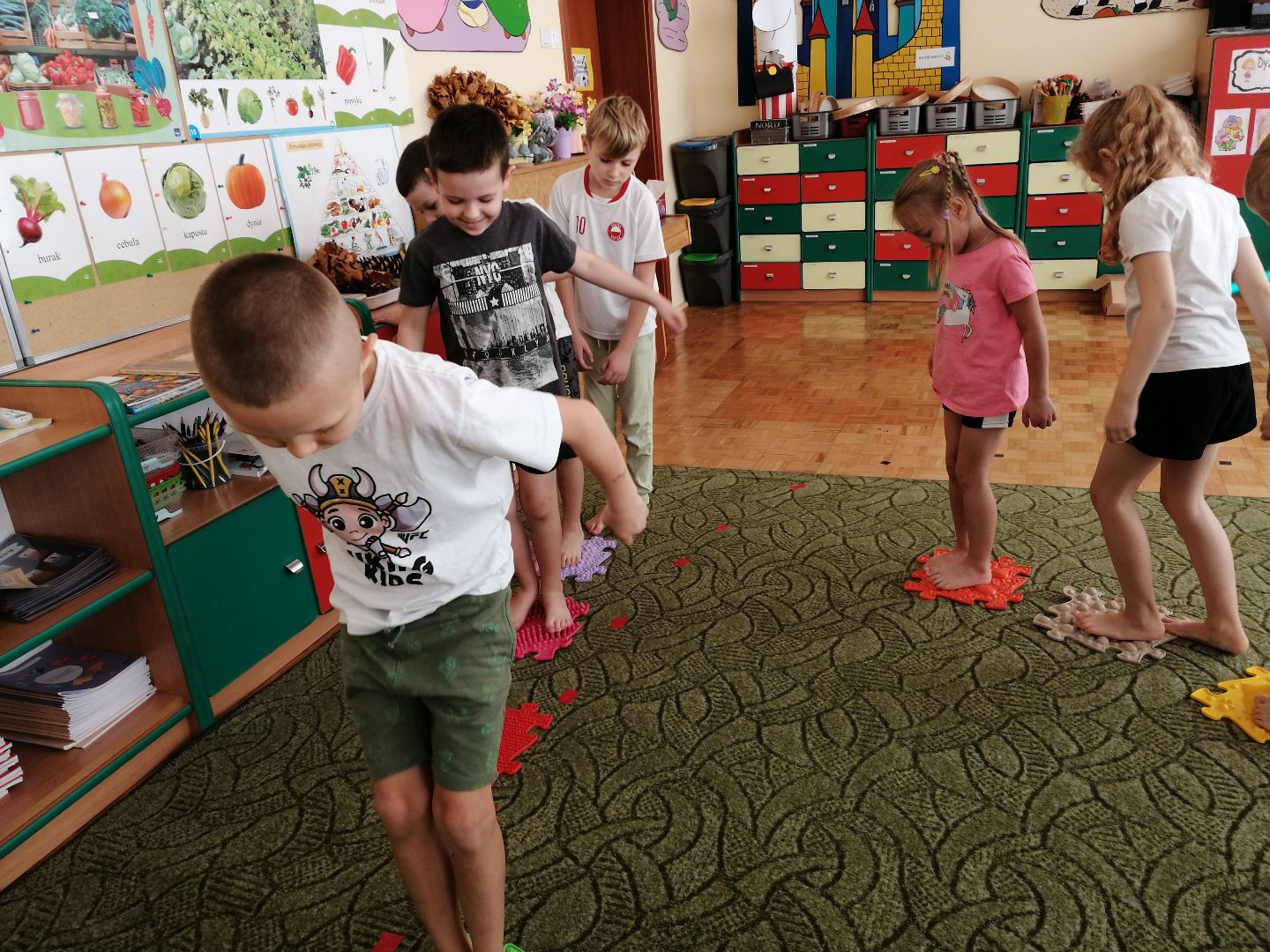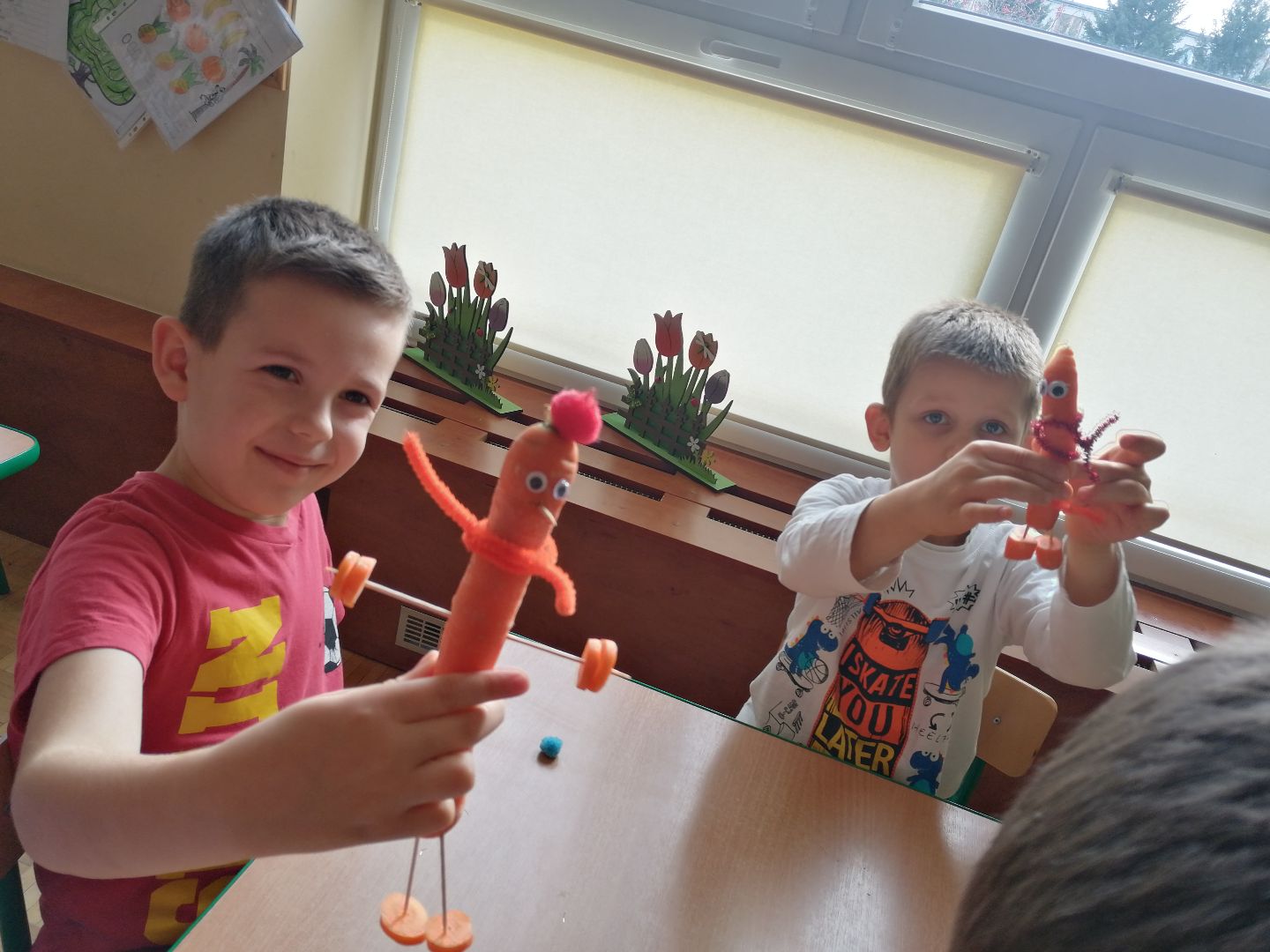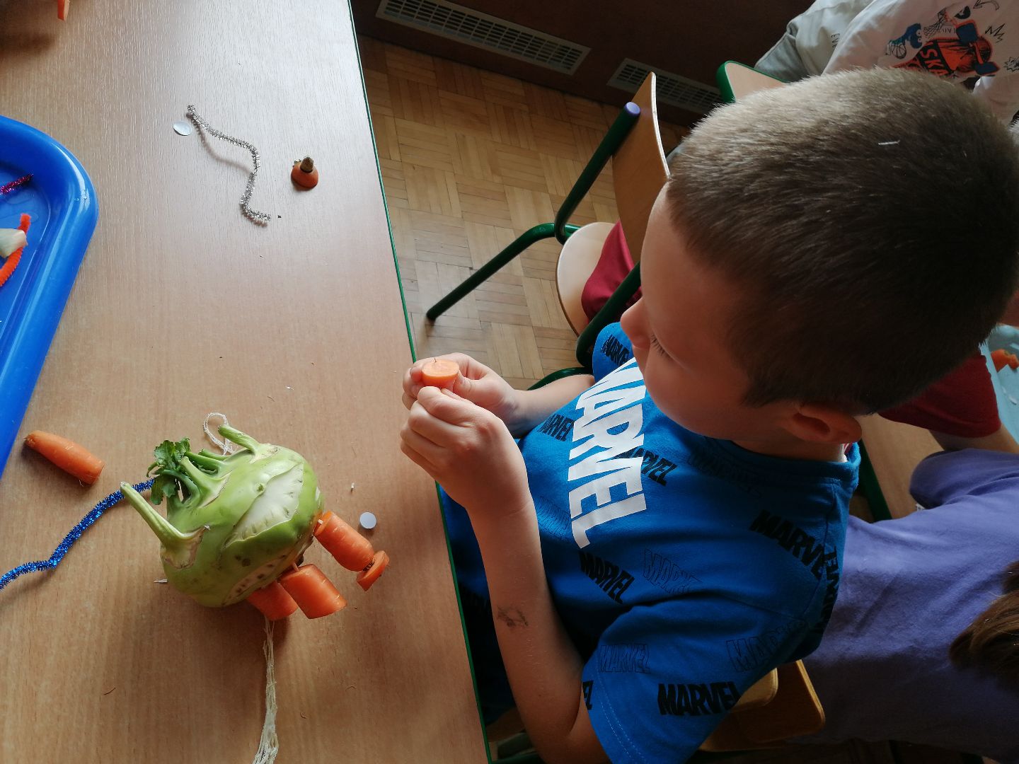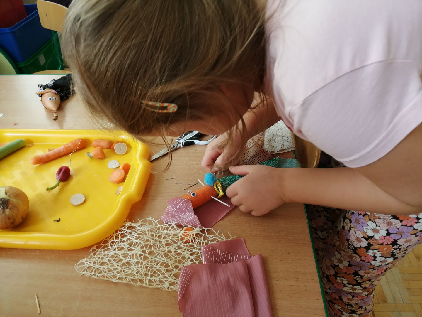 W minionym tygodniu rozmawialiśmy na temat jesiennych prac w ogrodzie. Obchodziliśmy szóste urodziny naszej koleżanki Hani. Poznaliśmy nową literę E,e jak ekran. Wybraliśmy się na wycieczkę na ryneczek, aby zakupić warzywa do przedszkola. W trakcie zajęć mieliśmy okazję rozpoznawać i nazywać warzywa za pomocą węchu, dotyku, segregować je na odpowiednie tace, przeliczać. Sami zrobiliśmy sobie kanapki z wykorzystaniem różnorodnych warzyw. Przygotowaliśmy smaczną surówkę z marchwi, jabłek i pora. Obejrzeliśmy teatrzyk kukiełkowy na podst. utworu pt.:„Kapuściana dama”( B. Pasiuk) w wykonaniu kolegów z grupy. Wykonaliśmy własne kukiełki z warzyw. Przedszkolaki przyniosły do przedszkola wiele ciekawych okazów warzyw. Niektóre nie potrzebowały wiele, aby stać się zwierzątkiem, znaną postacią…Dzieci z dużym zaangażowaniem realizowały swoje twórcze zamiary. Dziękujemy rodzicom za wzbogacenie naszych zajęć i dostarczanie różnorodnych warzyw.