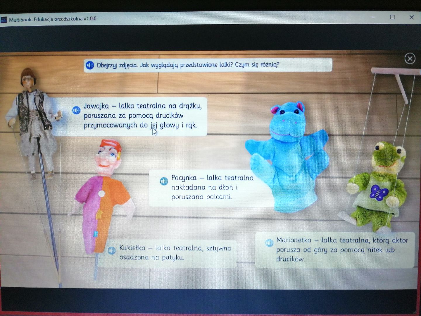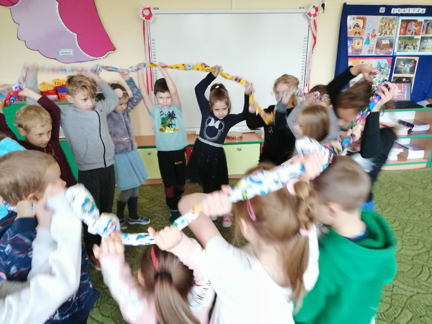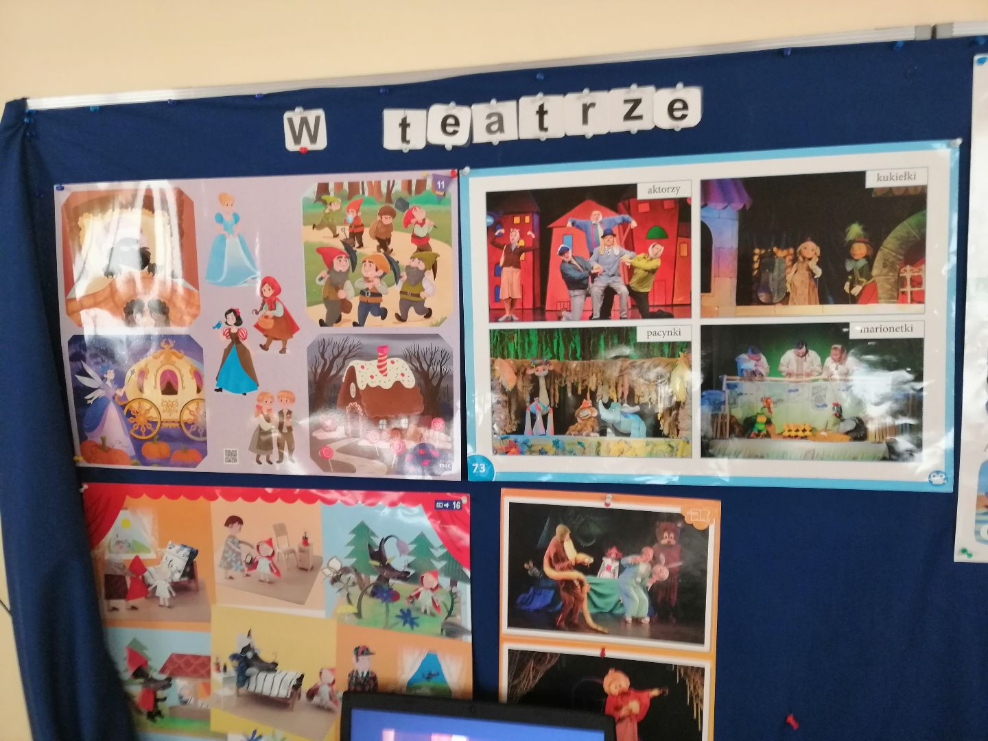 W minionym tygodniu rozmawialiśmy o teatrze. Dzieci wzbogaciły słownictwo o nowe pojęcia min.: scena, widownia, kurtyna, dekoracja teatralna, maska, kukiełka, pacynka, pantomima, jawajka, marionetka itp. Wykonały kukiełki wykorzystując różnorodne materiały plastyczne. Obejrzały przedstawienie teatralne z wykorzystaniem teatrzyku cieni pt.:„ O rybaku i złotej rybce”. Dowiedziały się jak powstaje cień. Przedszkolacy wcielili się w rolę aktorów -przedstawili bajkę pt.: „Czerwony Kapturek”. Poznaliśmy nową literę t, T jak „tata”, „Tola”. Uczyliśmy się wskazywać przyczynę i przewidywać skutek - przeprowadziliśmy doświadczenia min. z wodą i cukrem, wodą i solą, wodą i cytryną, pogiętą kartką papieru, pociętą kartką. Ustalaliśmy, które zmiany są, a które nie są odwracalne. Poznaliśmy nową piosenkę pt.: „Magiczne miejsce” oraz wiersz pt.: Jana Brzechwy „Tańcowała igła z nitką”(zamieszczone w materiałach w załączniku). To były pracowite dni:)
