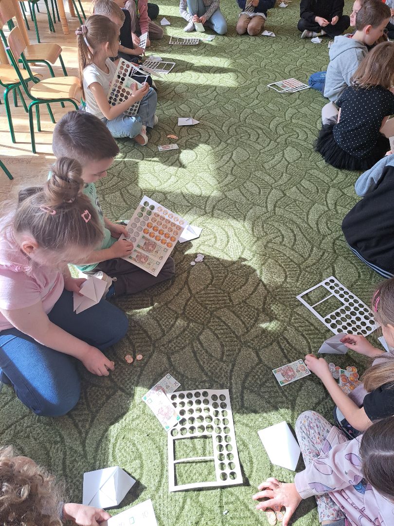 - Mały bankier - zapoznanie z banknotami i monetami, rozmienianie banknotów