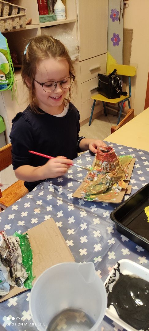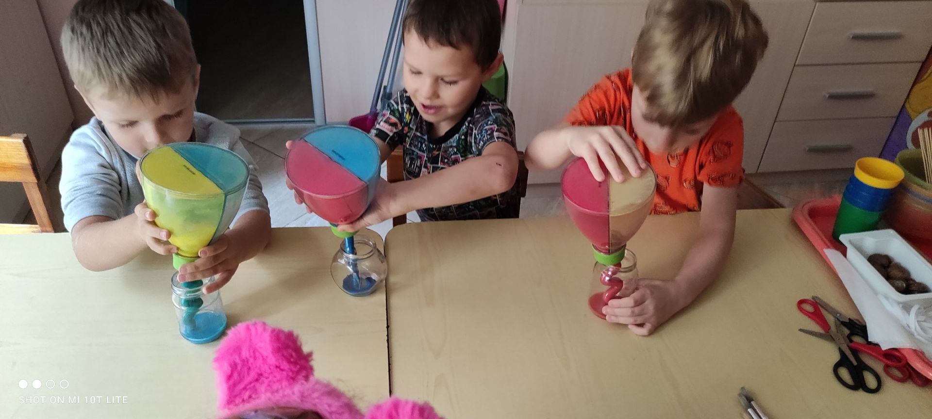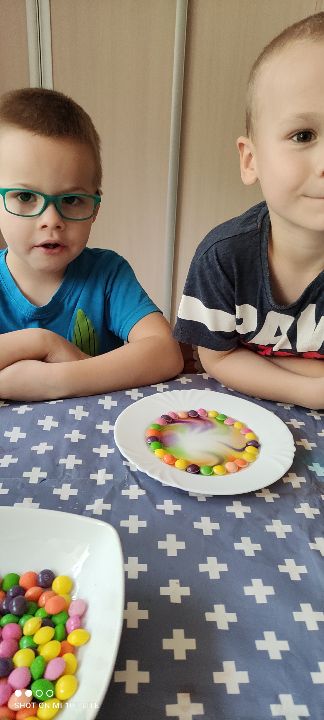 15 X 2021 Podobnie jak młodsi koledzy bawiliśmy się kolorami. Zrobiliśmy jesienną herbatkę i obserwowaliśmy parowanie i skraplanie- czyli deszczyk też był:). Oczywiście mieszaliśmy kolory na różne sposoby. Nie zabrakło informacji o nas samych- musimy się przecież poznać. No i w związku z informacją, że wszyscy lubimy cukierki, zrobiliśmy kolorową tęczę z popularnych cukierków i co? Resztę niech dzieci opowiedzą- barwniki, chemia, cukier....