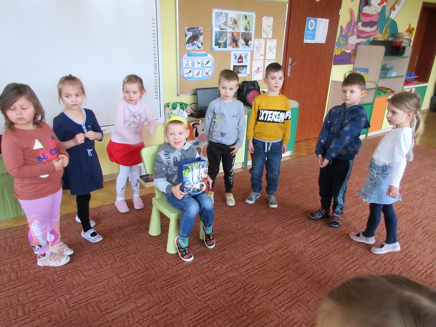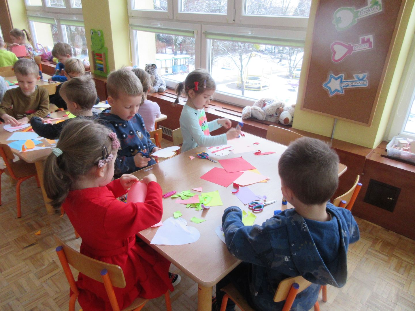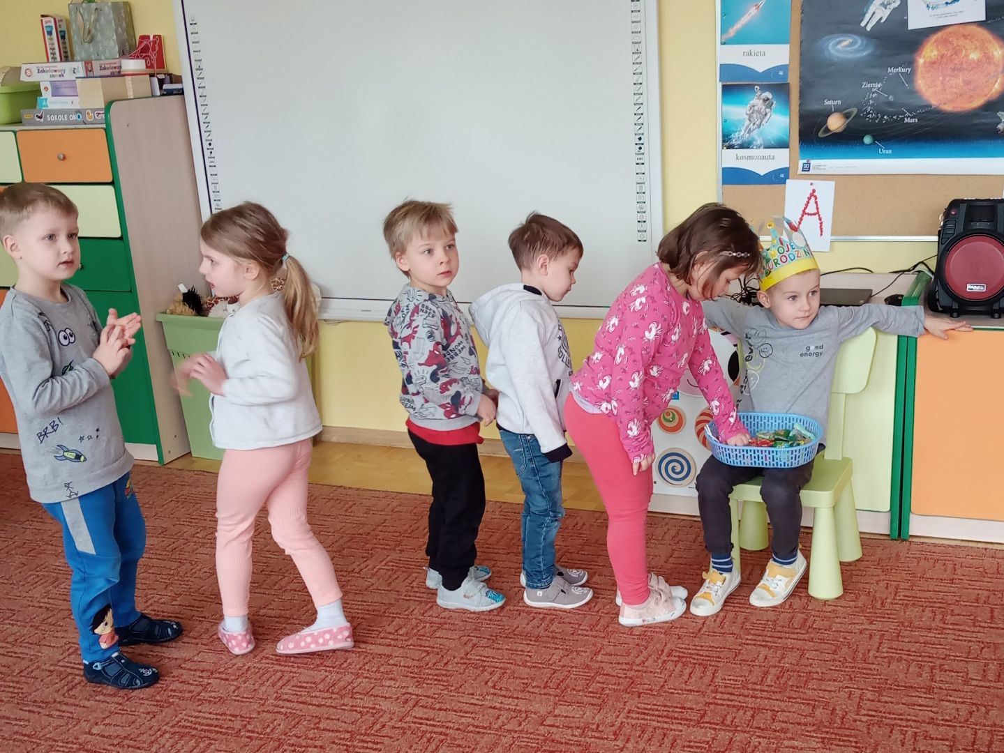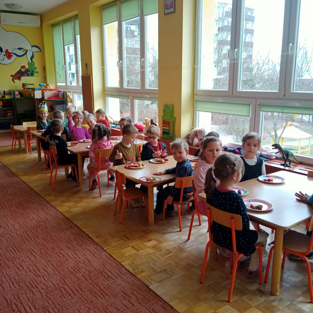 W tym tygodniu przeleciało jak z bicza trzasnął może temu, że ciągle rozmawialiśmy ... o czasie (: o zegarach, o różnych sposobach mierzenia go dawniej i dziś, o dniach i nocach, o porach roku. Wycinaliśmy zegary z kukułką. Tańczyliśmy z pomponami do muzyki z filmu „Wallace and Gromit”. Pokonywaliśmy tory przeszkód. Inscenizowaliśmy wiersz J. Tuwima „Rzepka”. Obejrzeliśmy piękną opowieść o przyjaźni pluszowych zwierzaków w wykonaniu teatru „Conieco”. Tydzień zaczął się wspaniale piątymi urodzinami naszej koleżanki!....A skończył się przepysznie naleśnikami z serem i polewą!
