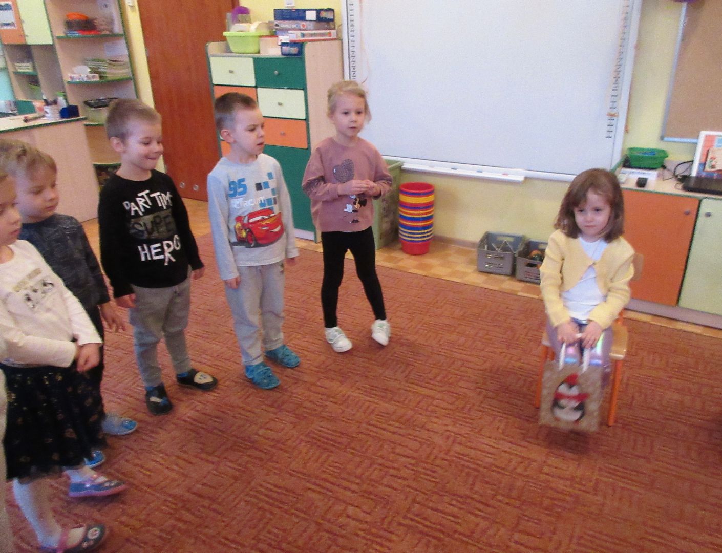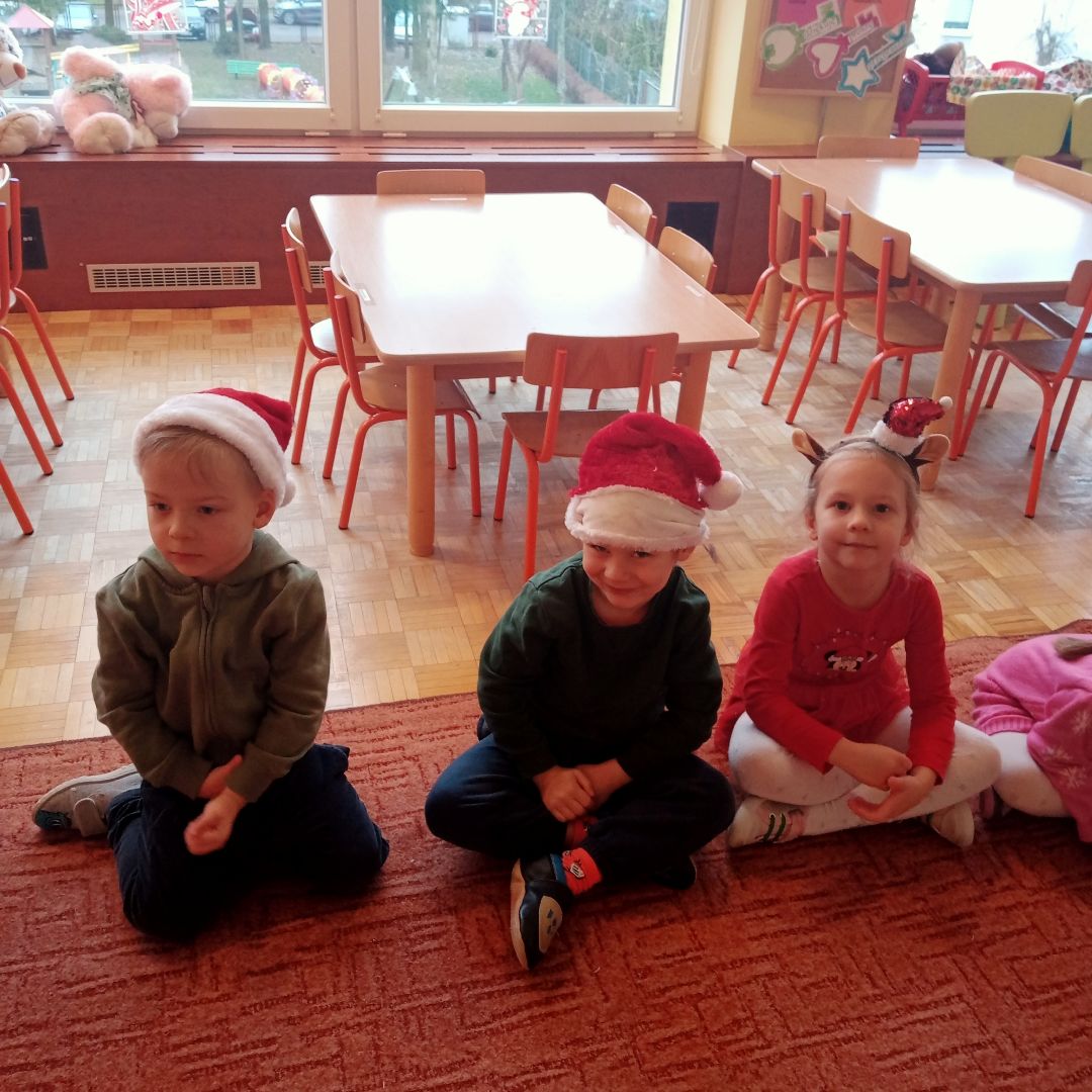 Dzieci w pierwszym tygodniu zimy uczyły się wiersza D. Gellner „Portret zimy”, śpiewały piosenkę "Tupu, tup po śniegu", kolorowały zimowy obrazek, dorysowywały śnieżynkom brakujące elementy, tworzyły padający śnieg metodą stemplowania i odbijania, poznawały cechy charakterystyczne dla zimowej pory roku, dostrzegały i powodowały zmiany odwracalne, grały kolędę „Jezusa narodzonego” na bum rurkach, uczestniczyły w zajęciach bibliotecznych w pobliskiej, osiedlowej bibliotece - poznawały wybrane zwyczaje bożonarodzeniowe w Polsce i na świecie i oczywiście bawiły się na placu w zimowej scenerii.