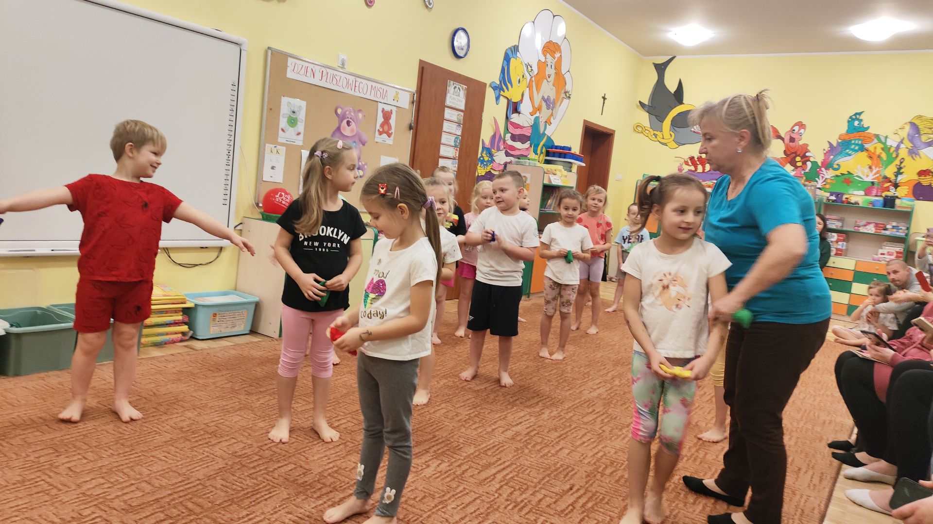 W poniedziałek p. Ania zaprosiła do ćwiczeń gimnastycznych wszystkie dzieci z gr III, rodzice natomiast licznie oglądali i kibicowali. Dzieci miały za zadanie: przerzucać woreczek z ręki do ręki, chodzić z woreczkiem na głowie, pod kolanem, na kolanie, przeskakiwać obunóż. Gratulujemy wszystkim przedszkolakom byliście fantastyczni!!!!