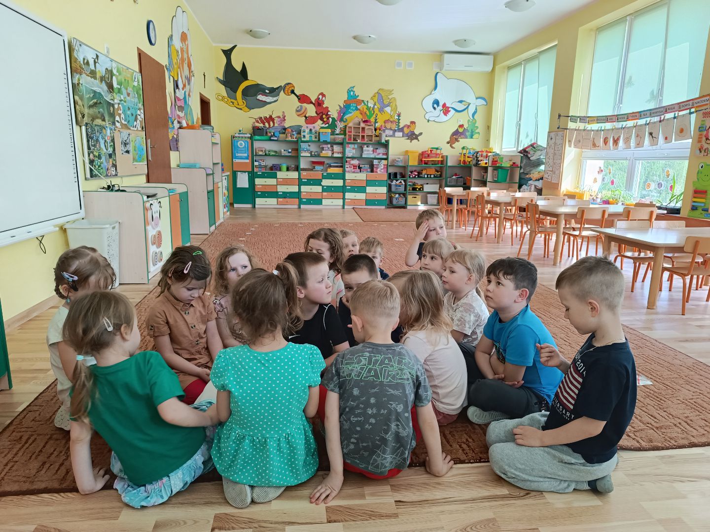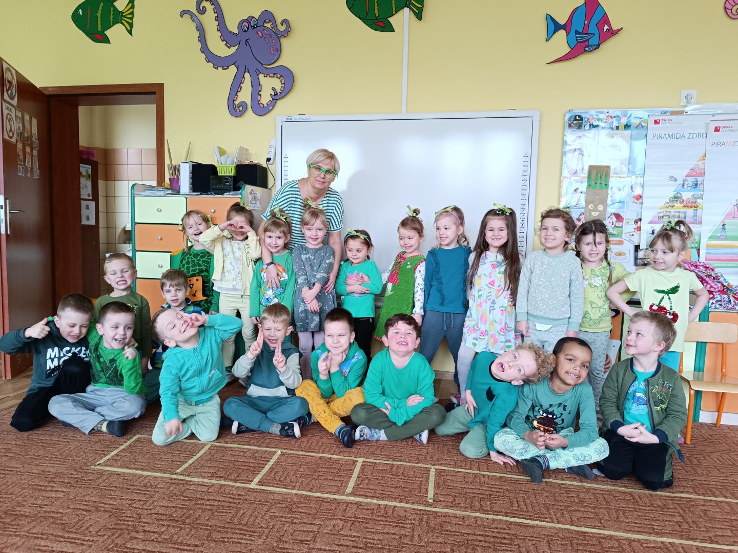 W tym tygodniu piątek to Dzień zielonego - dzieciaki ubrane na zielono zrobiły samodzielnie zielone kanapki - łódeczki - z cykorią, pastą i szczypiorkiem. Śniadanie zostało przygotowane przez wybranych z grupy kelnerów, którzy rozłożyli produkty i naczynia. Po śniadaniu odbyła się zielona gimnastyka i napisaliśmy wspólnie zieloną bajkę o zielonym smoku, dwóch zielonych gąsienicach i zielonej żabie. Na koniec odwiedziliśmy grupę I i II, które również świętowały dzień zielonego.