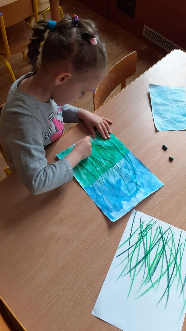 W minionym tygodniu rozmawialiśmy o łące. Poznawaliśmy i nazywaliśmy rośliny i zwierzęta występujące w tym ekosystemie. Dzieci przypomniały sobie cykl rozwojowy żaby i poszerzyły swoje wiadomości o cykl rozwojowy motyla. Ponadto dowiedziały się co to jest barwa ochronna i jaką spełnia rolę w życiu zwierząt. Dzieci wykonały collage przedstawiający łąkę wykorzystując farby akwarelowe, pastele olejne, stemplowanie patyczkiem do uszu i farbą plakatową oraz kolorowy papier.
