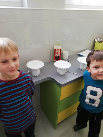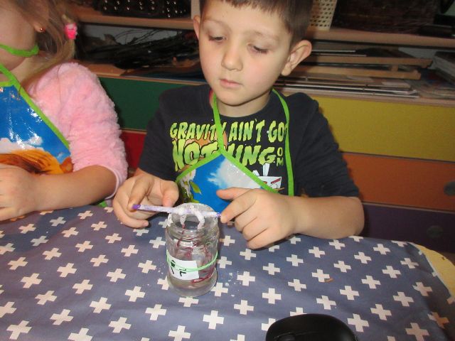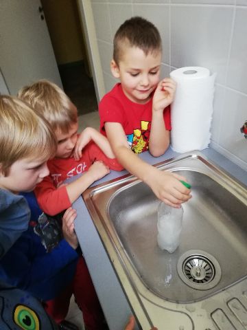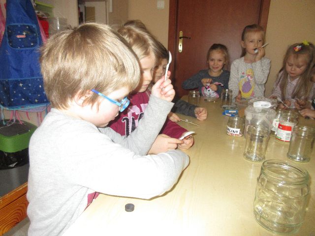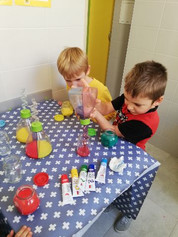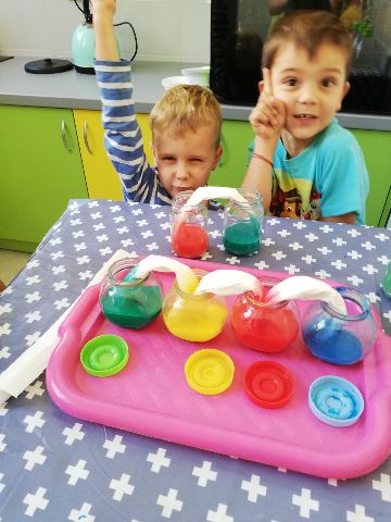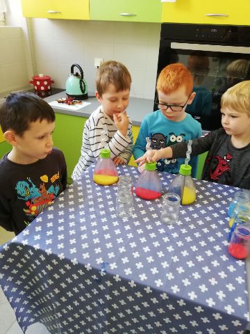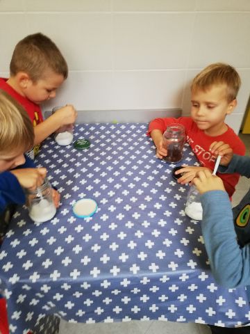Zajęcia z dziećmi z grupy V. ROZPUSZCZALNOŚĆ oraz utrwalenie wiadomości o mieszaniu kolorów. Oczywiście chłopcy również wykonali swoje małe wulkany.