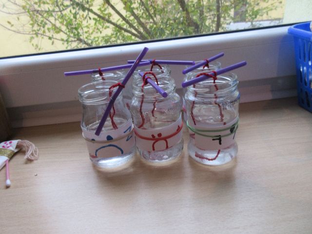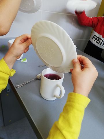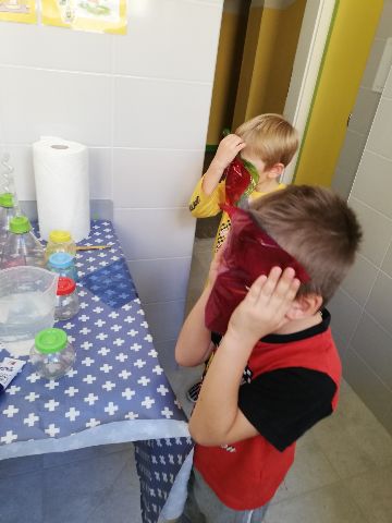 Właśnie herbatka była fajnym wprowadzeniem w temat. Oczywiście zajęcia naszego KOŁA są niepowtarzalne, bo co roku są inne niepowtarzalne dzieciaki ze swoimi niepowtarzalnymi pomysłami, pytaniami.....Jak się okazało cukier świetnie rozpuszcza się w gorącej wodzie ale nie wszystkim podobało się picie gorącej herbatki no i.... postanowiliśmy jedną torebkę owocowej herbatki zalać zimną wodą i co? Zapytajcie dzieci! Zbadaliśmy rozpuszczanie cukru i soli w wodzie - poszło bez trudu i postanowiliśmy odzyskać naszą sól i cukier. Ciekawe czy się uda? Dzieci przygotowały swoje własne próbki do badań, oznaczyły (zakodowały) swoje próbki. 3 próbki to woda z solą, 2 woda z cukrem i 1 woda z solą i cukrem. Na wyniki tego badania poczekamy kilka dni. Kolejne badania dotyczyły powietrza - butelka, pusta butelka okazała się pełną - pełną powietrza! Sprawdzaliśmy to wkładając buteleczkę do wody no i co? Z pustej by przecież nic nie wychodziło a tu bąbelki - powietrza. Później zabawa z balonami - dmuchanie, gniecenie i zabawa z wodą ( Wiecie czemu dzieciaki to lubią? Bo ochlapać się wodą to wielka frajda!). Powietrze sprężaliśmy też przy użyciu strzykawek - już nikt nie mówił, że strzykawki są puste! No i ciekawostka - jak napełnić balon bez dmuchania? Nałożony na buteleczkę balonik wstawiliśmy do gorącej wody i co? Zapytajcie dzieci - po tym doświadczeniu dzieciaki szybko odpowiedziały, że już wiedzą dlaczego podgrzewa się powietrze w balonach aby można było lecieć wyyyyyyysoko.