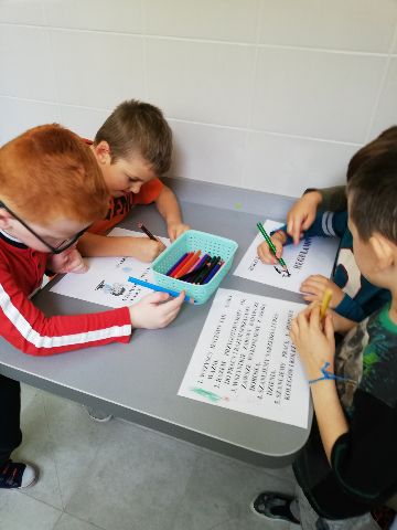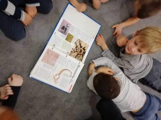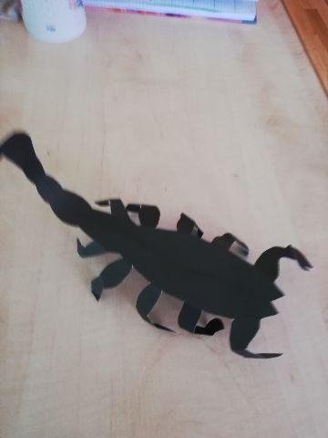 Te wspólne zajęcia rozpoczęliśmy od utrwalenia wiedzy o mieszaniu kolorów - wspólne zabawy z latarkami i folią w zaciemnionej sali projekcyjnej dały jeszcze fajniejsze efekty! Głównym tematem były oczywiście skorpiony - piękne i wcale nie takie straszne jak się o nich mówi. Dzieci zachwyciły się ich budową - a szczególnie nazwami ich części ciała:) Oczywiście skorpiony to pajęczaki i tak jak one noszą swoje dzieci na sobie.....ta informacja też wzbudziła podziw.Na zakończenie, po uzupełnieniu dzienniczków, zrobiliśmy sami swoje własne skorpiony - wyszły zupełnie jak żywe:). Zachęcam do pogłębiania wiedzy o skorpionach. My korzystaliśmy z internetu oraz "Świata Wiedzy". Następne zajęcia zoologiczne to - Zwierzęta polskich lasów.
