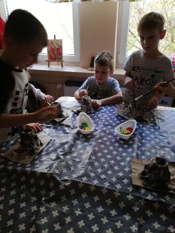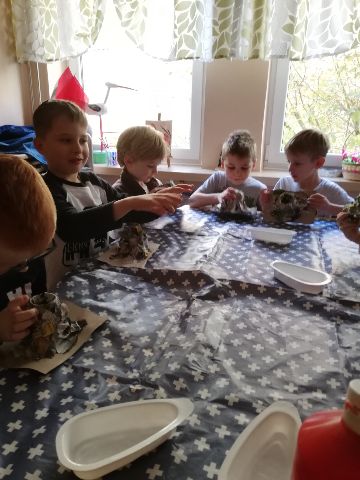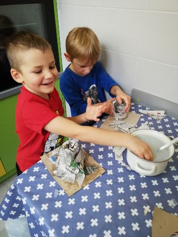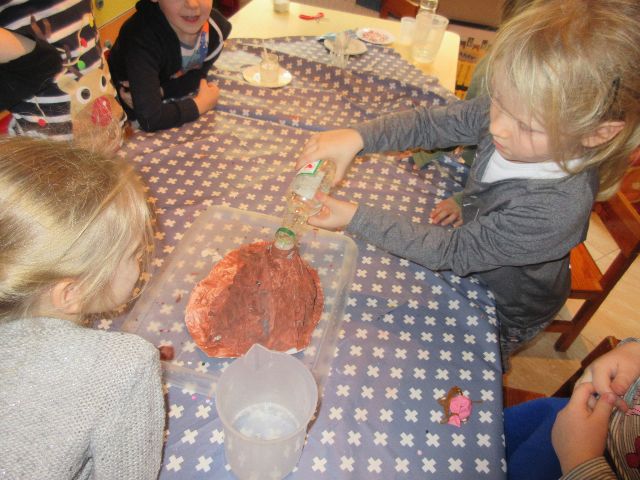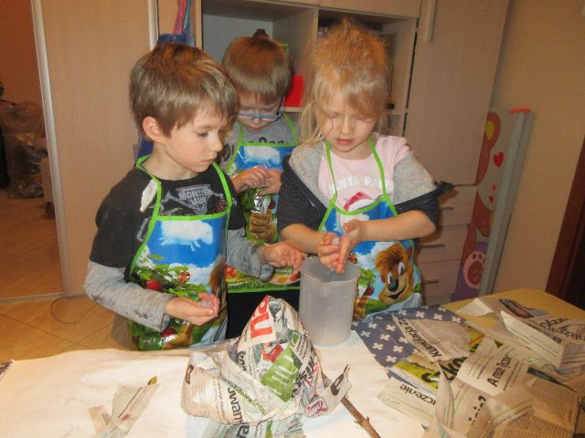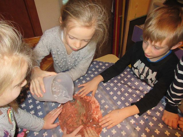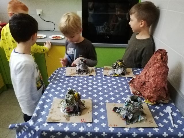 Oczywiście na początku zajęć dokładnie sprawdziliśmy wyniki naszych zabaw z rozpuszczaniem soli i cukru - zachęcam do rozmowy z dziećmi na ten temat i oczywiście obejrzenia zdjęć. Pozostałą część zajęć poświęciliśmy wulkanom. Dzieci obejrzały film. no i do roboty - robimy wulkany a to czasochłonna praca.