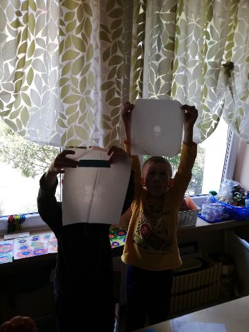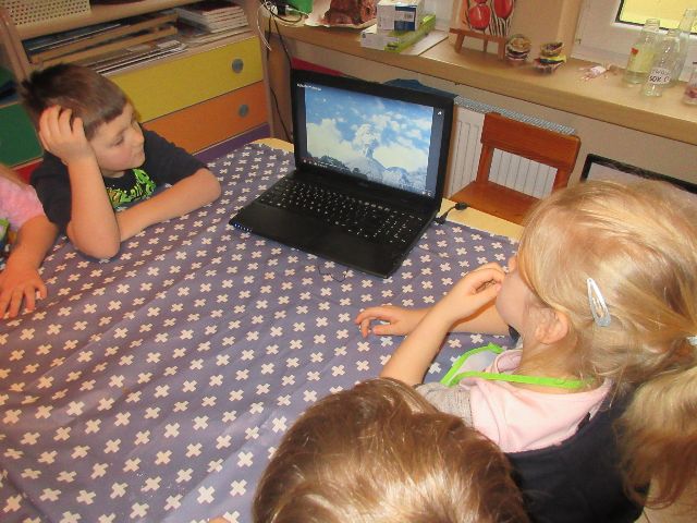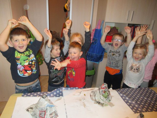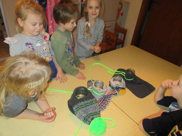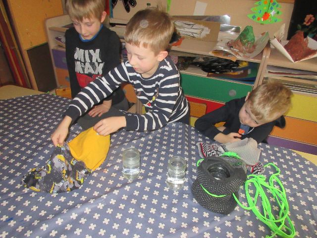 Dlaczego słoiki ubrano w szaliki - czyli jak sprawdzić w którym jest cieplej? Utrzymywanie temperatury - tu powróciliśmy do tematu z ostatnich zajęć, kiedy to dzieci oglądały w powiększeniu różne materiały i samodzielnie doszły do wniosku, że w niektórych materiałach jest więcej powietrza niż w innych. Teraz był czas na to by sprawdzić co to daje? Okazało się, że im więcej powietrza między nitkami, włóknami to materiał dłużej utrzyma ciepło. Najcieplejsza woda była w słoiku w wełnianym szaliku:). Temperaturę mierzyliśmy metodą 3 sekund - trochę znaną w kuchni. Czyli palec do słoika.....Głównym jednak tematem tych zajęć było zjawisko elektryzowania się, co wykorzystaliśmy do dekoracji naszej salki.No i najważniejsze - wybuch wulkanu!
