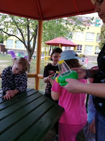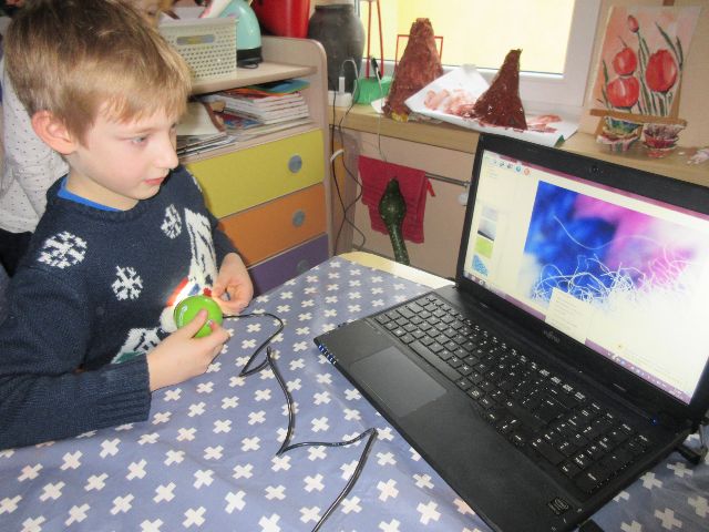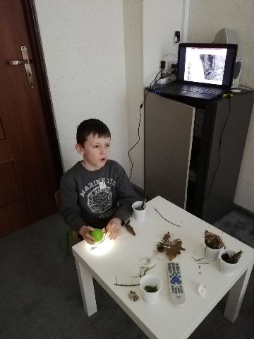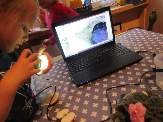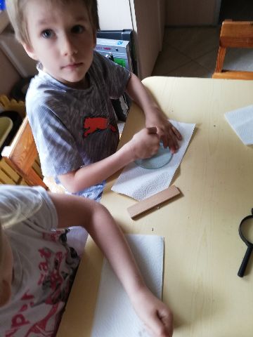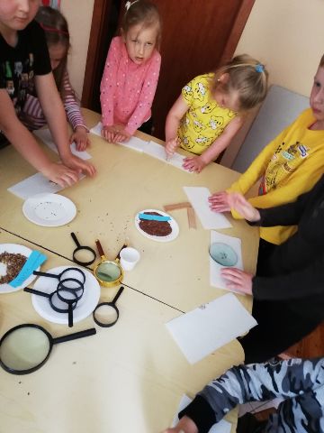 Zajęcia z badaczami z grupy V, były również fascynujące. Starsze dzieci zwróciły większą uwagę na budowę mikroskopu. Z zapałem przeglądały materiał badawczy. No i oczywiście bardziej wtajemniczone w wiadomości ze świata, dopytywały się czy można zobaczyć koronowirusa. Po zajęciach wszyscy dokładnie umyli ręce!