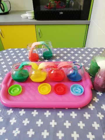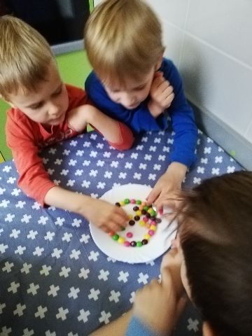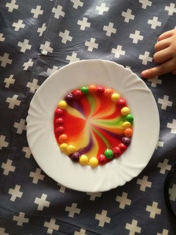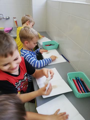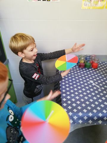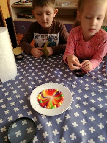 Te zajęcia to ulubiona część badawcza wszystkich dzieci - bawimy się kolorami i to nie tylko tymi z farb, ale także poszukujemy odpowiedzi jak to się dzieje, że liście zmieniają kolory (bystre dzieciaki szybko odszukują przyczynę tych zmian w parowaniu: czyli schnięciu liści). Z wielką łatwością wyciągają wnioski - dzieci już wiedzą, że woda paruje zarówno ciepła jak i zimna - do tego tematu wrócimy przy okazji zjawiska sublimacji czyli zimą. Przy okazji zabaw z kolorami przeprowadzamy zabawę z kolorowymi cukierkami - piękna tęcza która powstaje podczas tego doświadczenia to dowód na dużą zawartość barwników - czy dzieci wyciągnęły właściwe wnioski? Warto o to zapytać!
