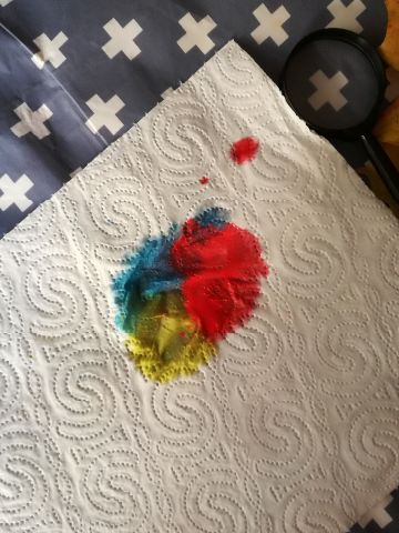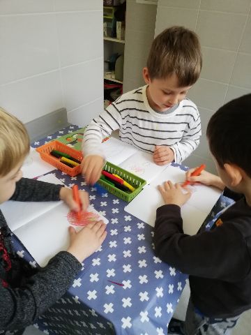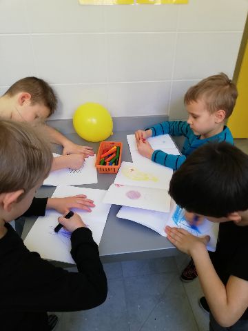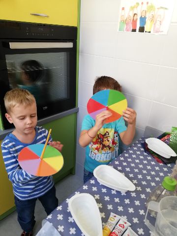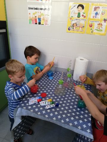 W tych zajęciach wzięły udział dzieci z grupy IV. Od dzisiejszego dnia część badawcza będzie podzielona na dwie grupy - tak też w kolejną środę zajęcia będą mieli chłopcy z grupy V i kolejne wspólne - część zoologiczna połączona z wymianą doświadczeń, wniosków z części badawczych. Na dzisiejszych zajęciach wykonaliśmy kilka interesujących ćwiczeń pokazujących co się dzieje gdy łączymy ze sobą różne kolory - oczywiście wybraliśmy różne do tego sposoby!