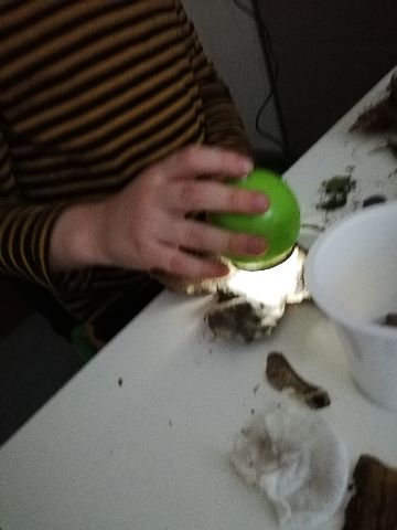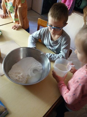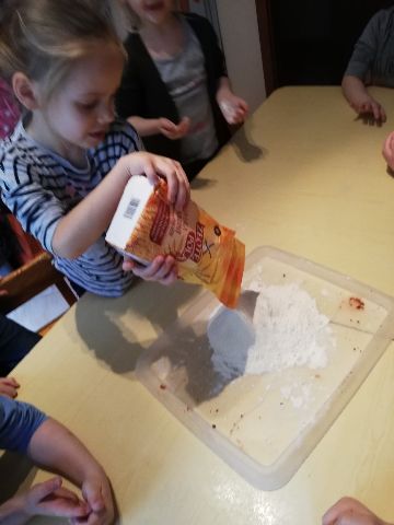 Te zajęcia obfitowały w przygody. Tak, tak - na zabawach badawczych czasami zjawiska uciekają spod kontroli. Co robiliśmy - symulację uderzenia meteorytu. Chcieliśmy sprawdzić czy rzeczywiści unoszący się pył mógł zasłonić słońce na długo i czy uda nam się zrobić tornado? Oj udało się, udało. W sprzątaniu sali i szatni musiały nam pomagać panie:Beatka, Kasia i pani Edytka - dziękujemy! A wykorzystana mąka z pewnością dotarła aż do domów:)