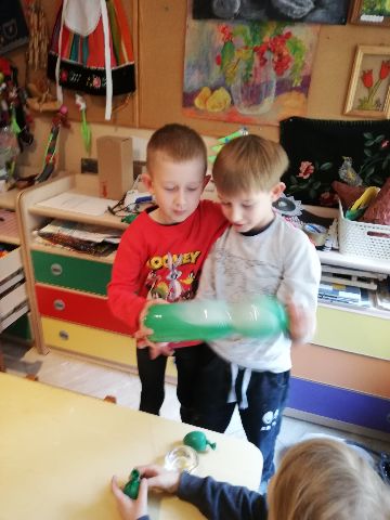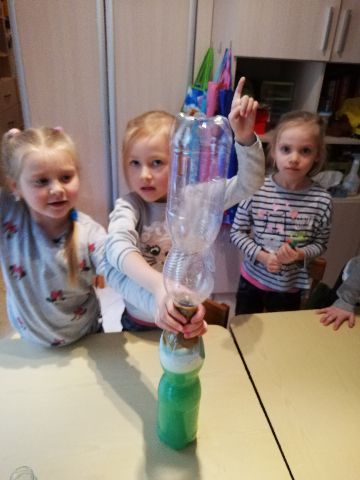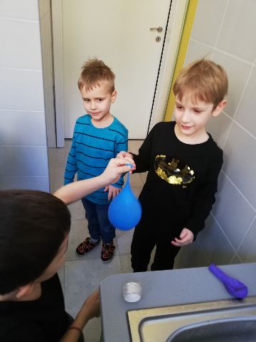 Zajęcia oczywiście zaczęły się od powtórki czyli - kompasy. Każdy zrobił swój własny kompas który można wykorzystać na przykład na....kałuży. Na tych zajęciach powróciliśmy także do reakcji które powstają podczas mieszania octu i sody (nasze wulkany). Jak dzieci pamiętają powstały gaz powodował pienienie się cieczy czyli wybuch wulkanu. My wykorzystaliśmy to zjawisko powstawania CO2 do nadmuchania balonów. Badacze doskonale pamiętali podobne doświadczenie kiedy balonik napełnił się gdy podgrzaliśmy powietrze w butelce.