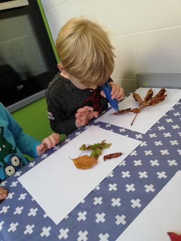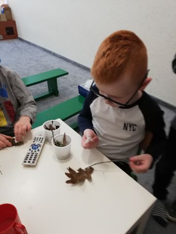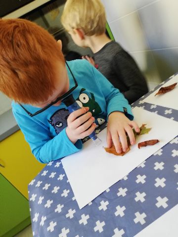 Tak jak dzieci są różne tak i nasze zajęcia chociaż z założenia mają taką samą tematykę to i tak są inne i niepowtarzalne. To spotkanie zainspirowane zostało przez garstkę liści pozostawioną przez kogoś w naszej salce. No i oczywiście musieliśmy porozmawiać o tym dlaczego spadają, dlaczego schną i dlaczego zmieniają kolory. Oglądaliśmy je przez mini mikroskopy i chociaż "mini", to doskonale było można zobaczyć budowę liści i tych jeszcze mokrych i tych suchych. Chłopcy wspaniale wyciągali wnioski.Brawo! Zajmowaliśmy się mieszaniem kolorów - podobnie jak poprzednia grupa, ale dodatkowo oglądaliśmy je wykorzystując latarki - podświetlaliśmy kolorowe folie, nakładając na siebie różne kolory. Kolejne zajęcia będą wspólne - będzie o czym rozmawiać. Chłopcy z grupy V zaprezentują kolegom z grupy IV - badania z mikroskopami i zabawy z latarkami. No i oczywiście SKORPIONY.