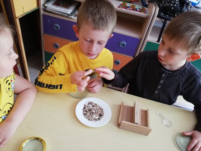 Te zajęcia poświęciliśmy na badania niepozornych nasion, znanych dzieciom z życia codziennego. Badaliśmy nasiona: siemię lniane, słonecznik, papryka, winogrona. Oczywiście dzieci jednogłośnie oceniły nasiona jako martwe. W takim razie co powoduje, że można je ożywić? Nasiona poddaliśmy ciężkiej próbie, sprawdzając jakie substancje się w nich znajdują (można zobaczyć to na zdjęciach). Na wszystkich ręczniczkach powstały plamy tak, tak tylko czy aby była to woda? Badacze uznali, że łatwo to sprawdzić susząc nasze ręczniczki a pogoda nam dopisała:) Wiadomo było, jeśli woda to ręczniczki wyschną jeśli coś innego to co się stanie? No i cóż? Na wszystkich ręczniczkach pozostały plamy. Mateusz szybko podpowiedział - przecież tylko tłuszcz nie wyschnie, nawet przy zmywaniu naczyń trzeba wykorzystać płyn bo samą wodą się go nie zmyje i nie spierze. Brawo!!! I już wszyscy wiedzą, że substancją która pomaga przetrwać nasionom