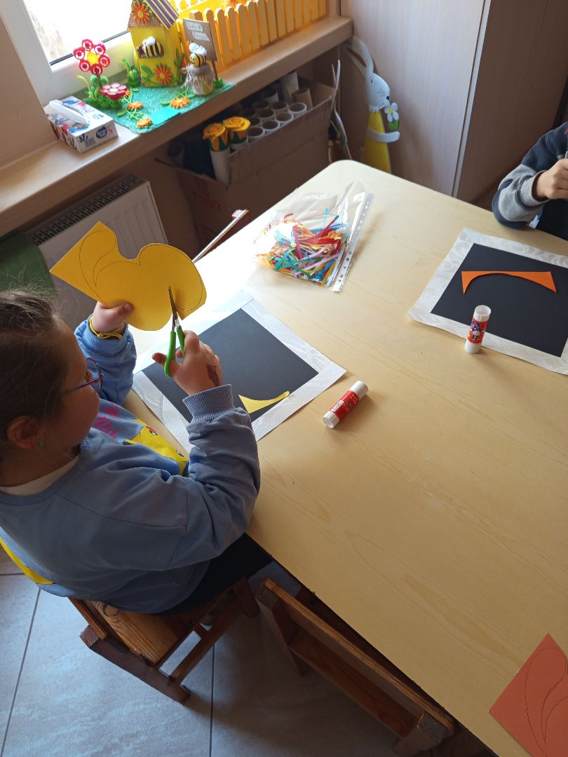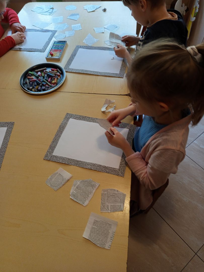 Na ostatnich zajęciach dzieci wykonały pracę techniką mieszaną. Wykorzystały pastele olejne oraz technikę zmywania tuszu co wpłynęło na dodatkowe walory artystyczne pracy.