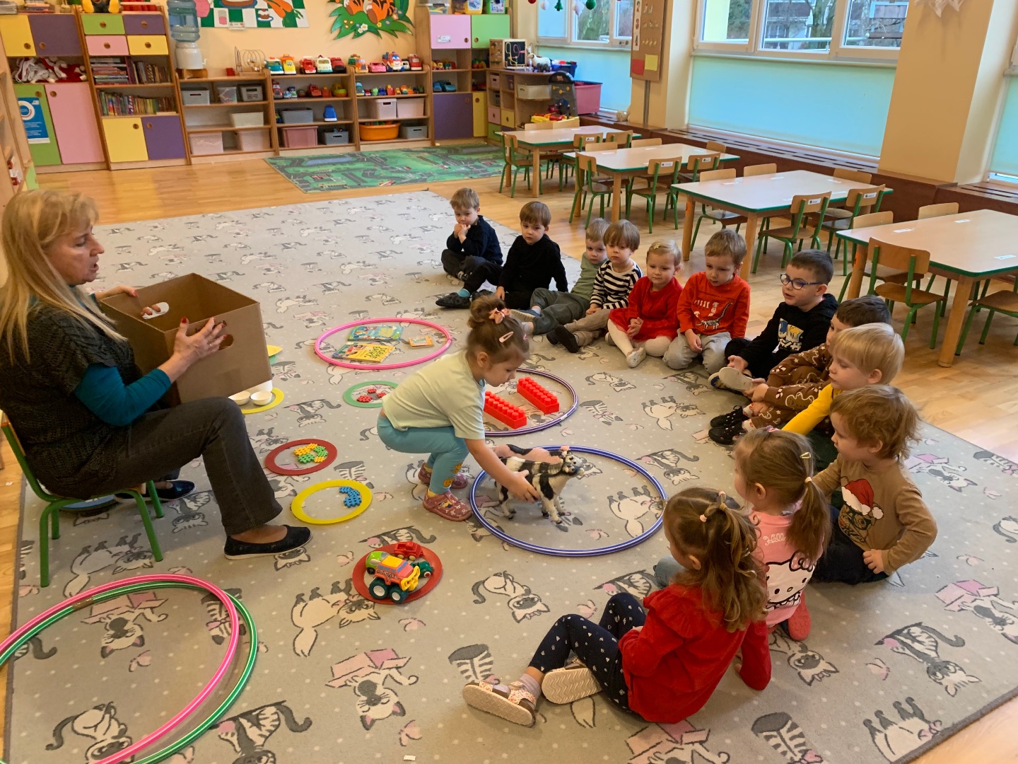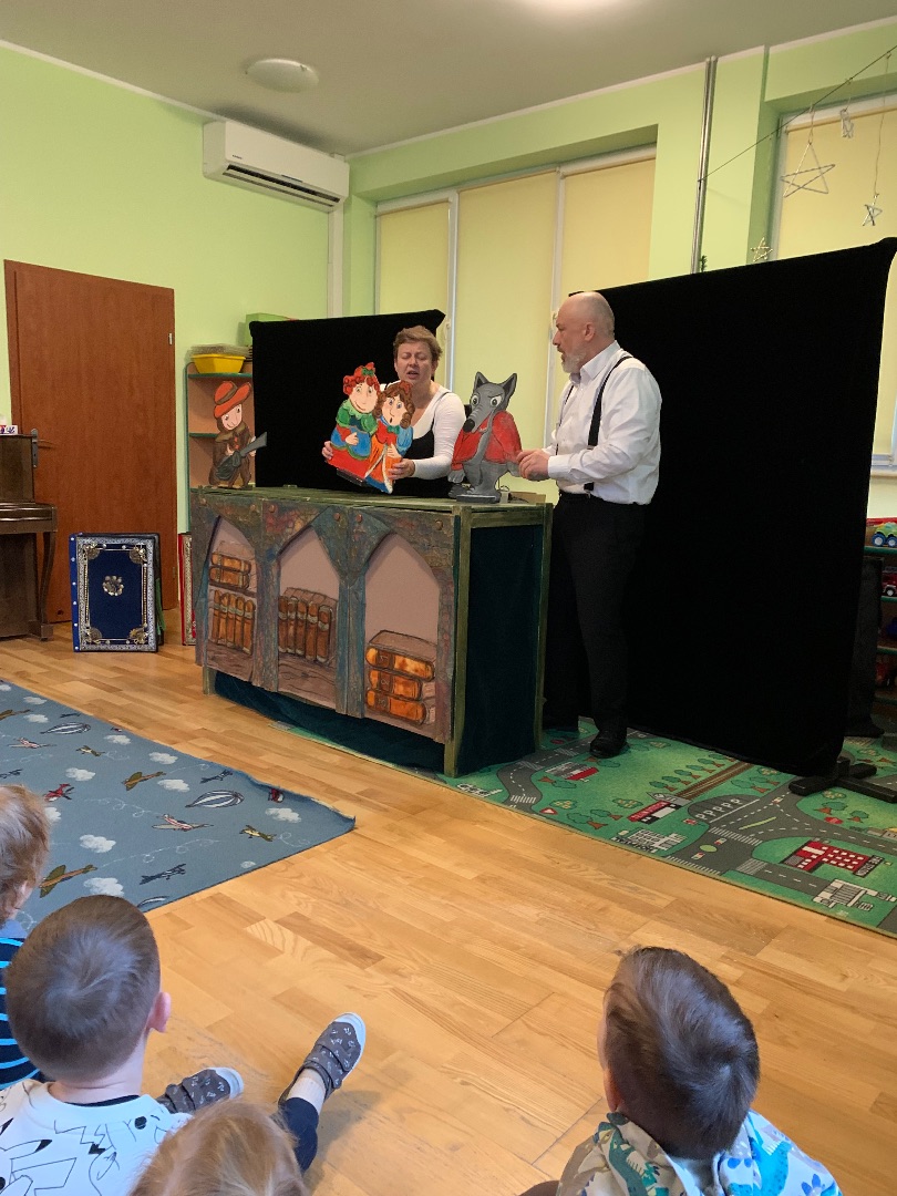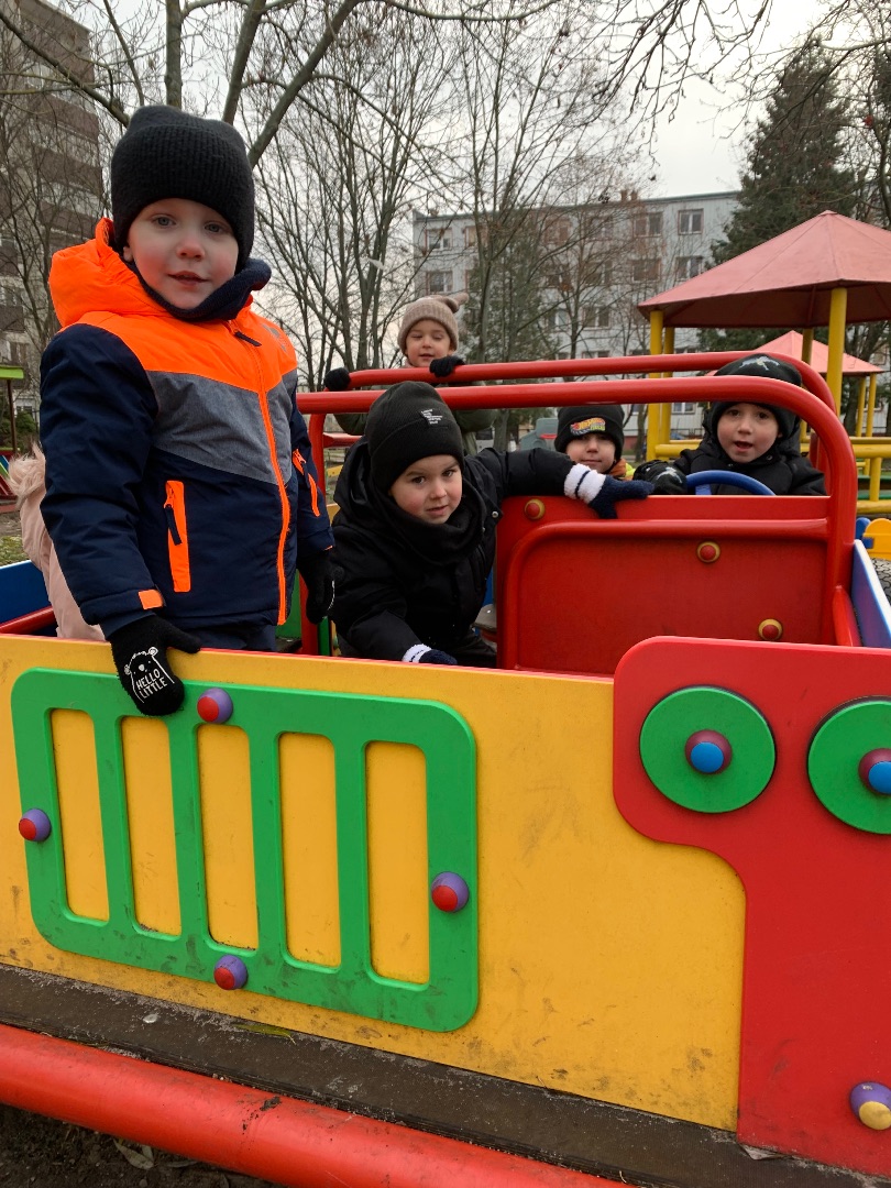 W tym tygodniu, trochę burym i zimnym, dowiadywaliśmy się co też wiewiórka, jeż i niedzwiedź porabiają zimą i jak się do niej przygotowują. Wśród nas są też aktorzy, którzy chętnie wcielali się w rolę Wiewiórki co po lesie biegała, orzechów szukała a jak nosek jej marzł to w dziupli od dzięcioła ogrzewała łapki i na krótkie drzemki zapadała; Jeża co smacznie spał w liściach i wielkiego Niedzwiedzia co sapał i chrapał i na boczku spał w swojej gawrze. Bawiliśmy się z Pajacykiem Fik Mikiem a także wybieraliśmy się na Leśny spacer z kamlotkami. Rzecz jasna braliśmy też udział w dwujęzyczności.